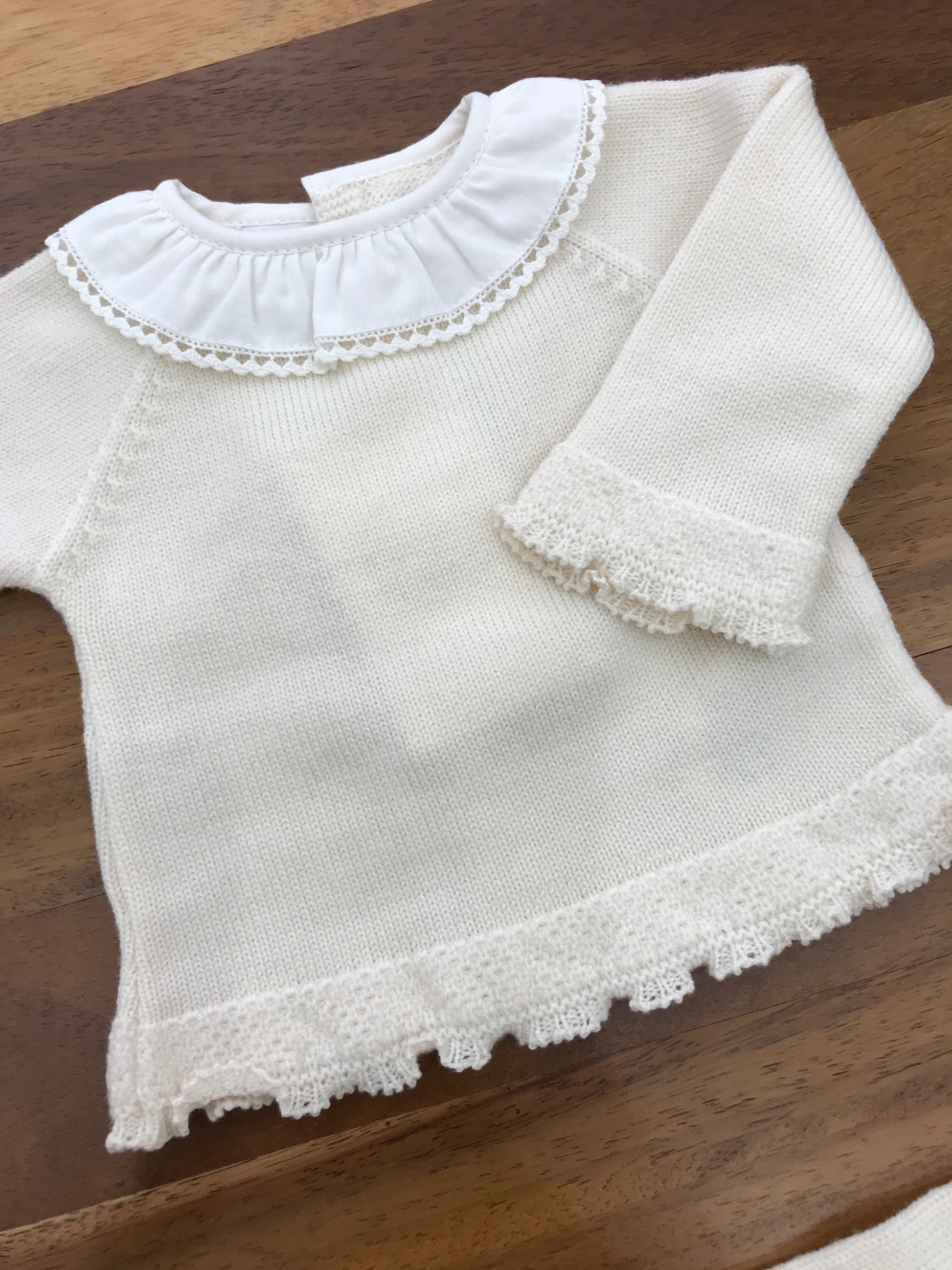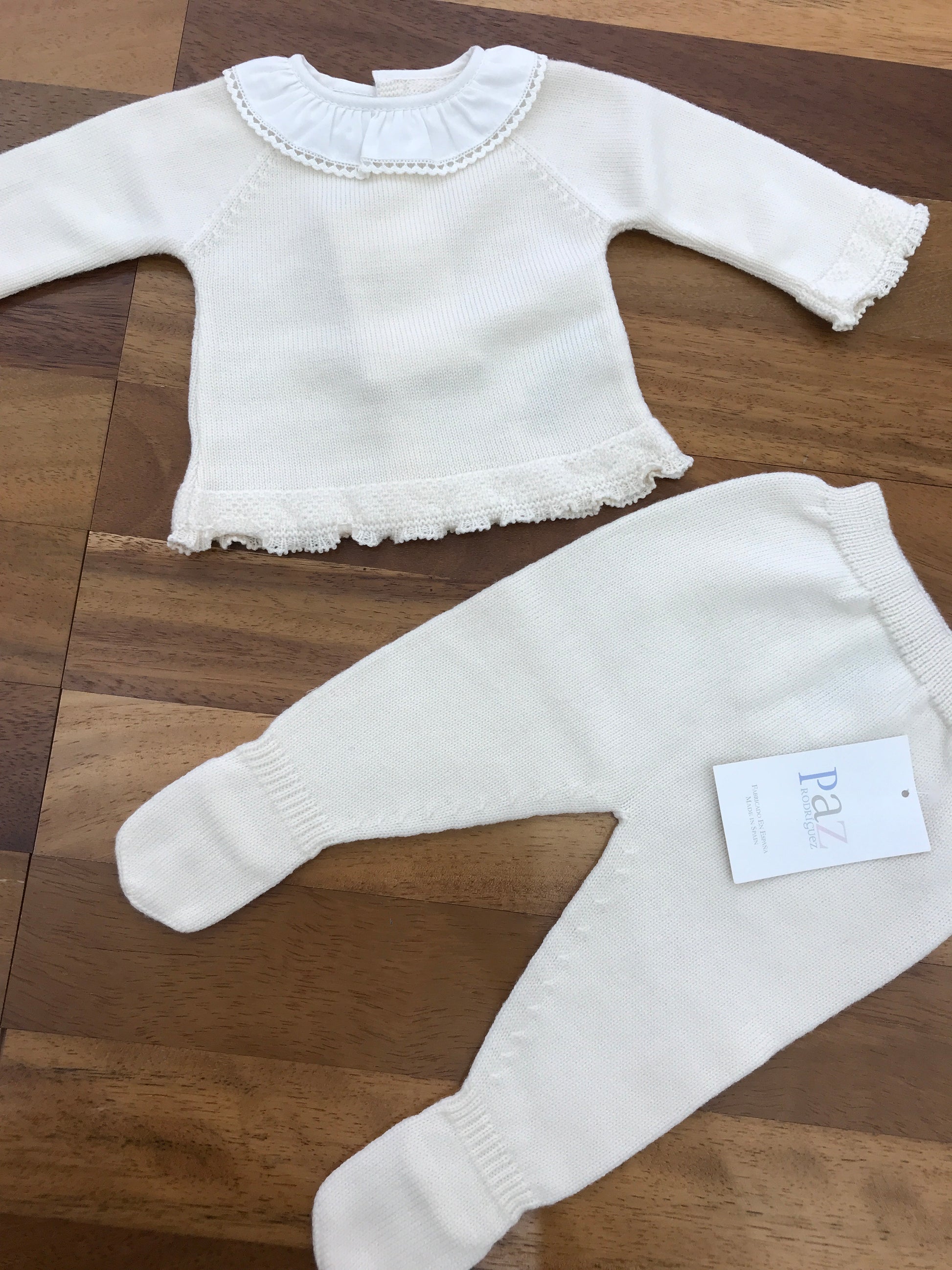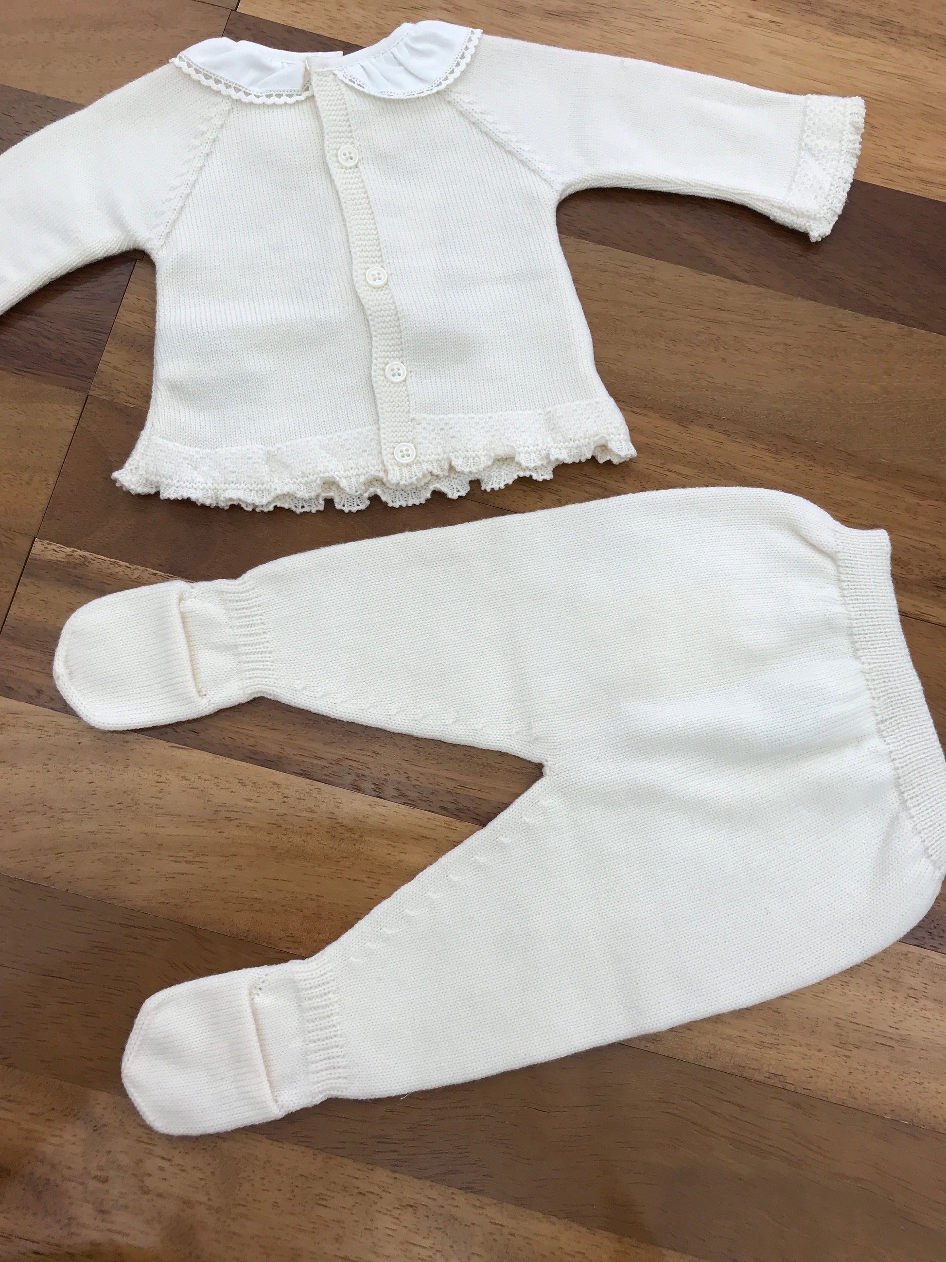 Completo due pezzi in lana composto da una parte inferiore con copripiedi e una superiore caratterizzata da un colletto ricamato, dettagli ricamati sui bordi delle maniche e una finitura lavorata a maglia.