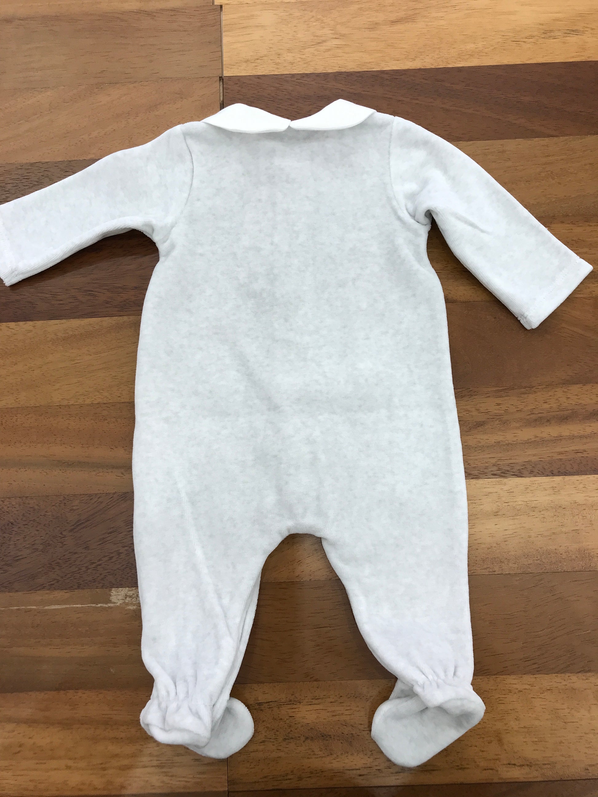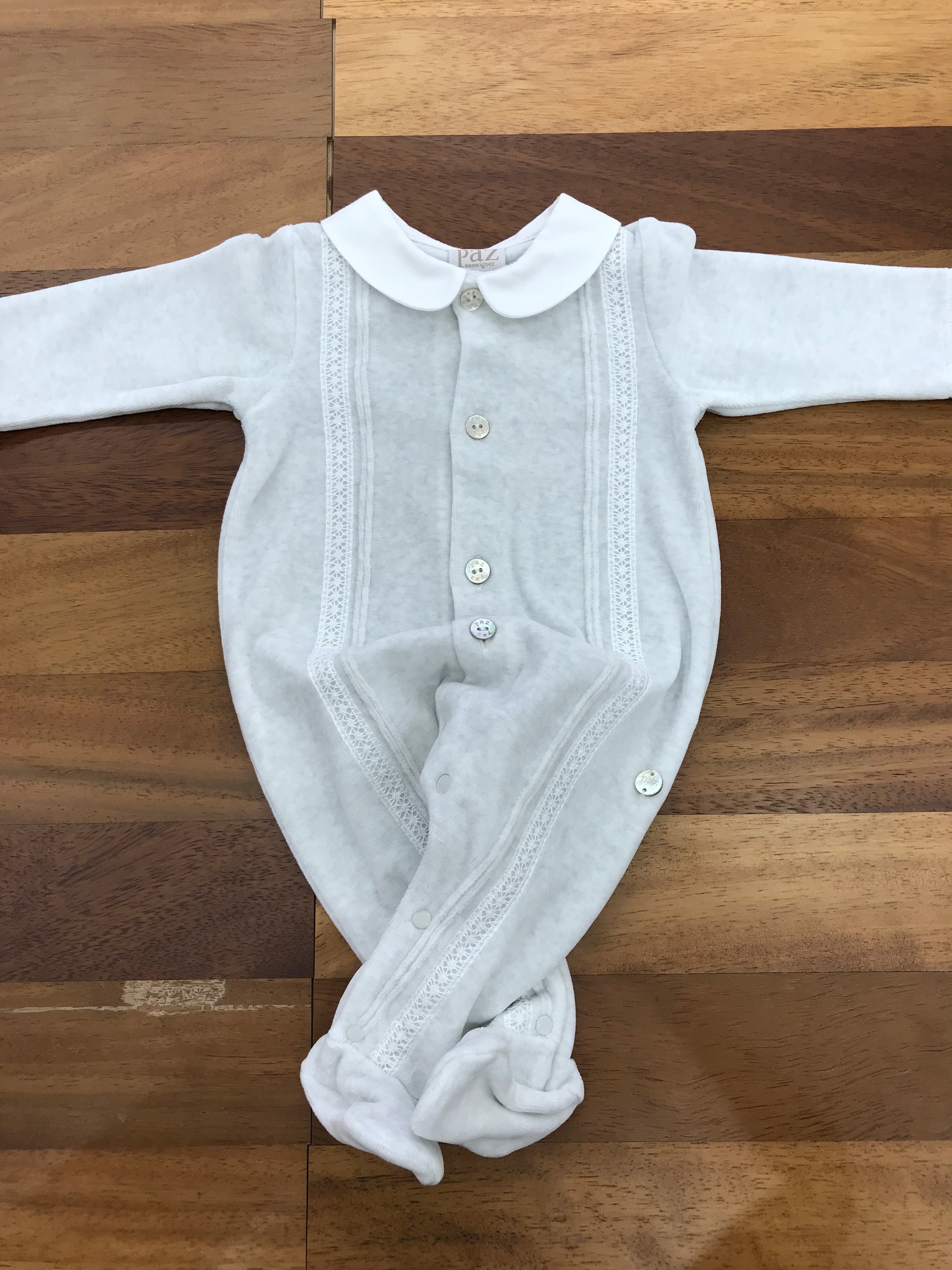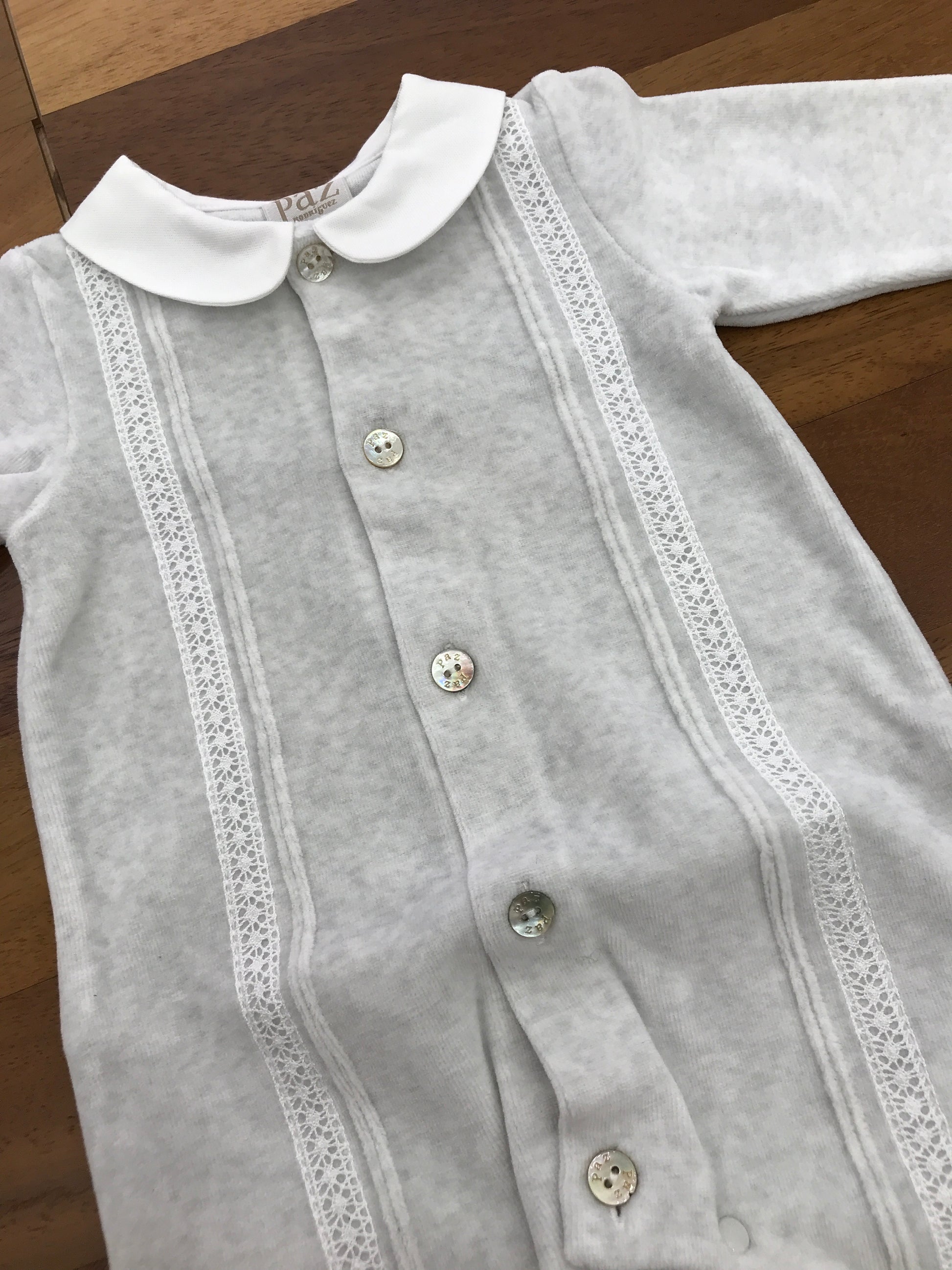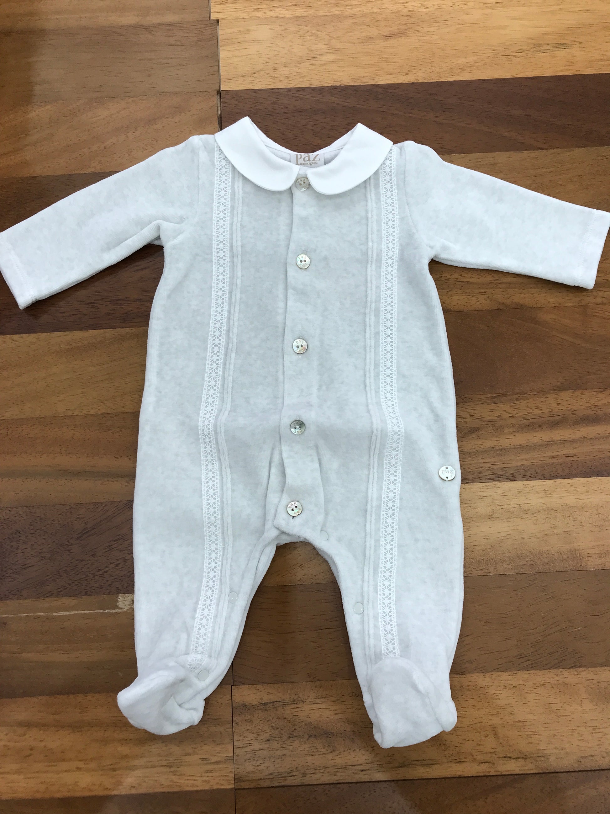 Questa tutina intera in ciniglia è dotata di piedini integrati e un elegante colletto, arricchita da un raffinato merletto ricamato lungo i lati, che aggiunge un tocco di delicatezza e stile al capo. Perfetta per garantire comfort e calore, unendo funzionalità e design sofisticato.