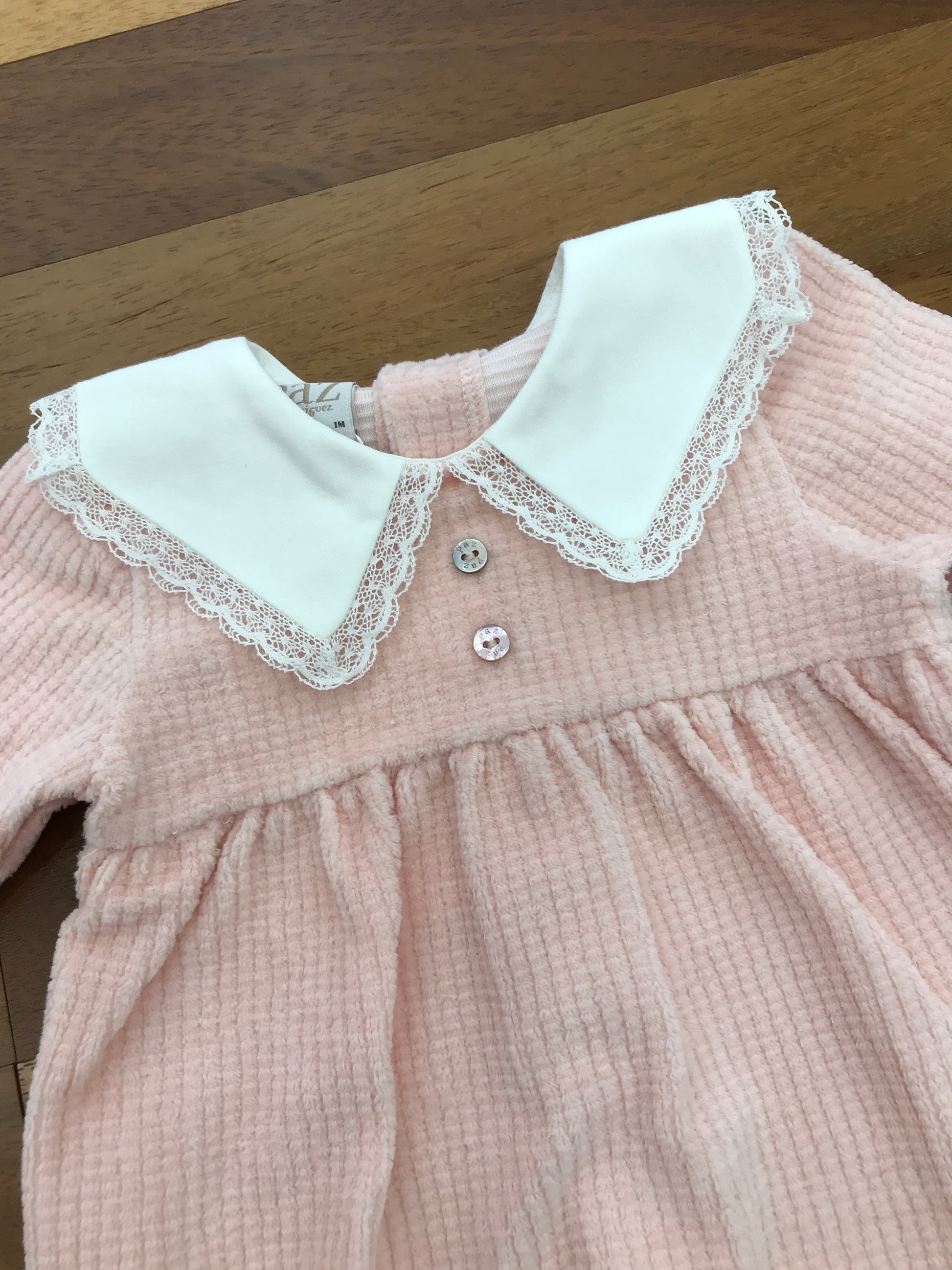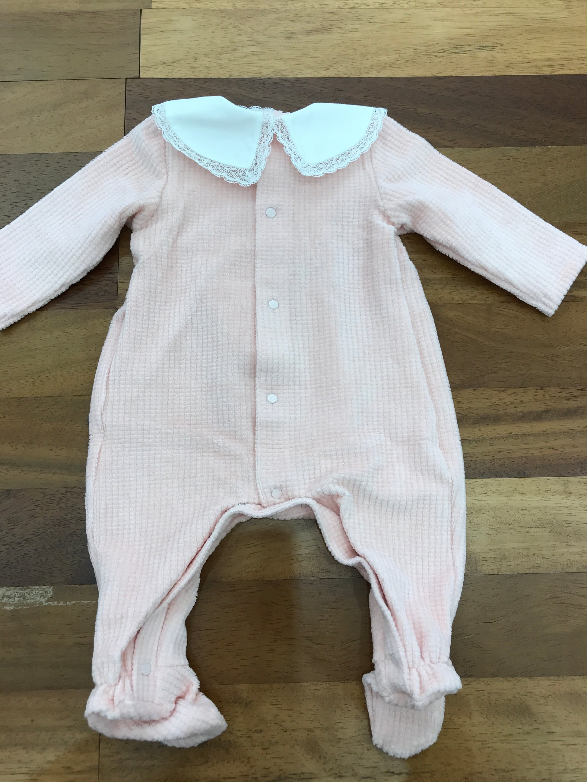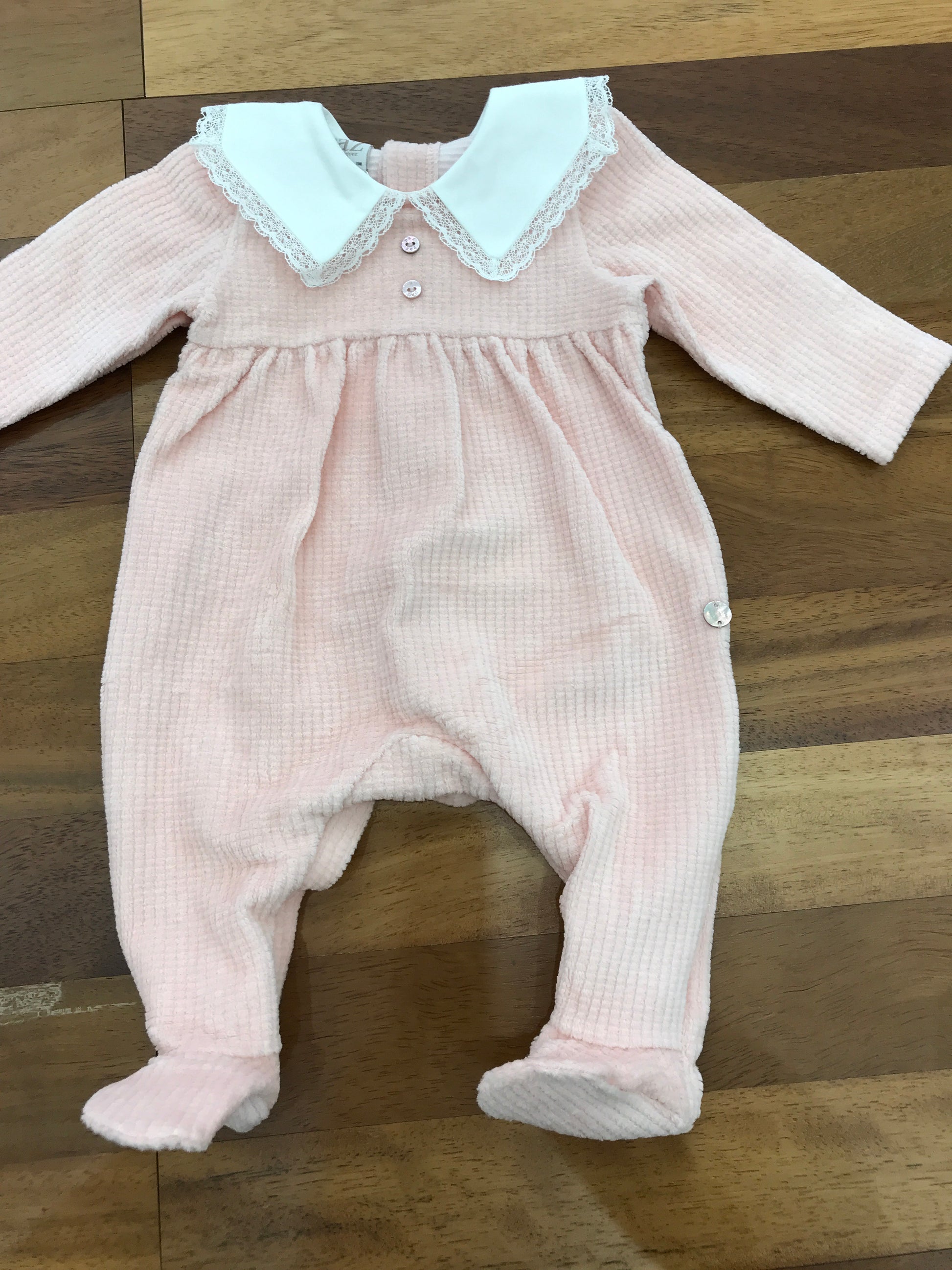 Questa tutina intera in ciniglia è dotata di piedini integrati e un colletto a punta con merletto, completata da una trapuntatura che ne garantisce comfort e calore.