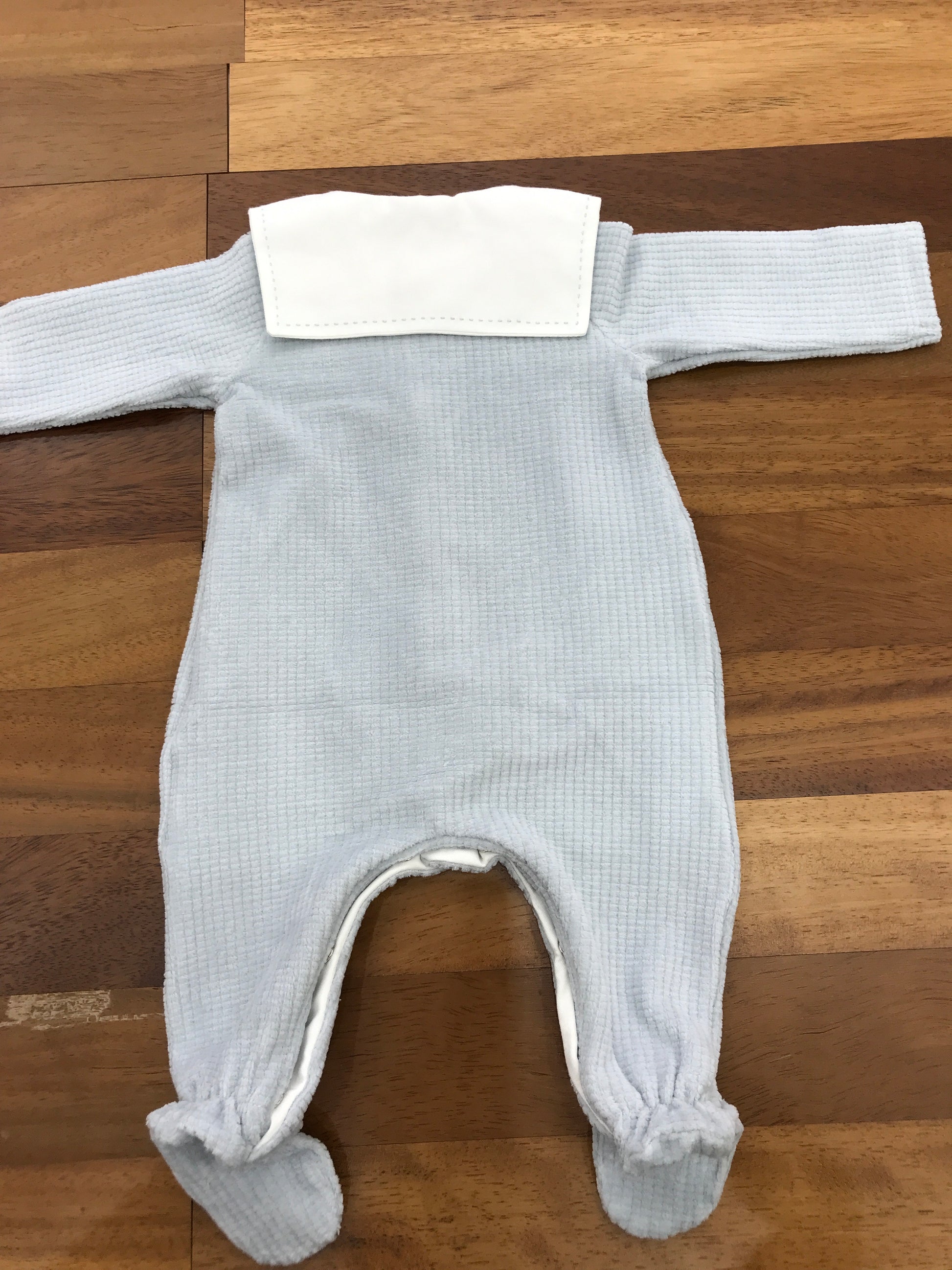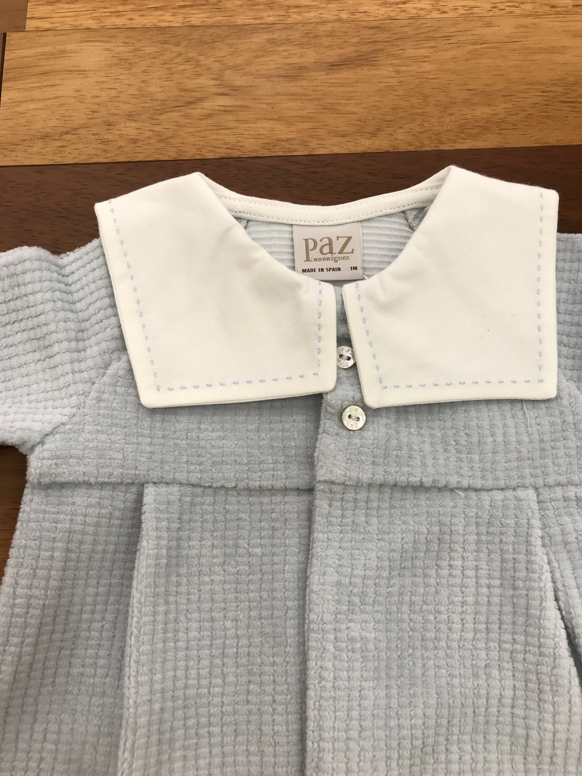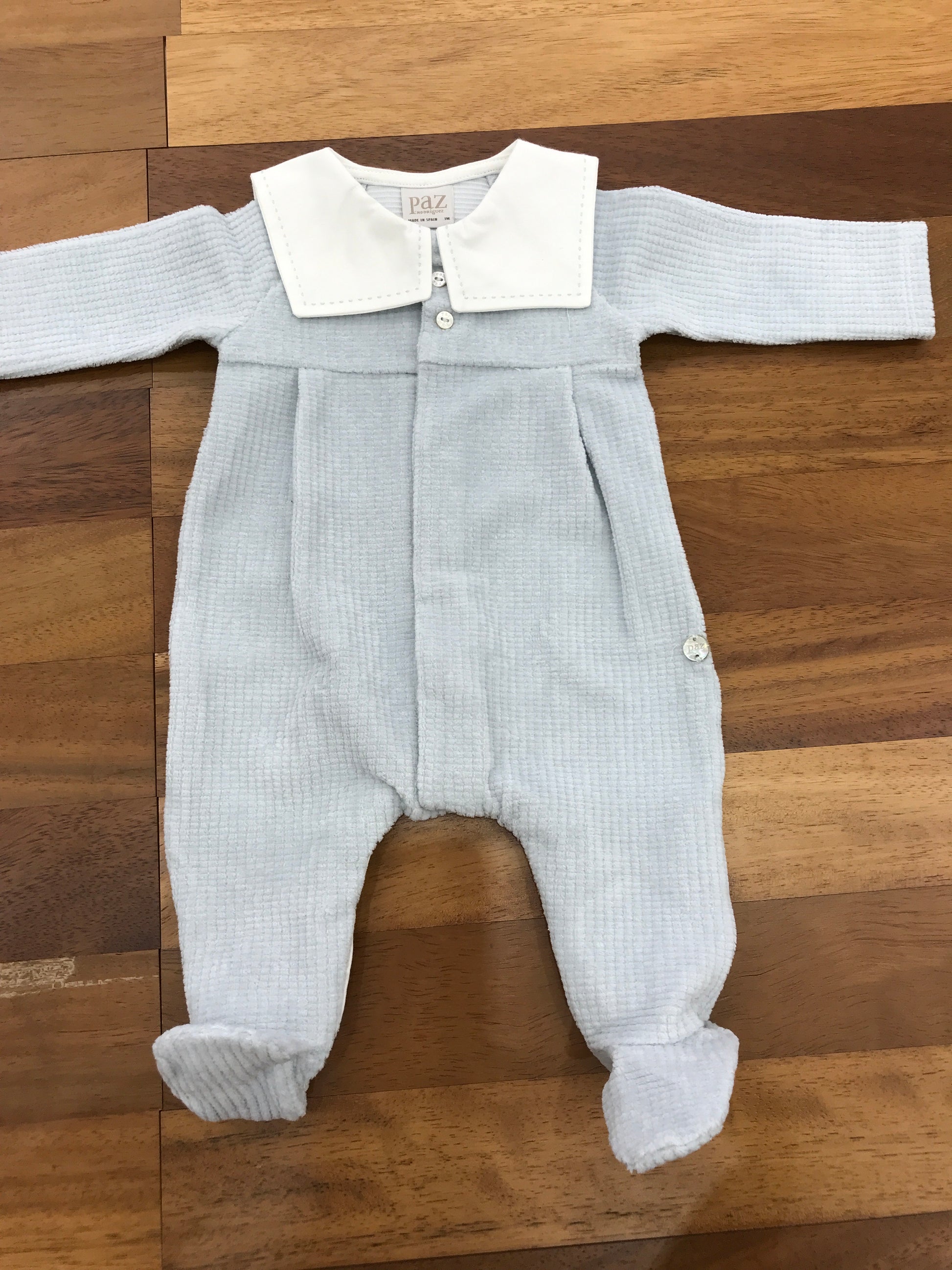 Questa tutina intera in ciniglia con piedini e colletto è trapuntata per garantire comfort e calore. Il colletto è impreziosito da un delicato ricamo in filo celeste, che aggiunge un tocco di eleganza al capo.