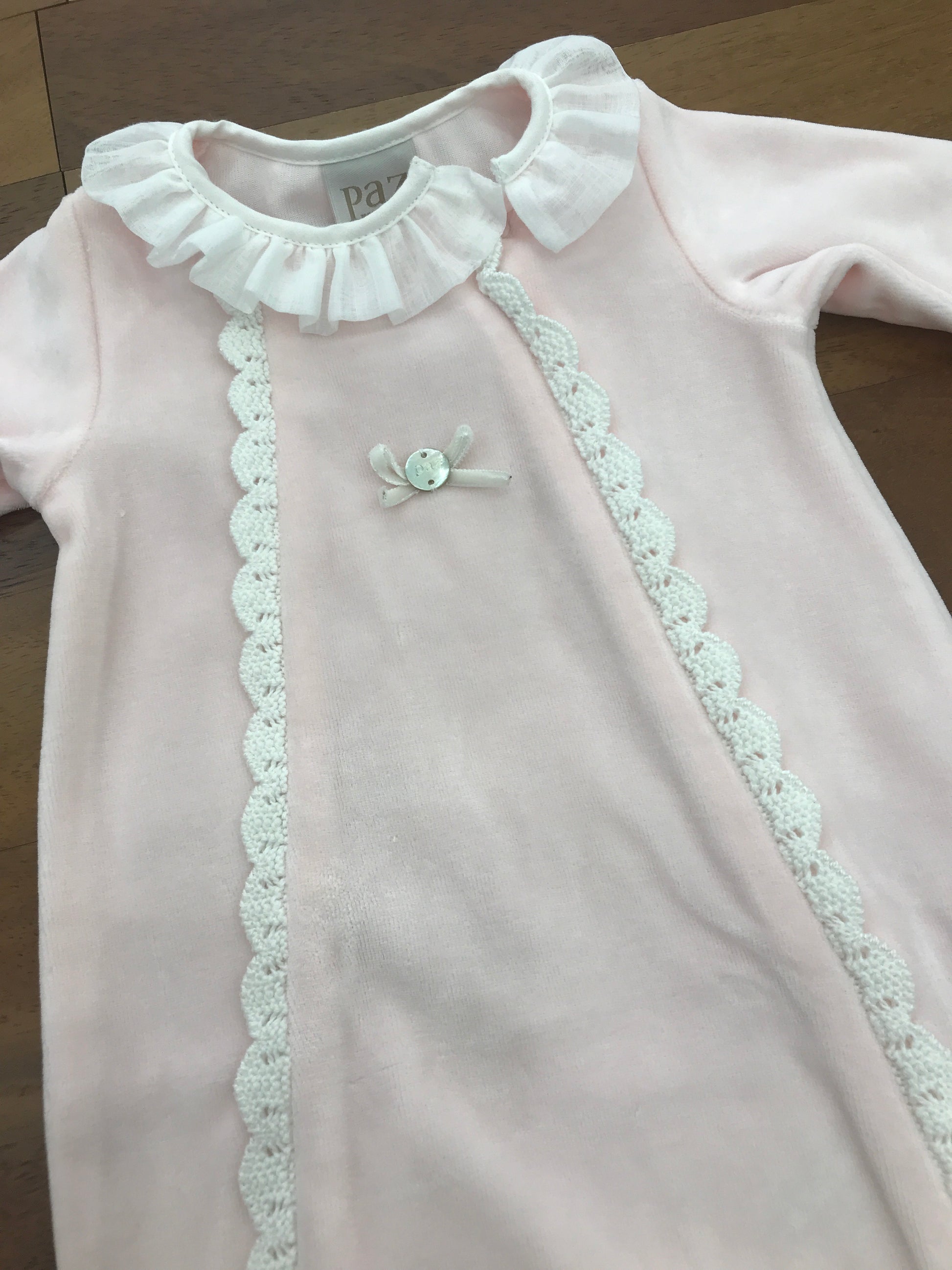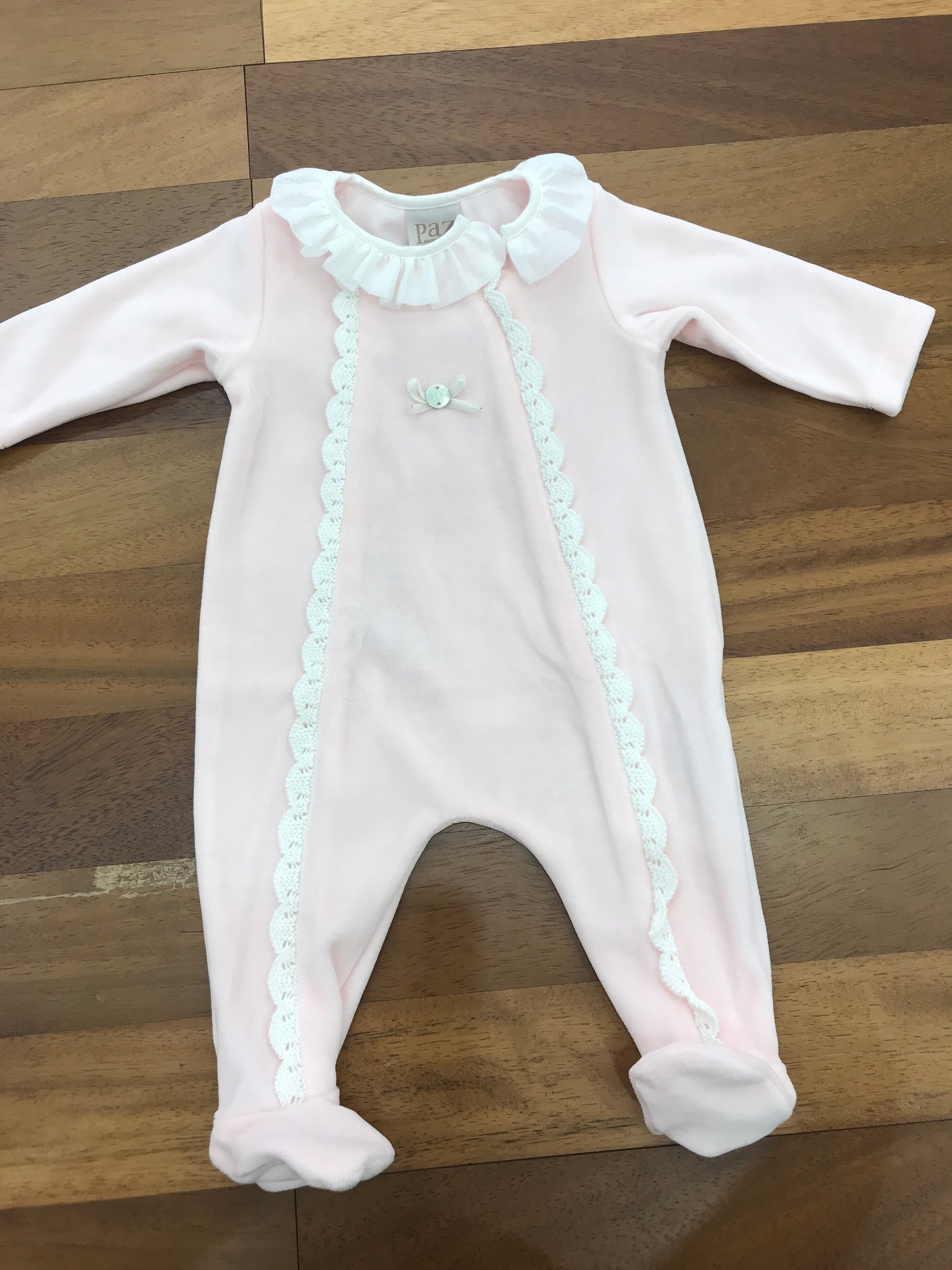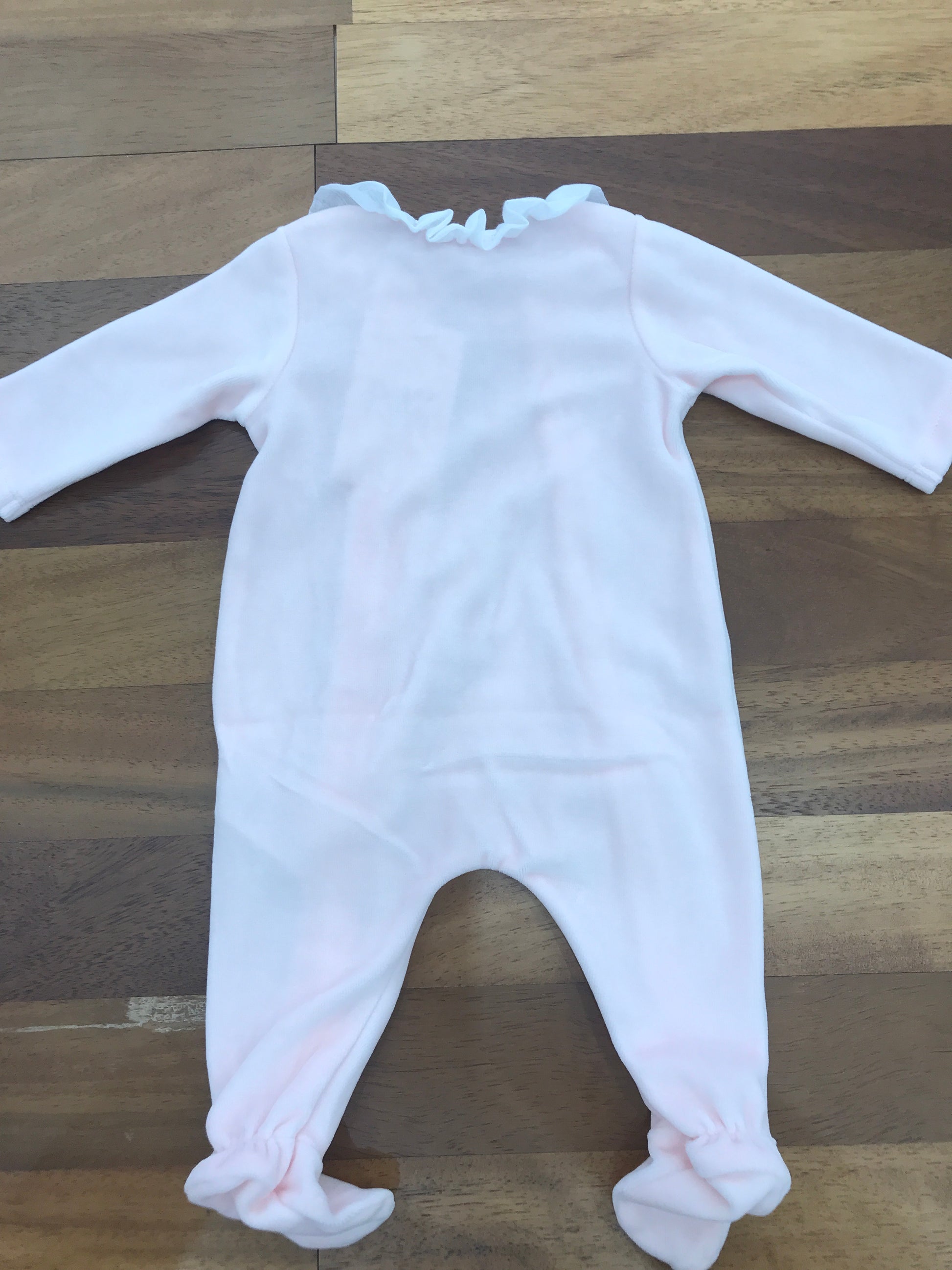 Questa tutina intera in ciniglia è progettata con piedini integrati per garantire comfort e calore al bambino. Il colletto bianco aggiunge un tocco di eleganza, mentre le due linee centrali ricamate in bianco traforato conferiscono un dettaglio raffinato e distintivo, rendendo il capo ideale per occasioni speciali o per un uso quotidiano di qualità superiore.