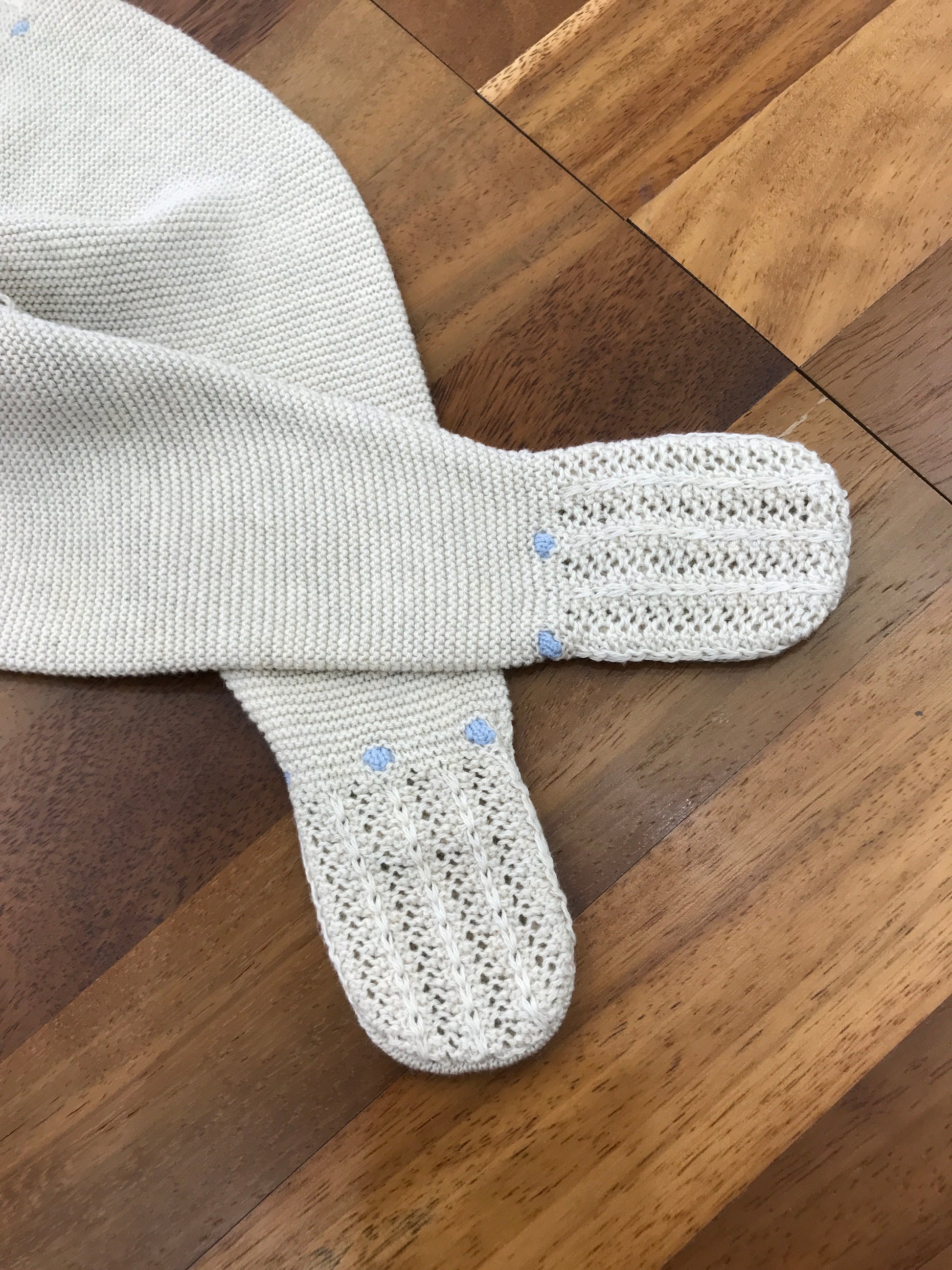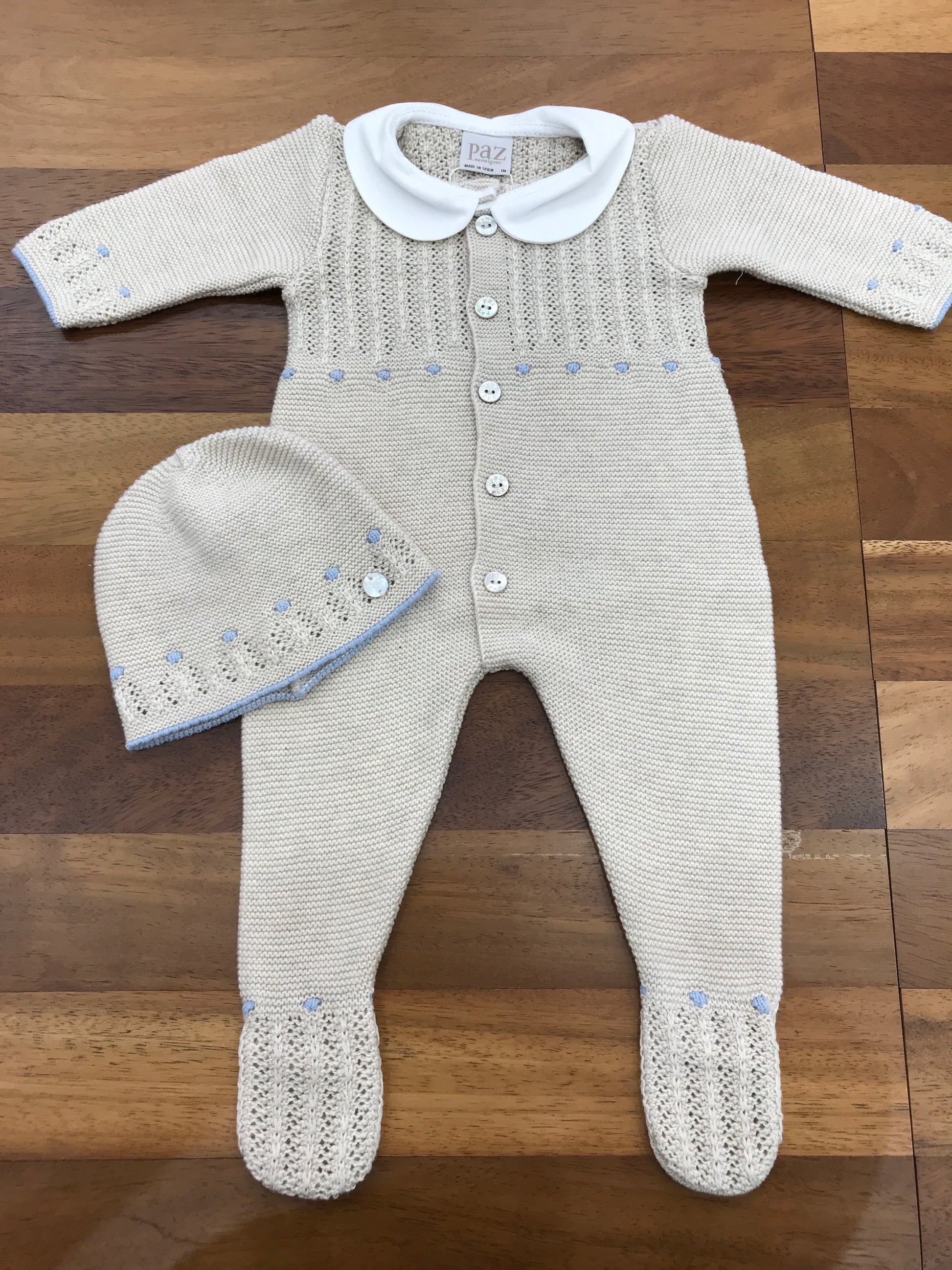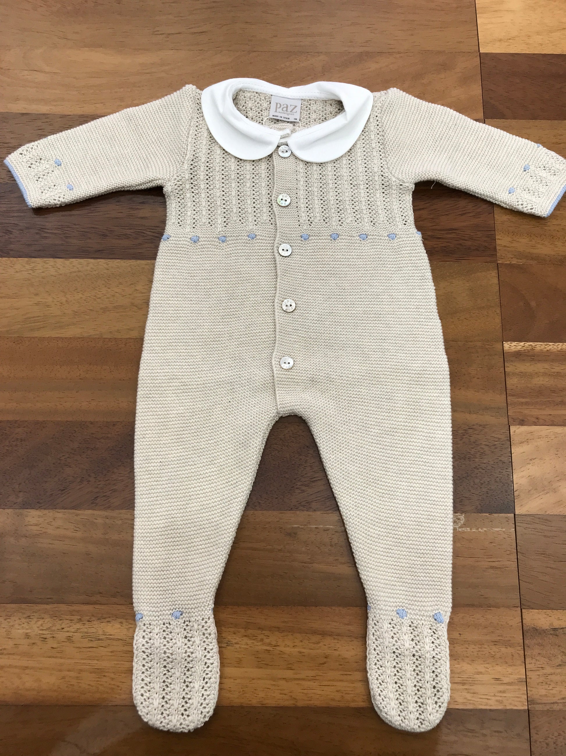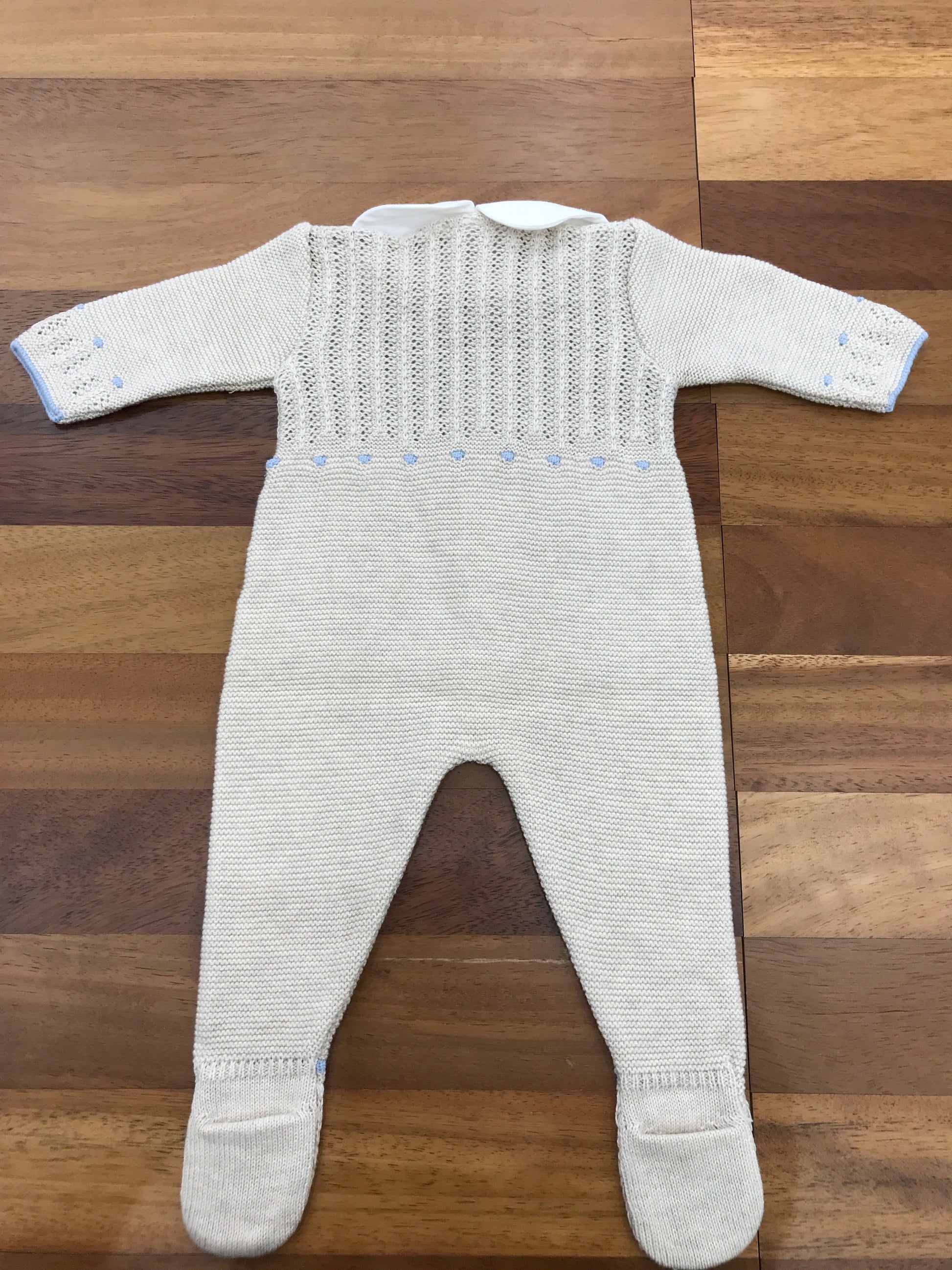 Questa tutina completa in lana presenta piedini e colletto, arricchita da ricami celesti e delicati trafori al centro, sui piedini e sui polsi delle maniche. La chiusura è garantita da bottoncini, assicurando praticità e comfort.