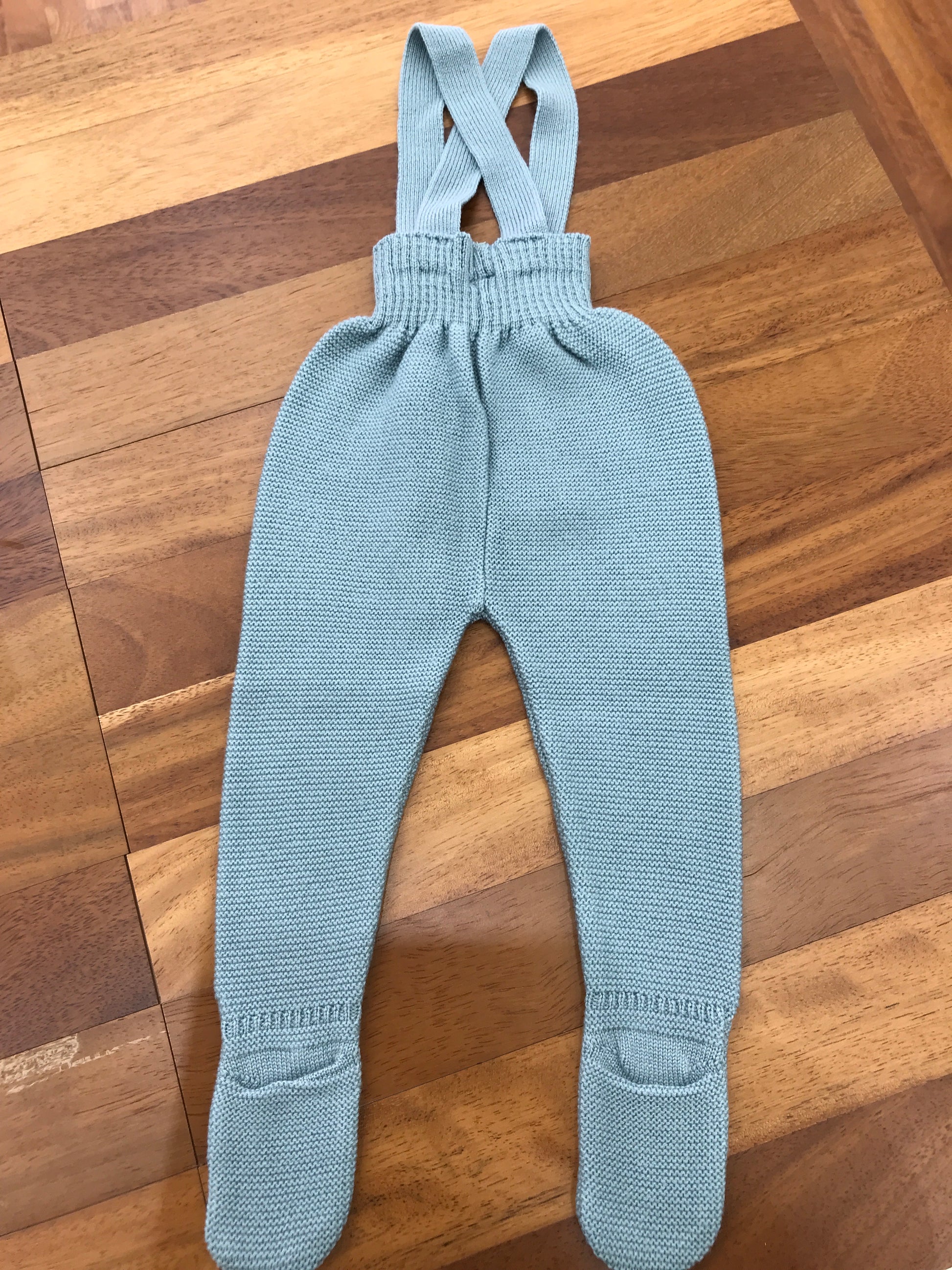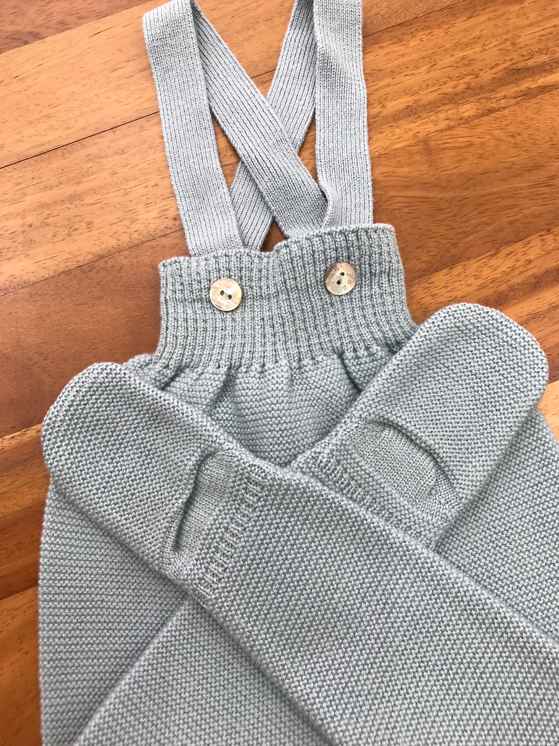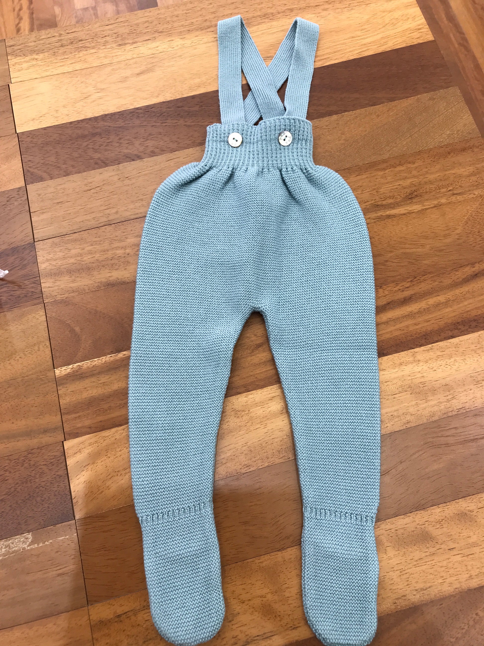 Salopette in lana con gambe lunghe e piedini integrati, dal design essenziale. Presenta due piccoli bottoni per la chiusura delle spalline, garantendo praticità e comfort.