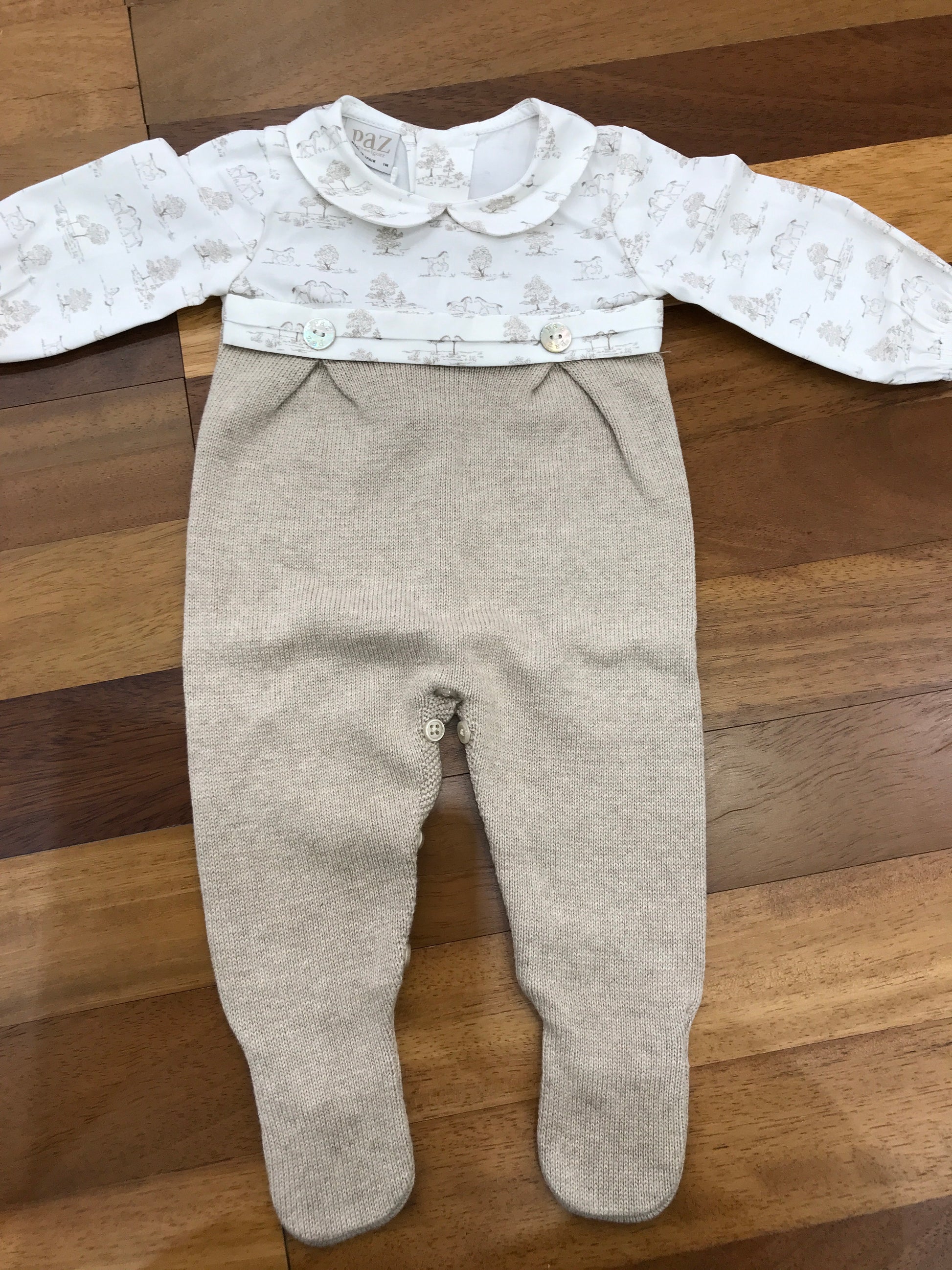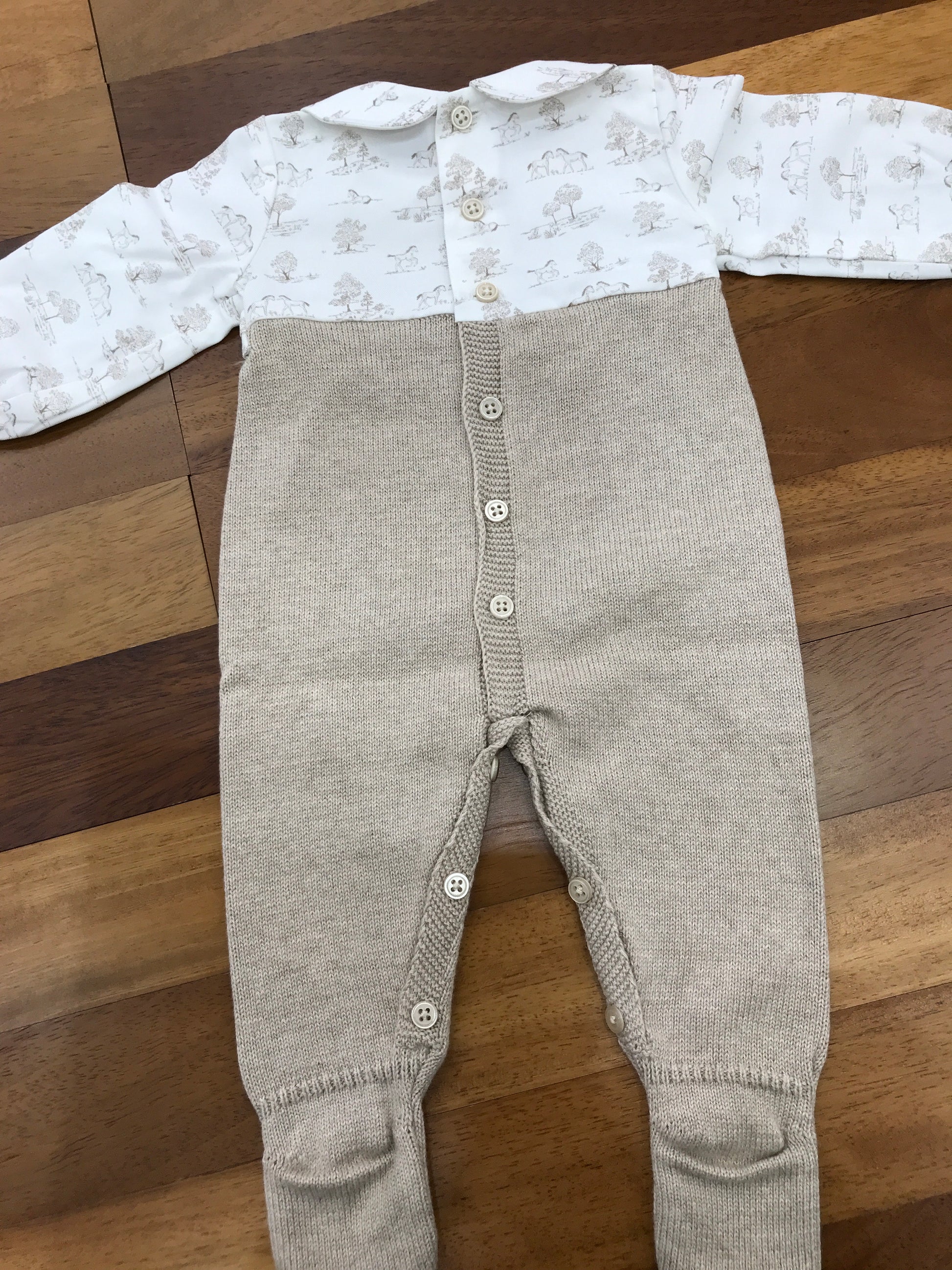 Questa tutina in lana a corpo unico include piedini integrati, presenta maniche arricciate e un colletto elegante. La parte superiore è decorata con motivi di animali e alberi, unendo comfort e stile raffinato per i più piccoli.