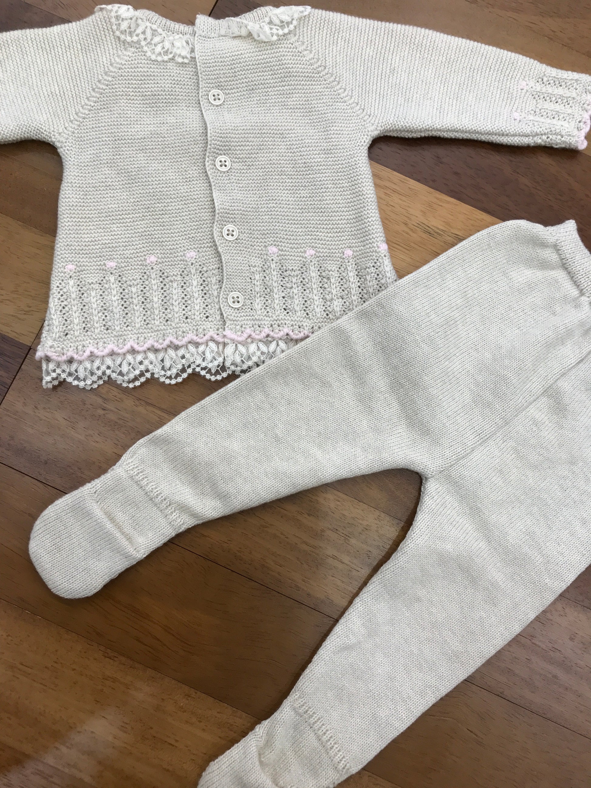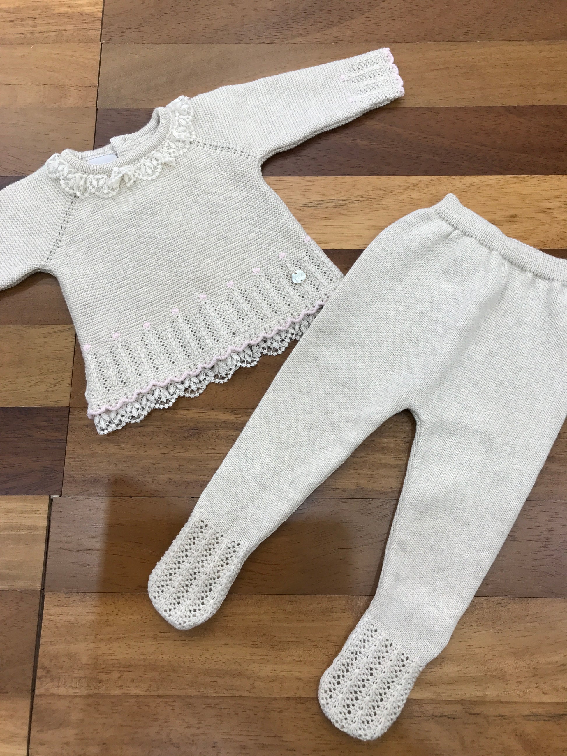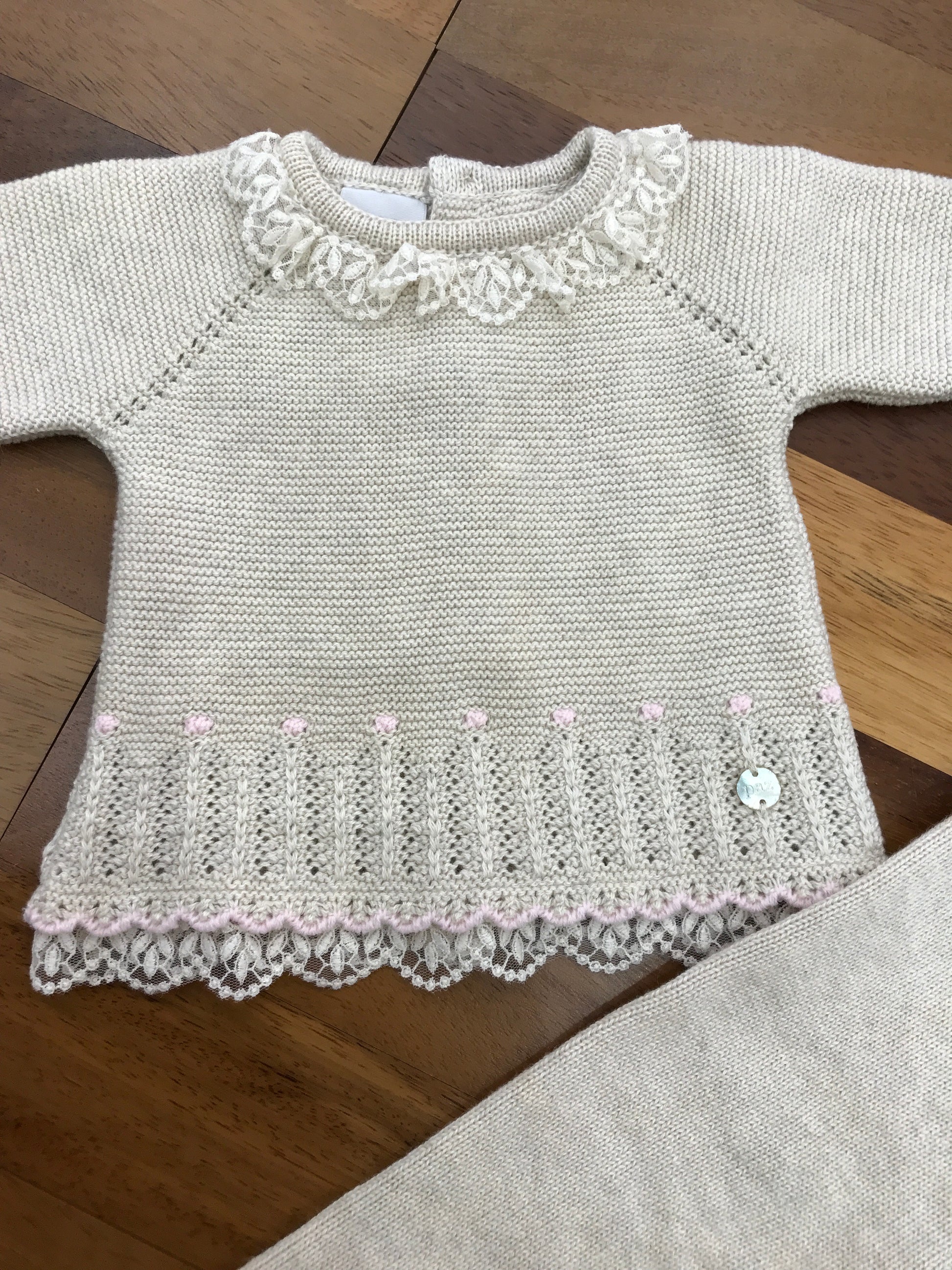 Completo due pezzi in lana, con pantaloni dotati di piedini traforati integrati. La parte superiore presenta un delicato merletto ricamato su maglia fine, arricchita da ricami rosa e un colletto impreziosito da merletto ricamato.