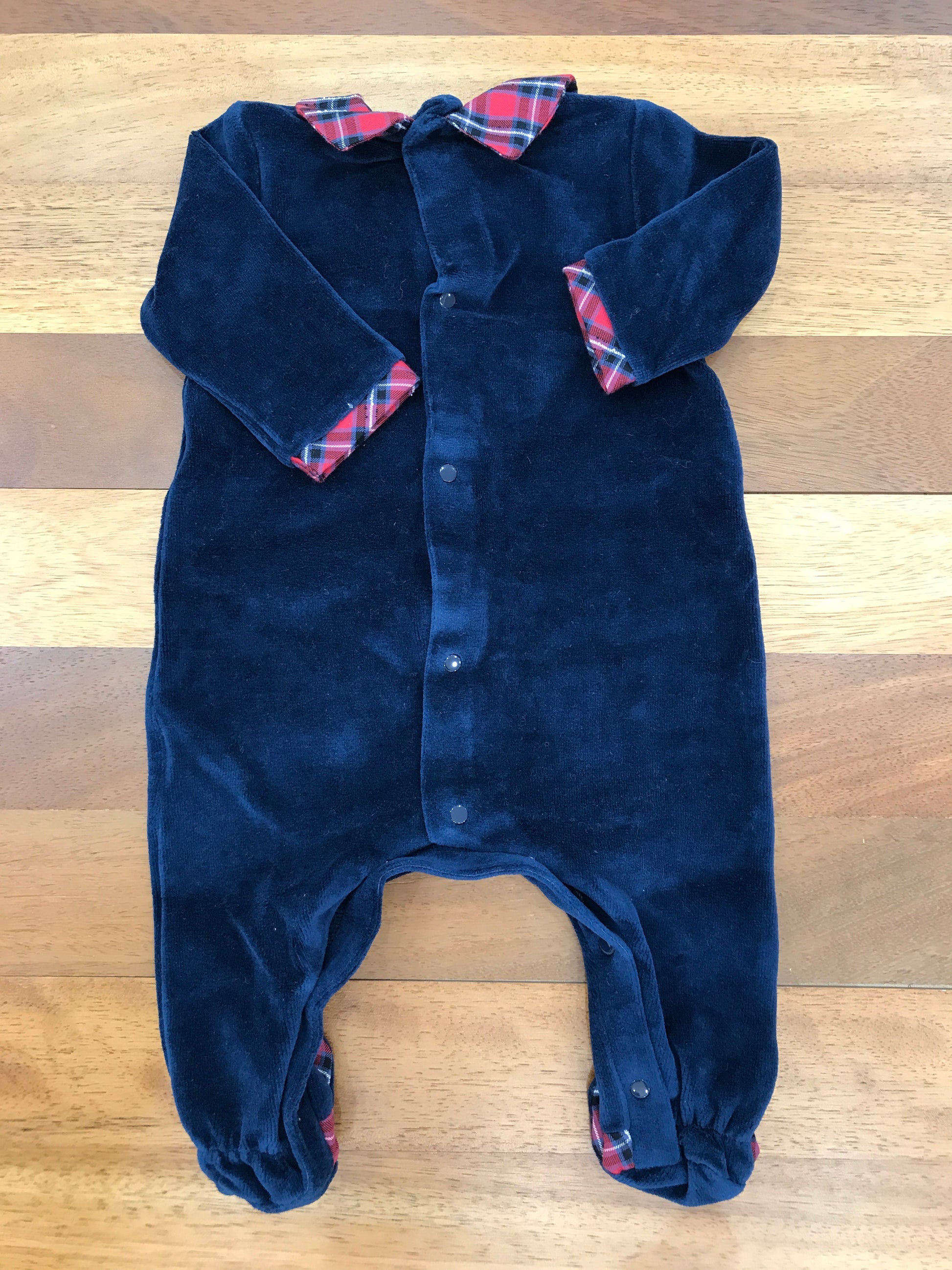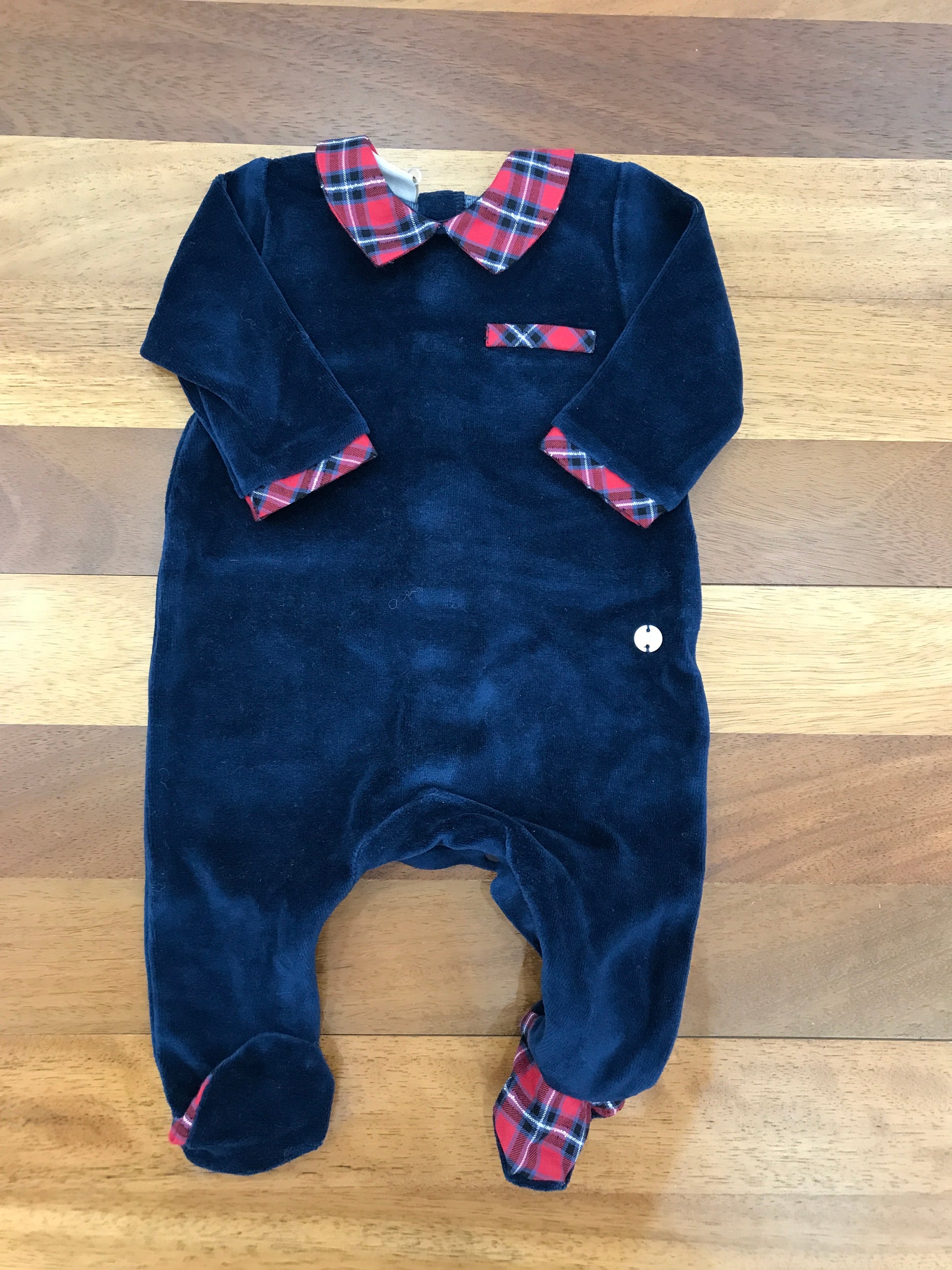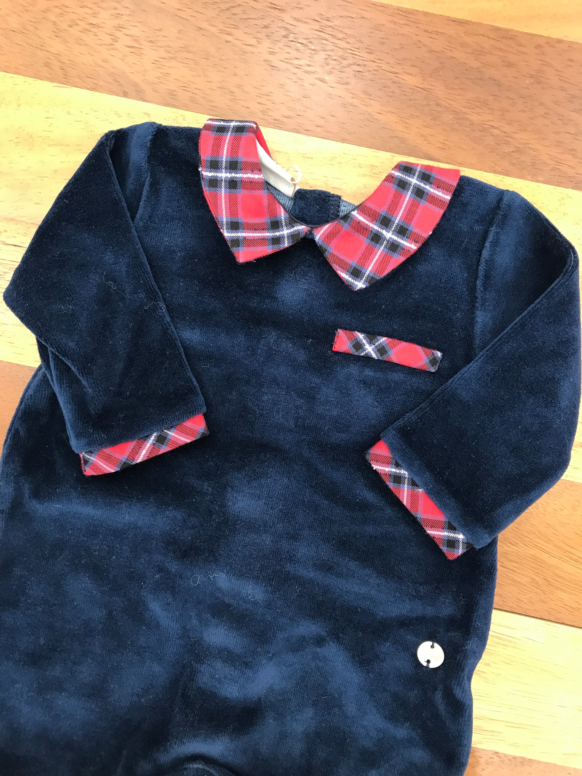 tutina in ciniglia con collo camicia e con polsini con richiamo tartan sul davanti la tutina presenta un finto taschino e il richiamo del tessuto tartan è previsto anche sui piedini