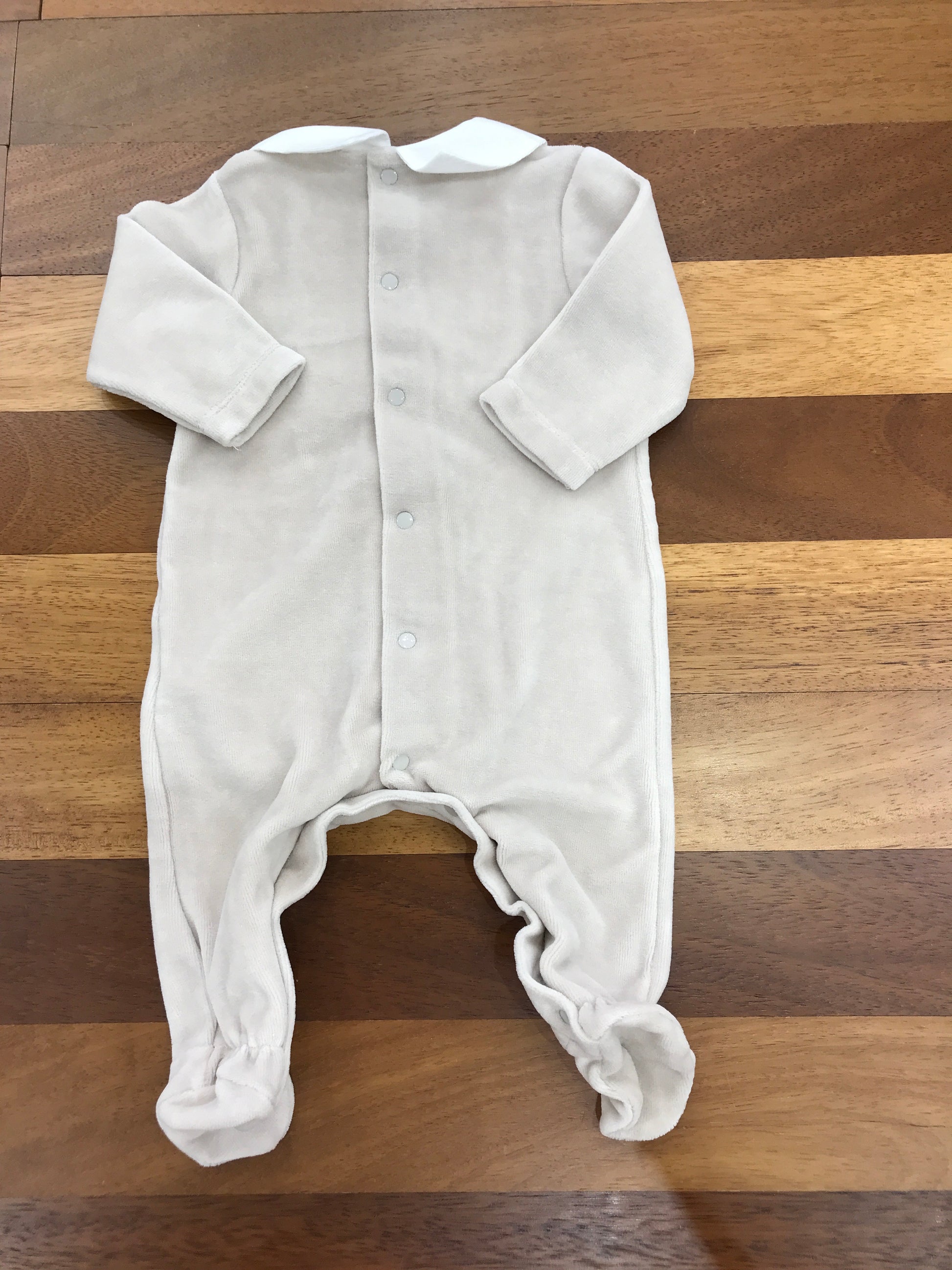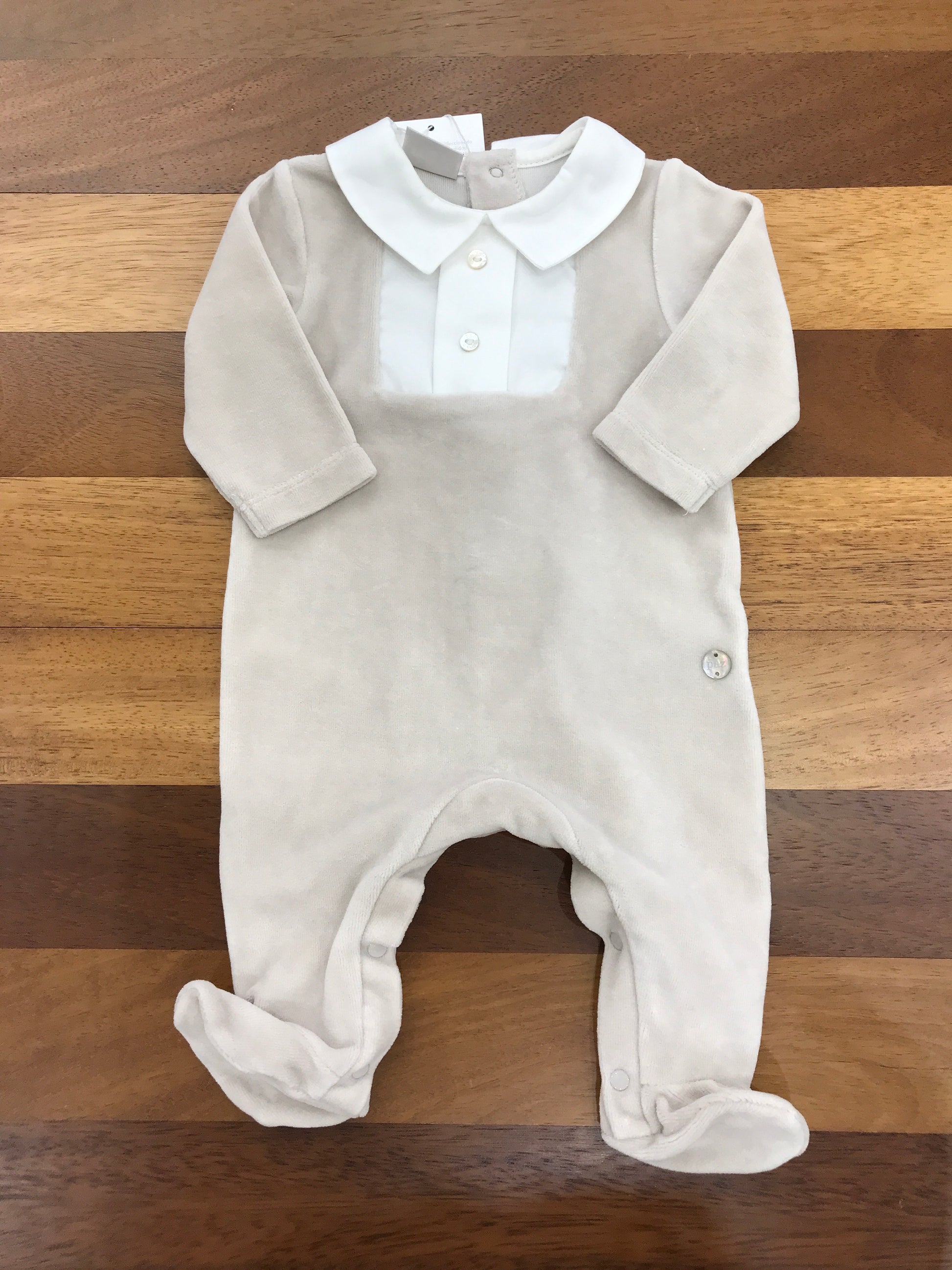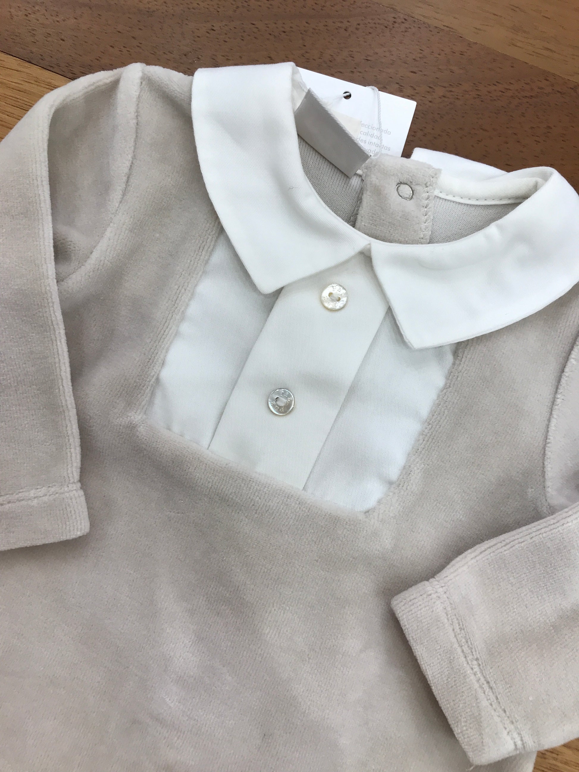 Elegante tutina realizzata in morbida ciniglia tortora, arricchita da dettagli raffinati come i piedini integrati e un sofisticato colletto finto in stile camicia bianco. Un capo versatile che combina comfort e stile, perfetto per occasioni speciali o per il quotidiano con un tocco di classe.