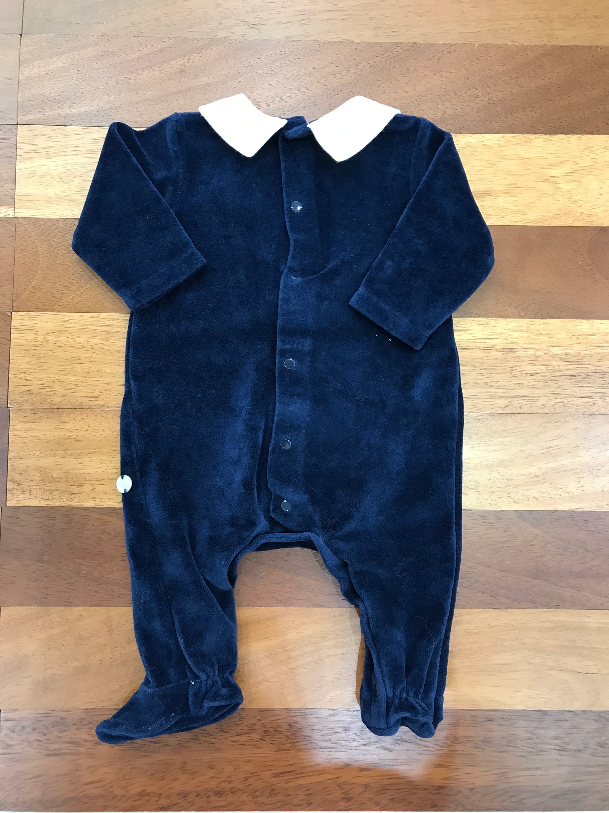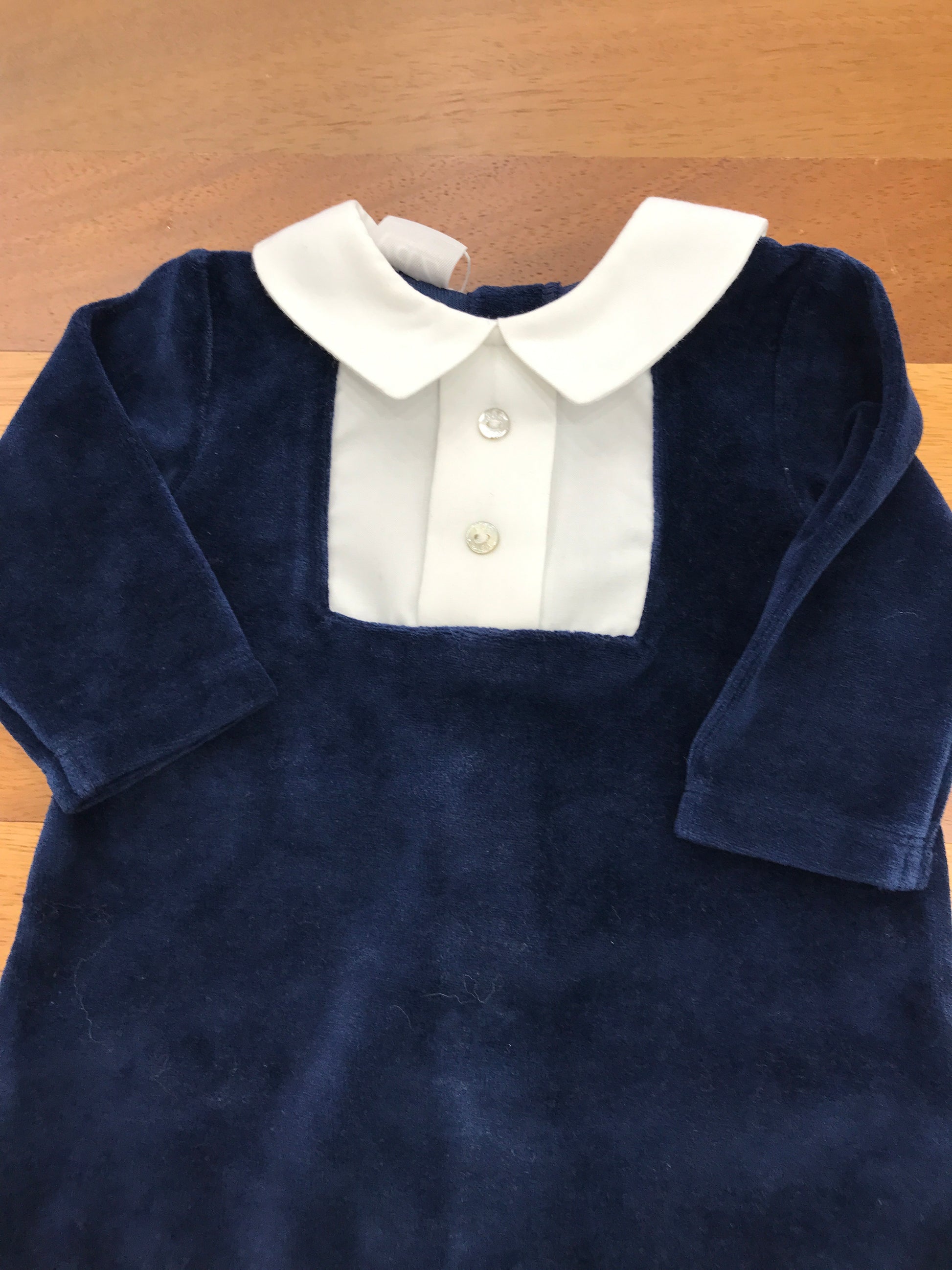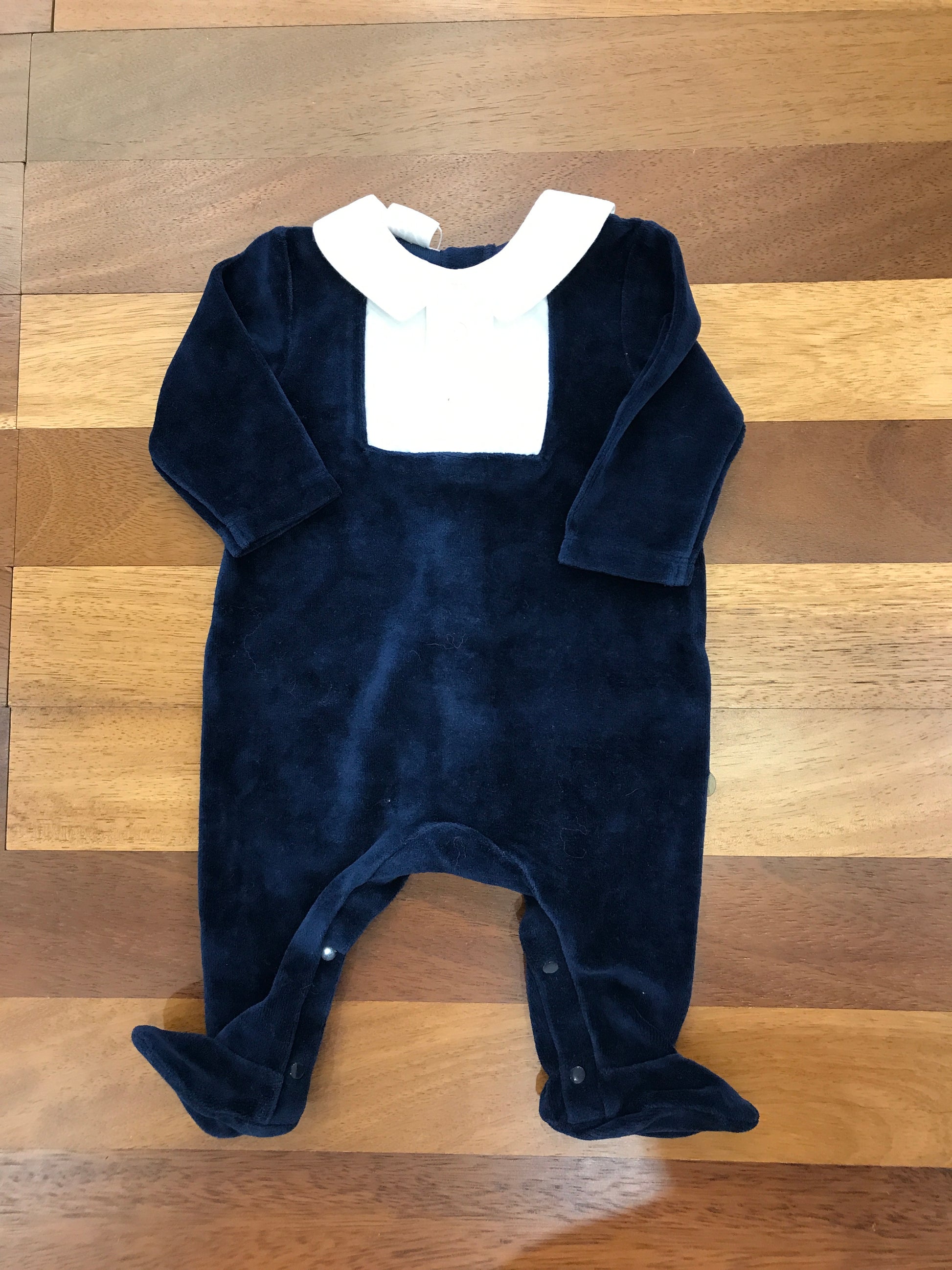 Elegante tutina in morbida ciniglia blu navy, arricchita da dettagli raffinati: piedini integrati per una vestibilità completa e colletto strutturato con effetto camicia in contrasto bianco. Un capo versatile che unisce comfort e stile, perfetto per occasioni speciali o uso quotidiano.
