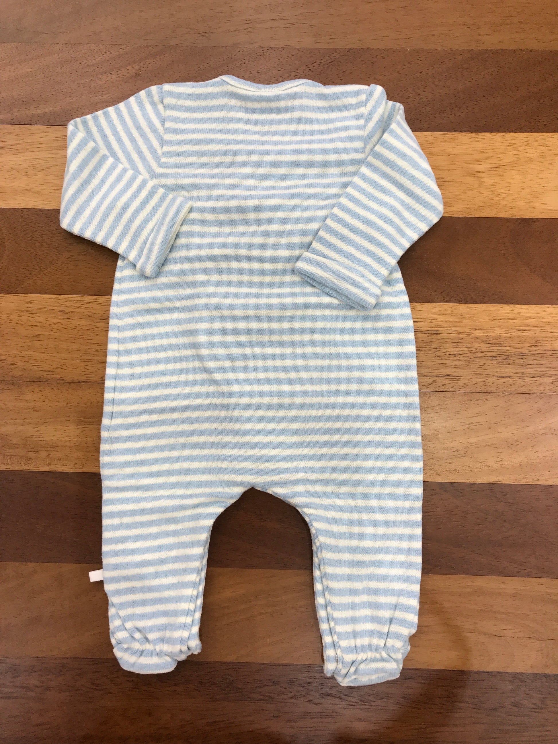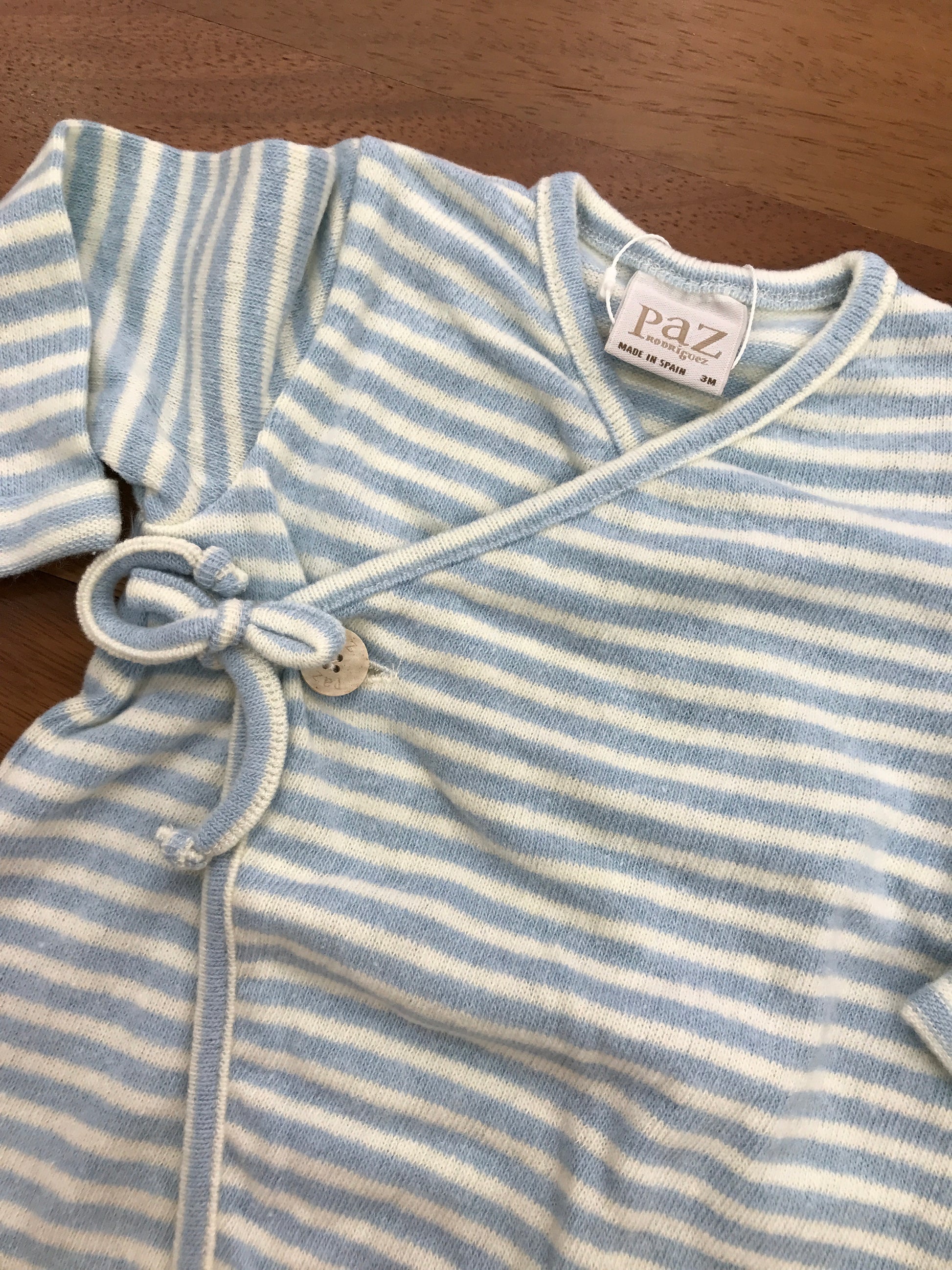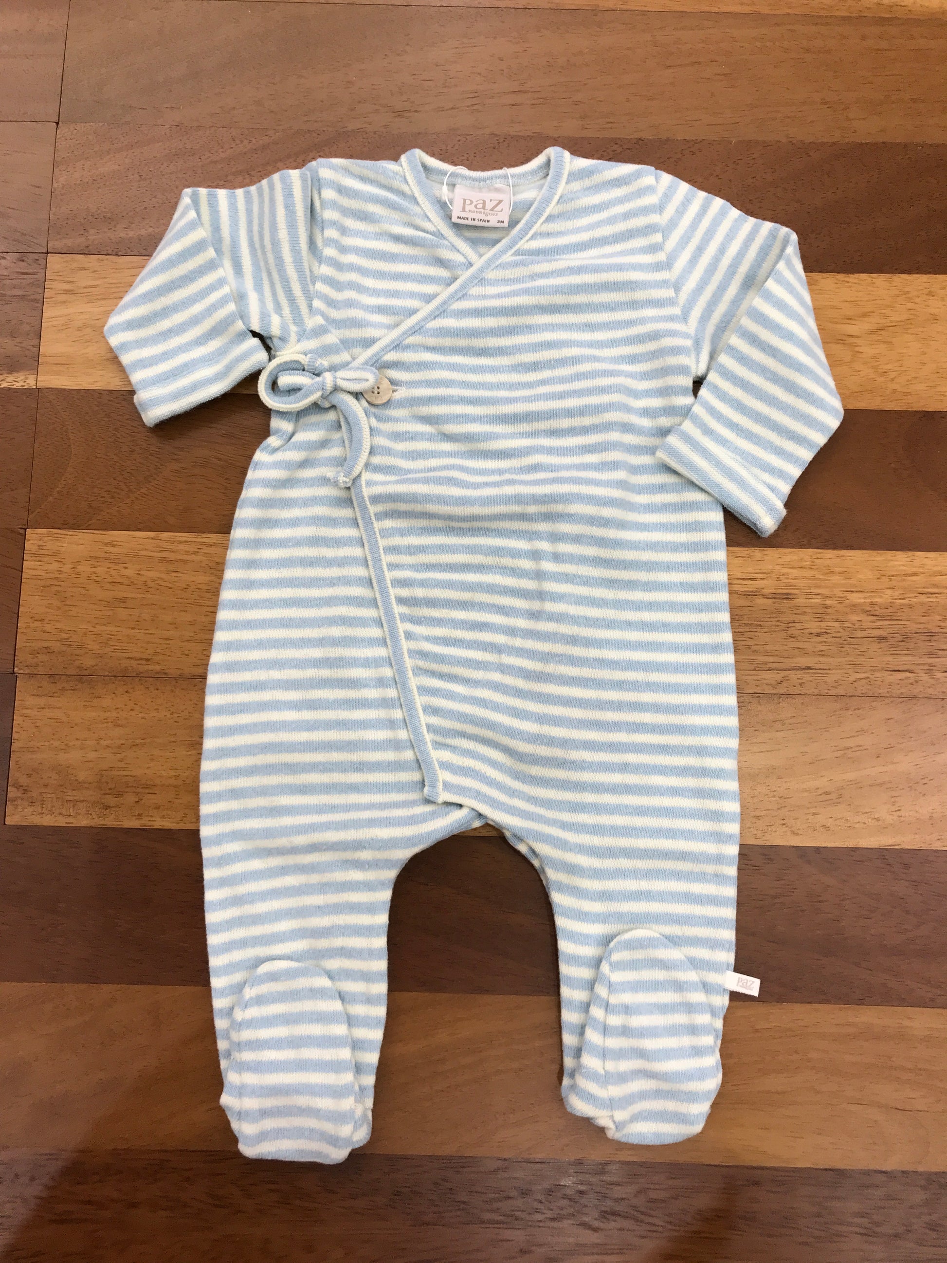 Elegante tutina realizzata in morbido caldoc a righe, che alterna tonalità di celeste e panna per un effetto visivo raffinato. Caratterizzata da pratici piedini integrati e impreziosita da un dettaglio laterale che ne esalta la silhouette. Un capo versatile e confortevole, ideale per il guardaroba della piccola.