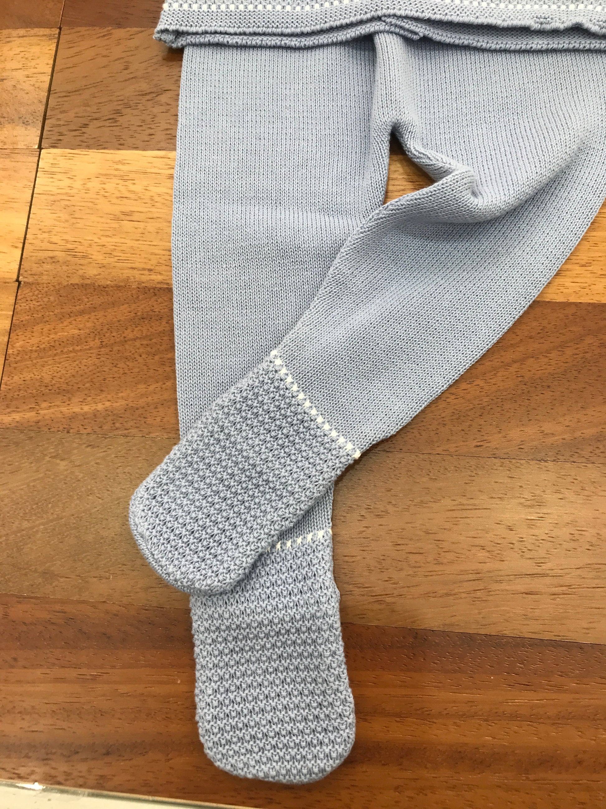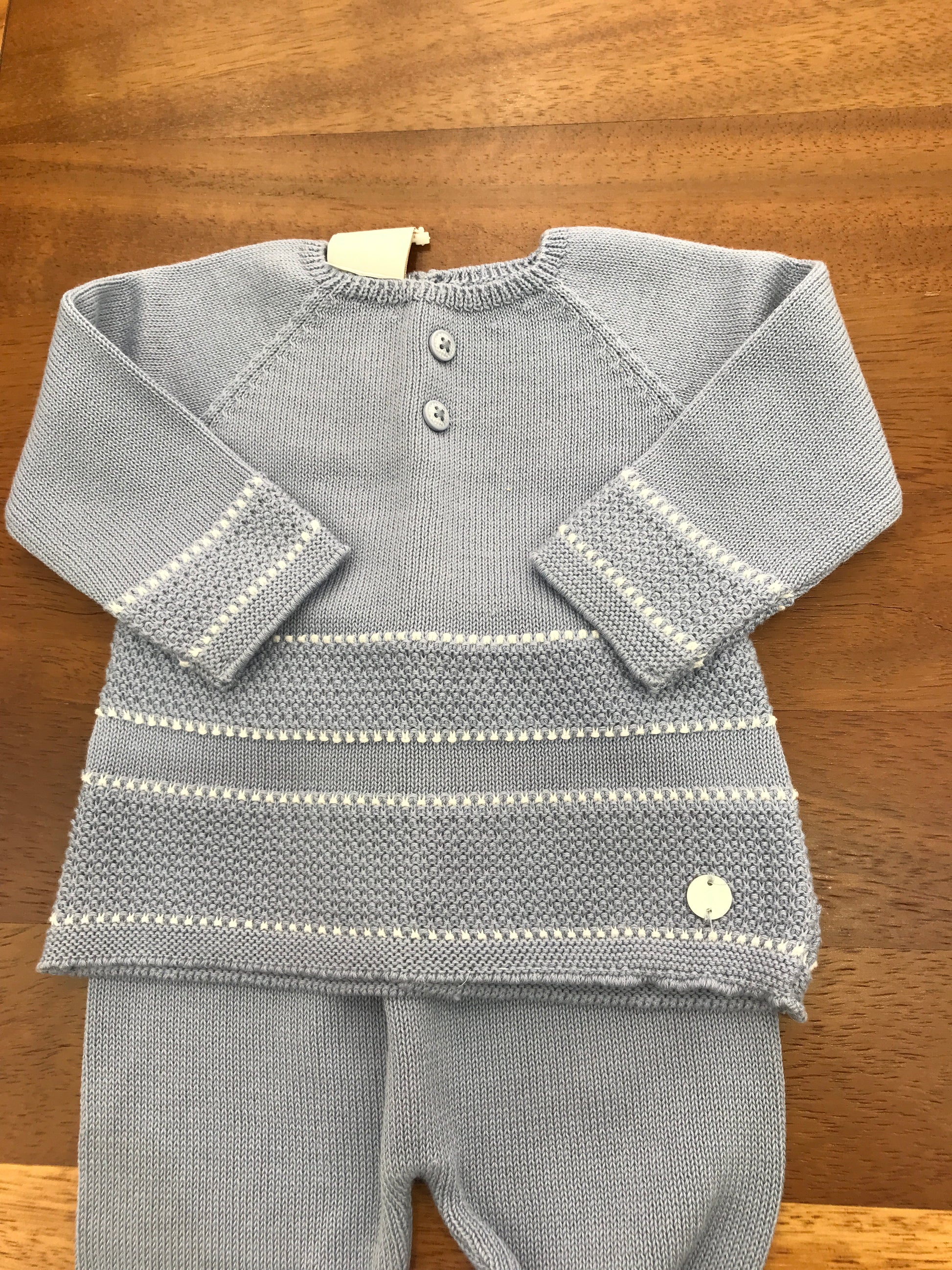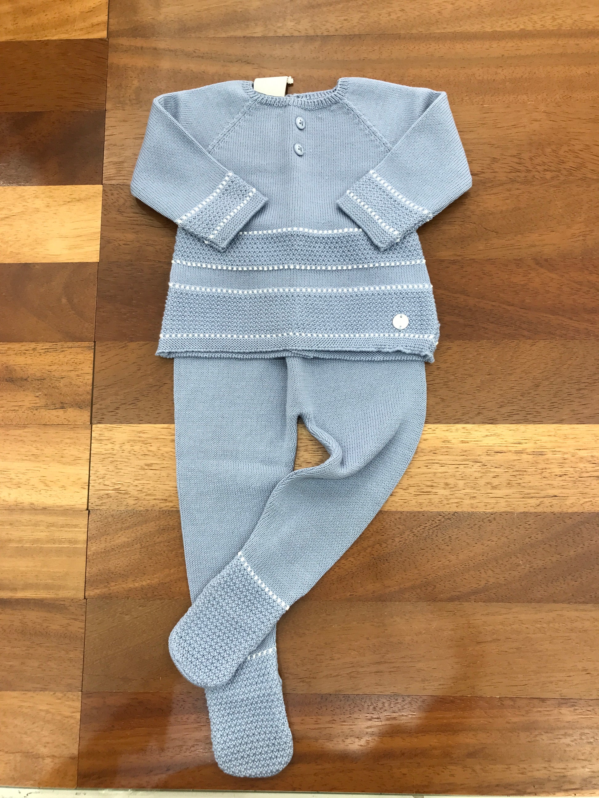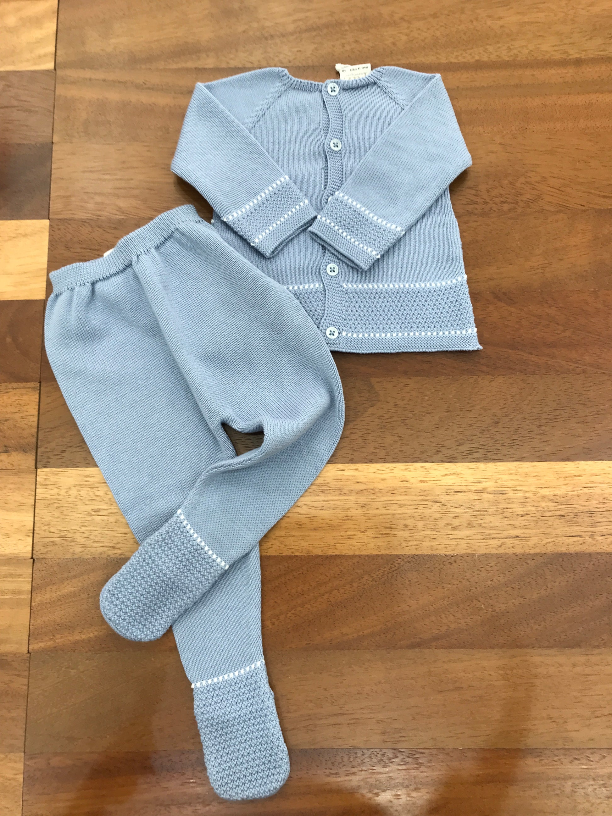 Elegante completo in filo tono avio composto da due elementi: pantalone con piedini e top rifinito con dettagli bianchi lavorati. Un insieme sofisticato che unisce comfort e stile, perfetto per occasioni speciali o look quotidiani ricercati.
