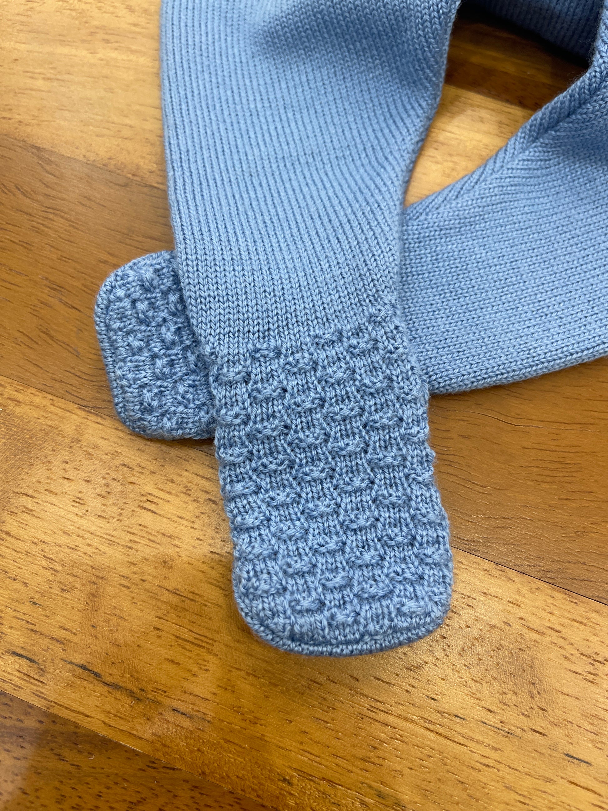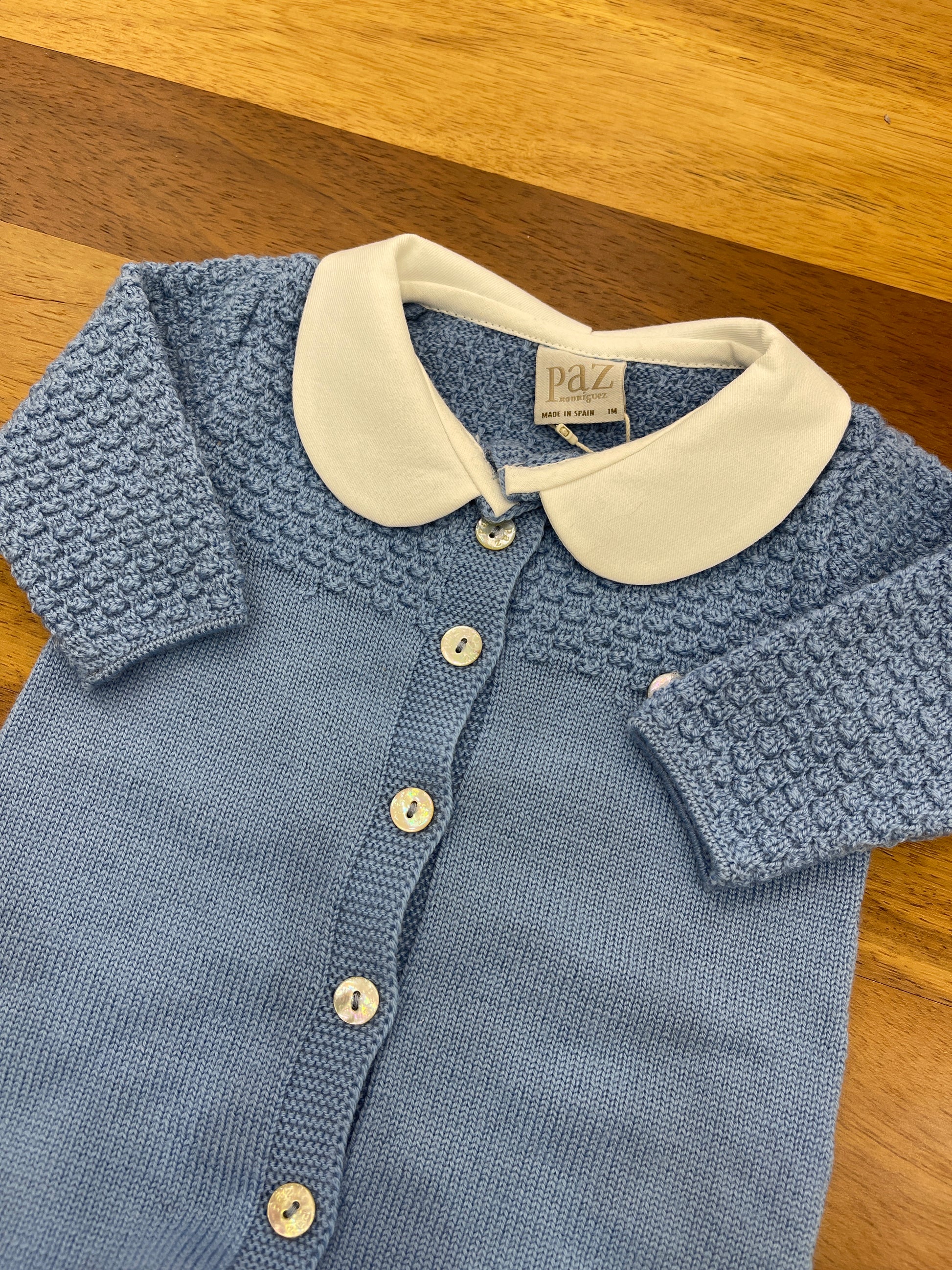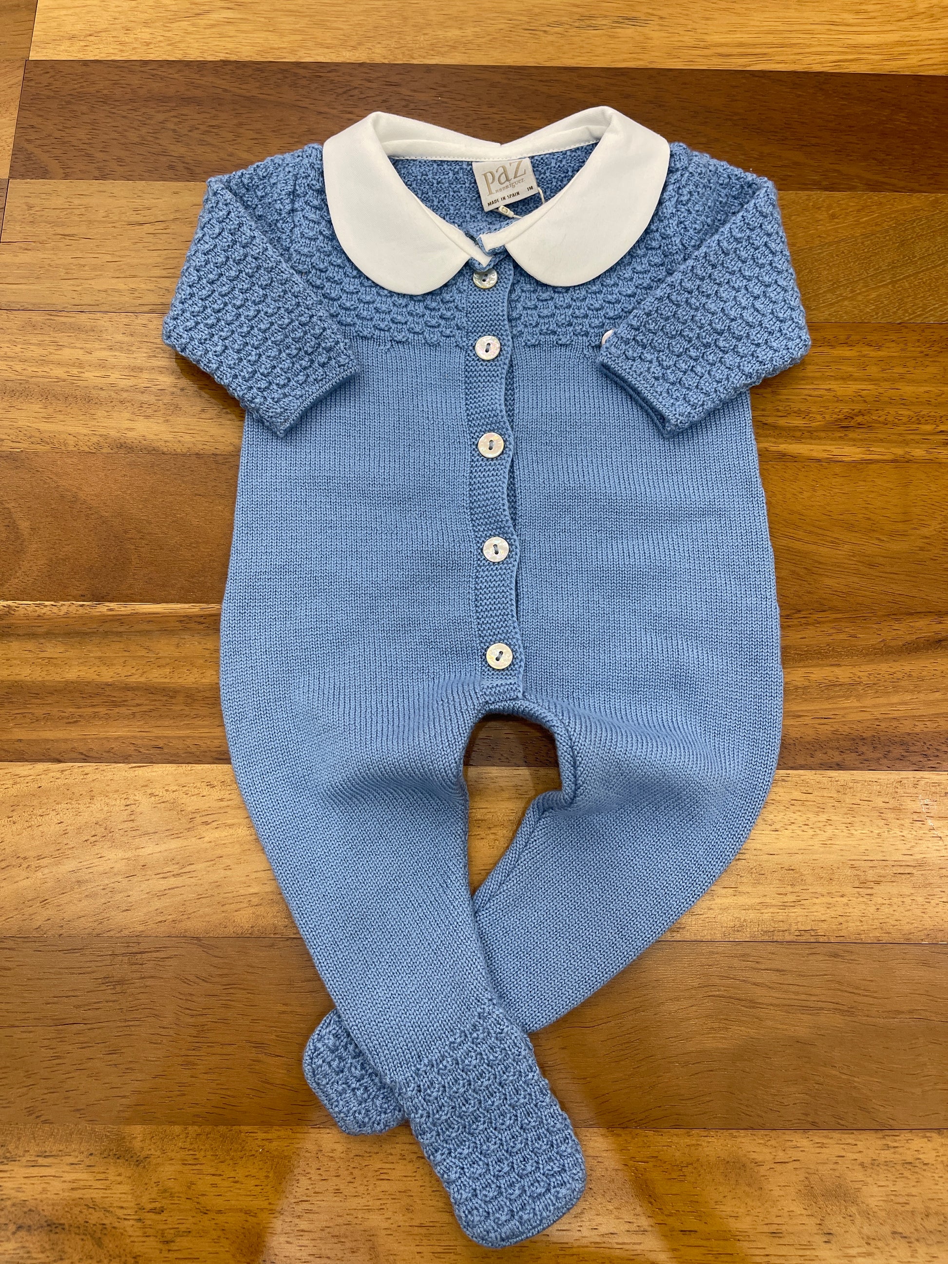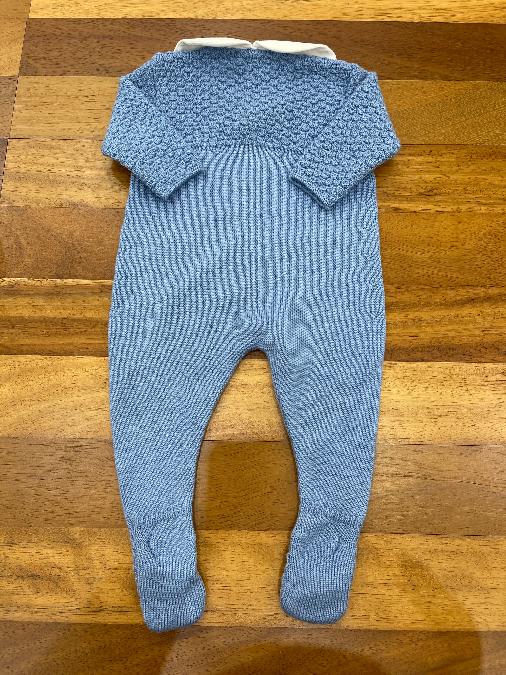 Questa tutina intera con piedini è caratterizzata da una raffinata lavorazione a maglia sulle spalle, sulle braccia e sui piedini, completata da un collo tondo per un comfort ottimale.