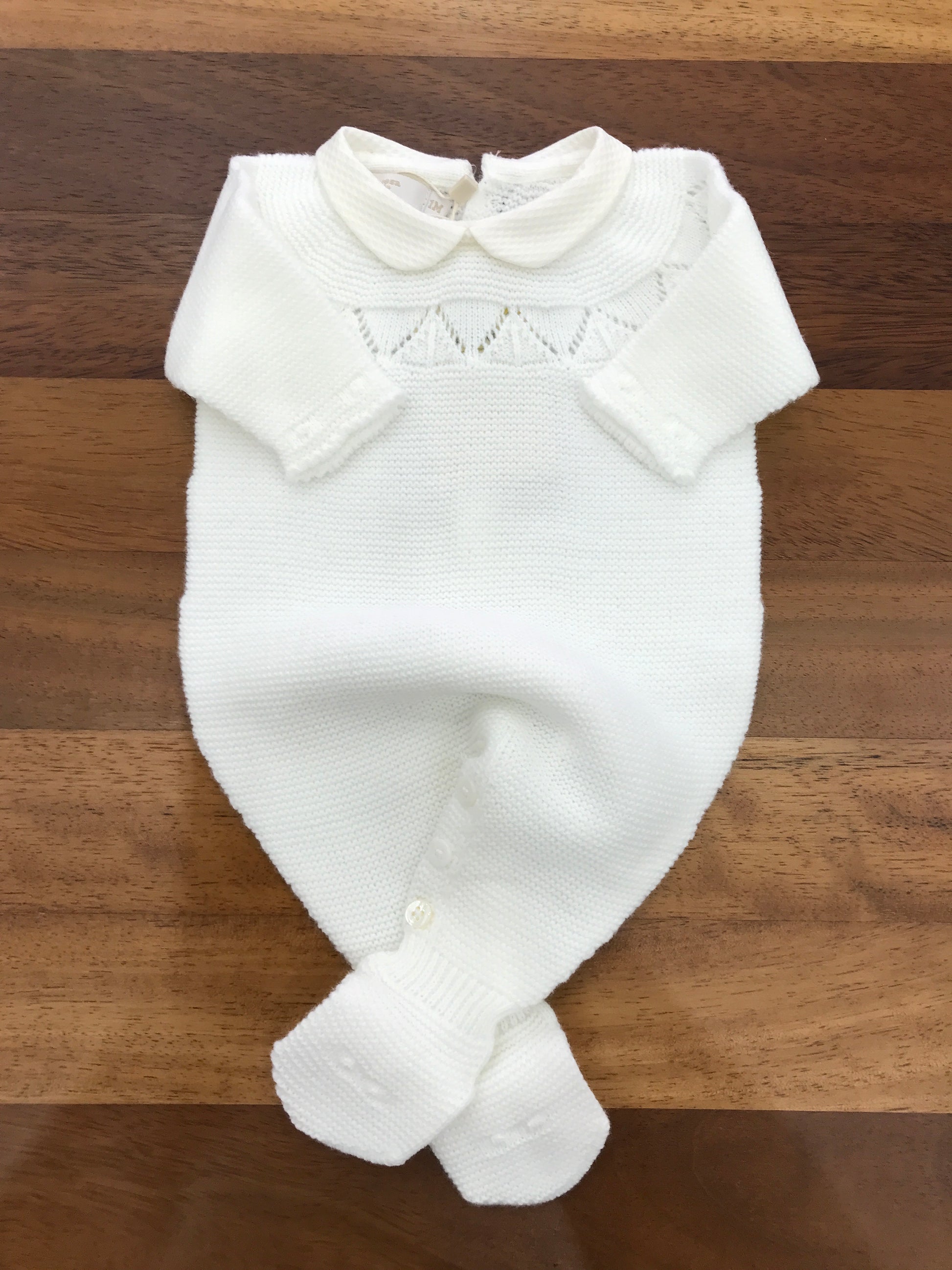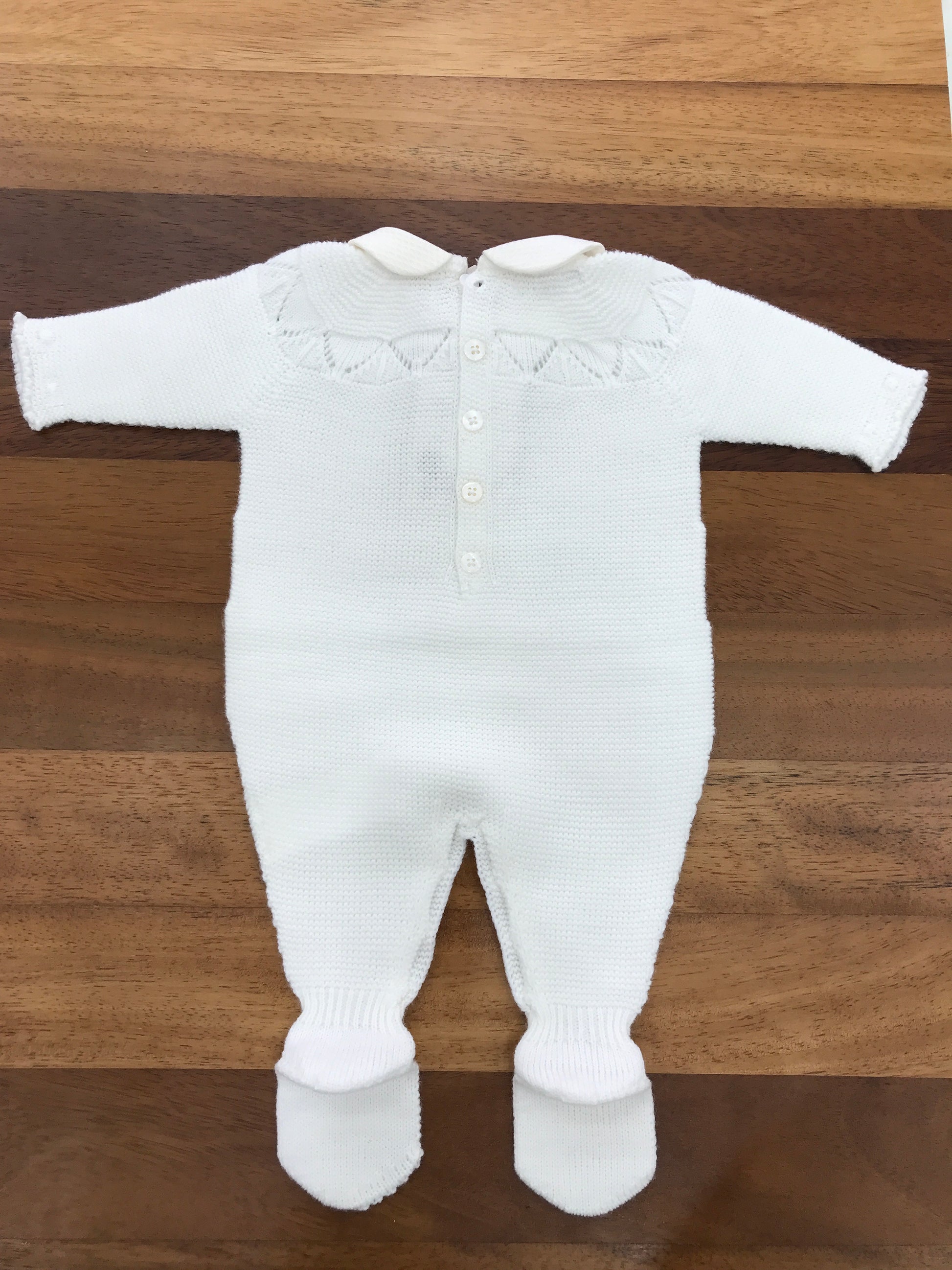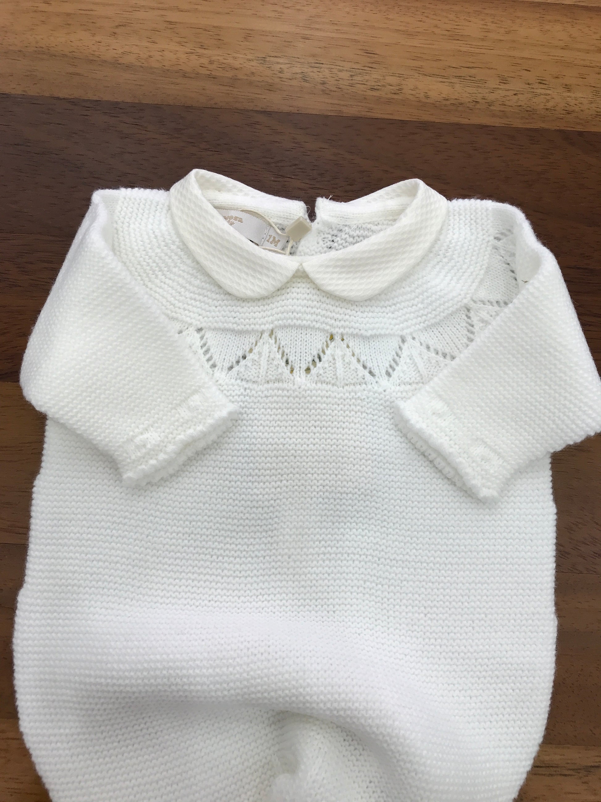 Questo capo è una tutina intera di colore bianco, progettata con piedini integrati e un colletto elegante. Le maniche sono rifinite con un delicato smerlo che aggiunge un tocco di raffinatezza. Al centro della parte frontale, la tutina presenta ricami accuratamente realizzati, che valorizzano l’estetica complessiva del prodotto. Questa combinazione di dettagli rende la tutina ideale per offrire comfort e stile in un unico capo completo.