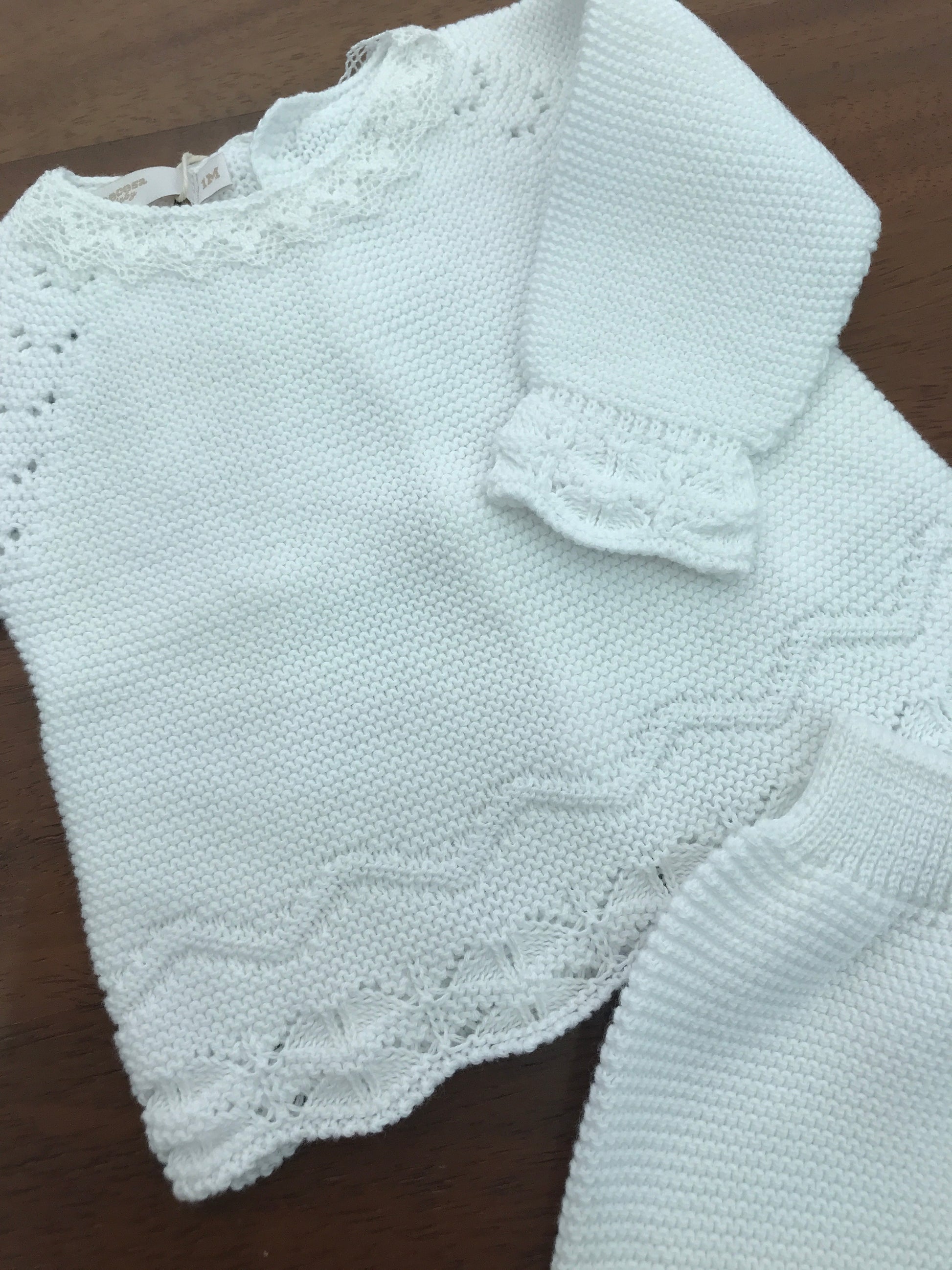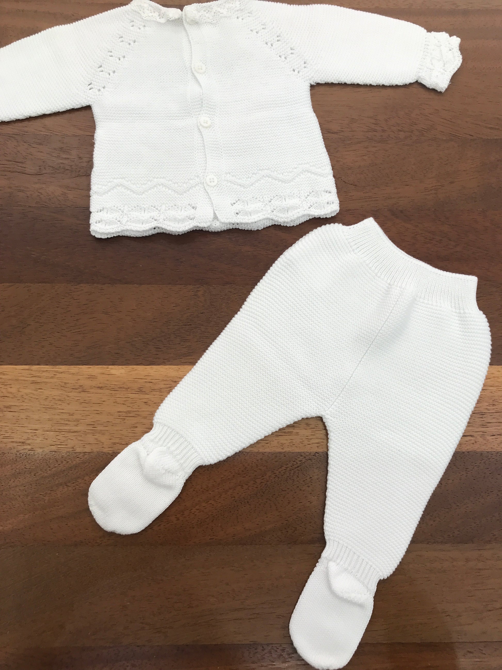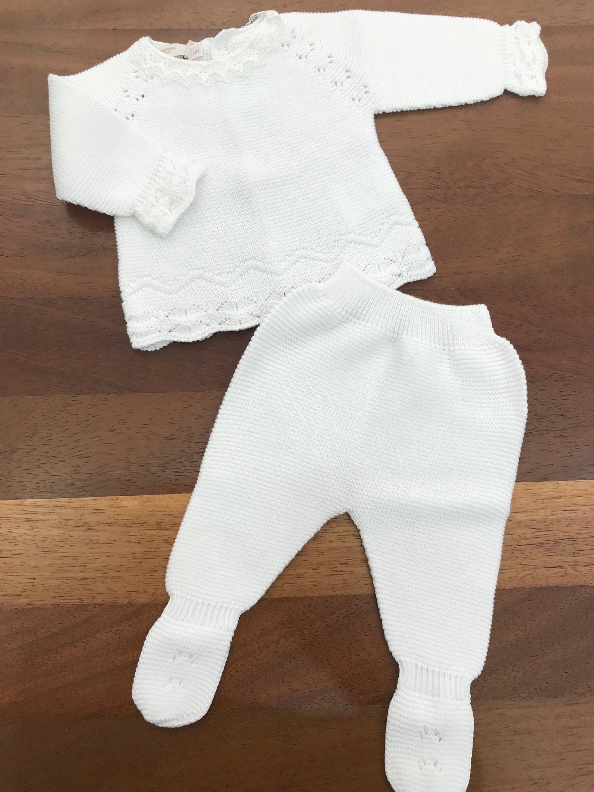 Completo in acrilico bianco a due pezzi, caratterizzato da pantaloni con piedini integrati e una parte superiore rifinita con dettagli lavorati. Un capo versatile e pratico, ideale per il comfort quotidiano dei più piccoli.