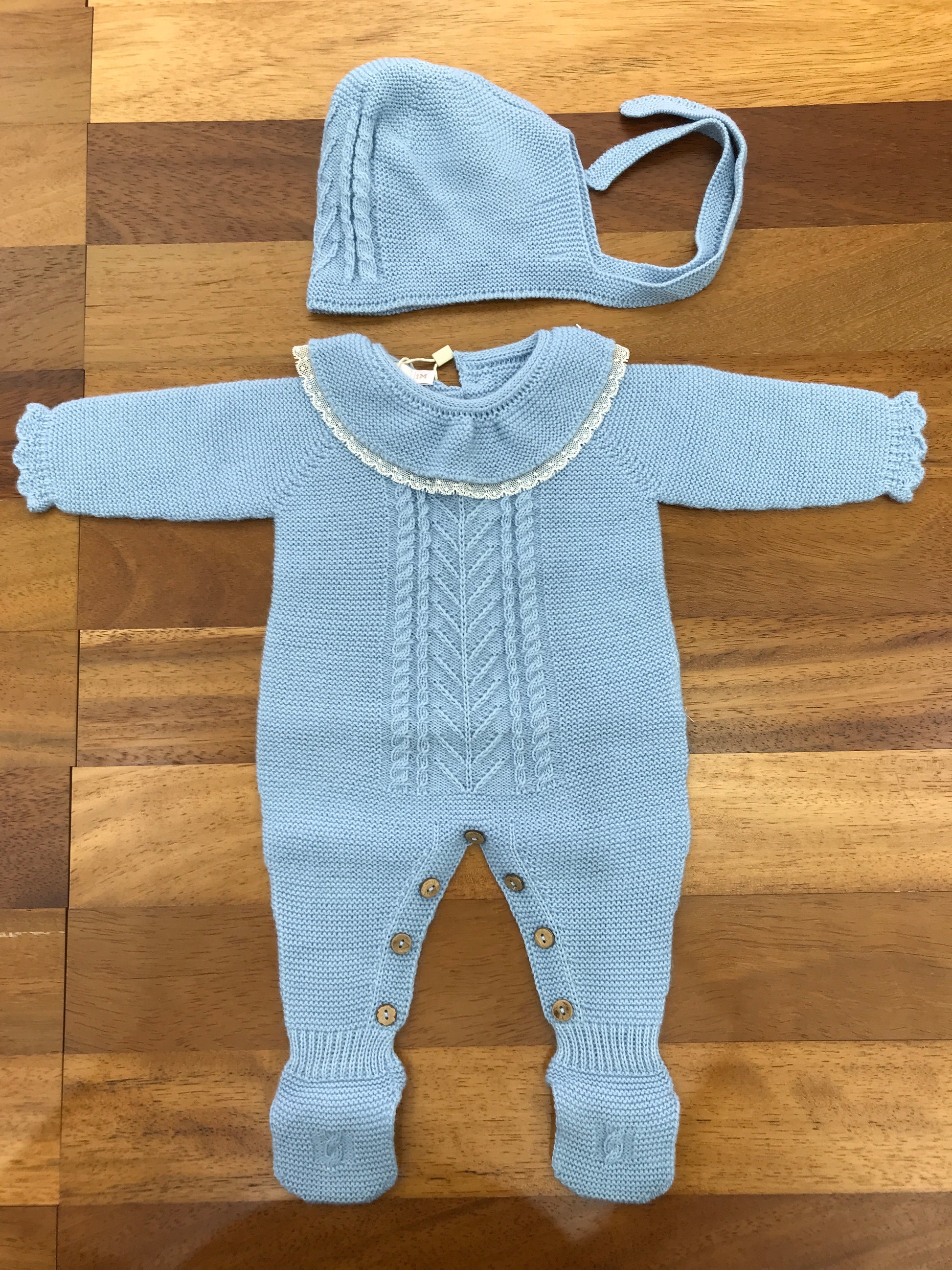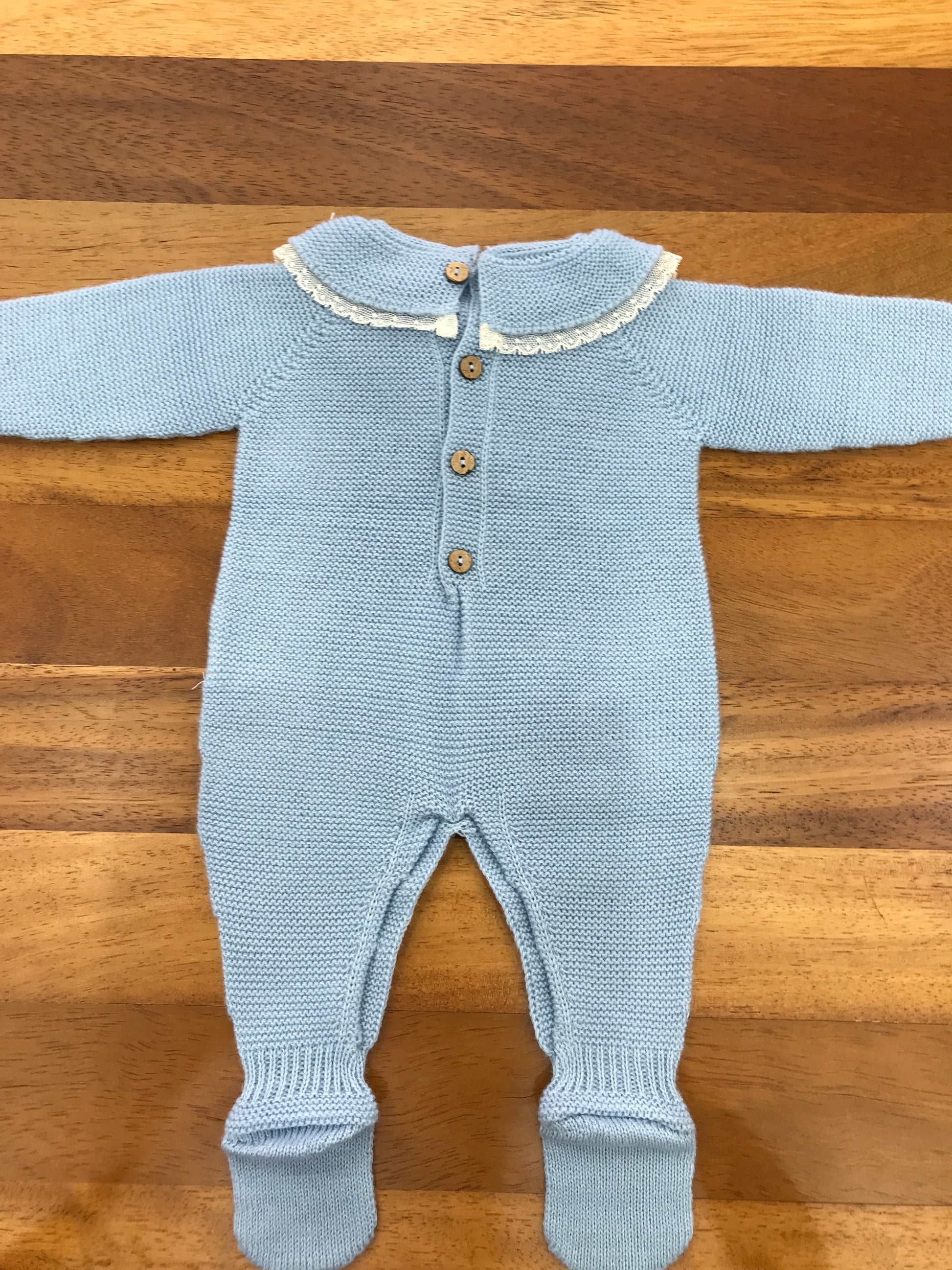 Questa tutina completa con piedini presenta un raffinato motivo a trecce sulla parte frontale. Il collo, arricchito da rouches in tessuto e rifinito con pizzo, aggiunge un tocco di eleganza e attenzione ai dettagli.