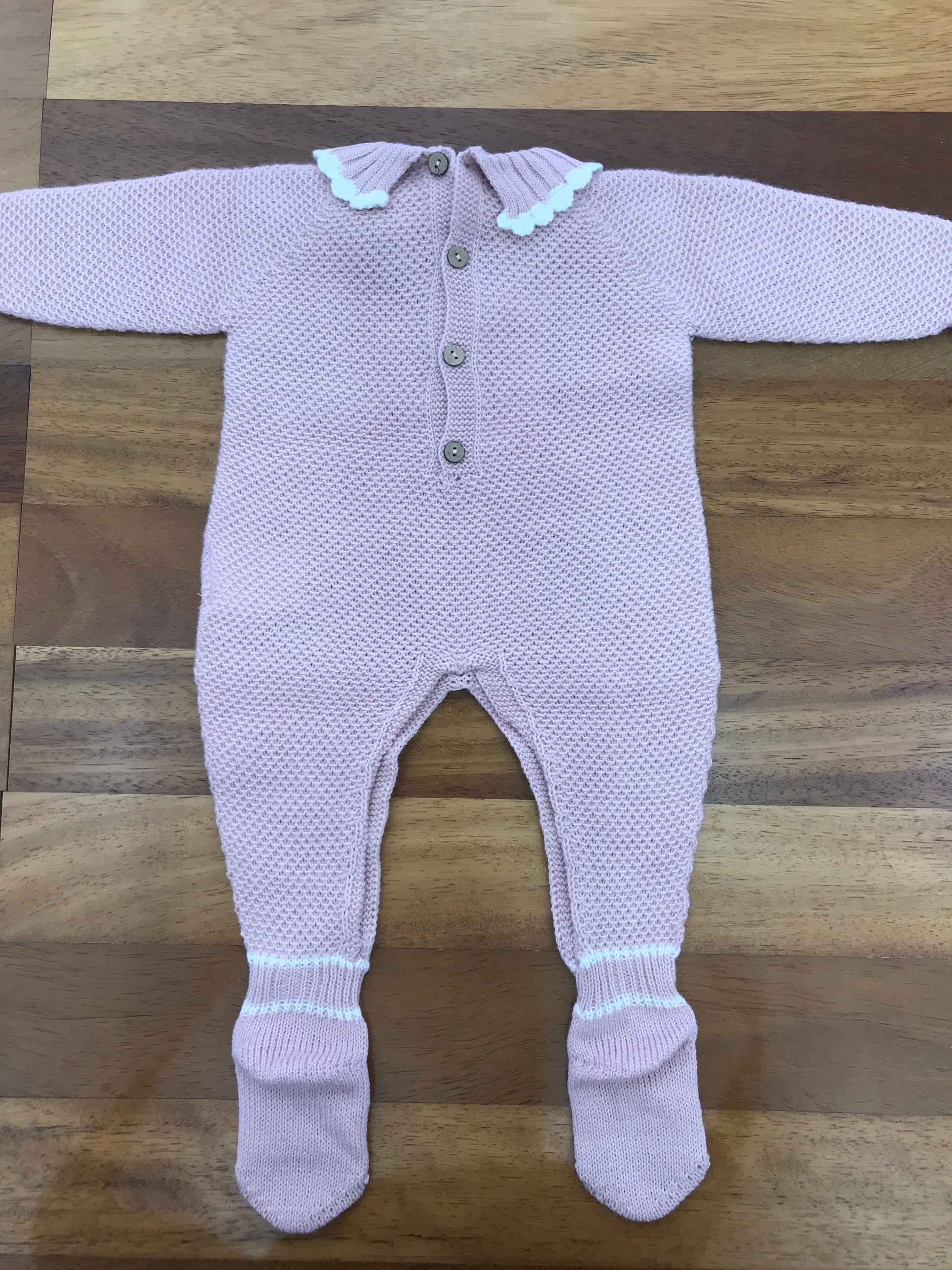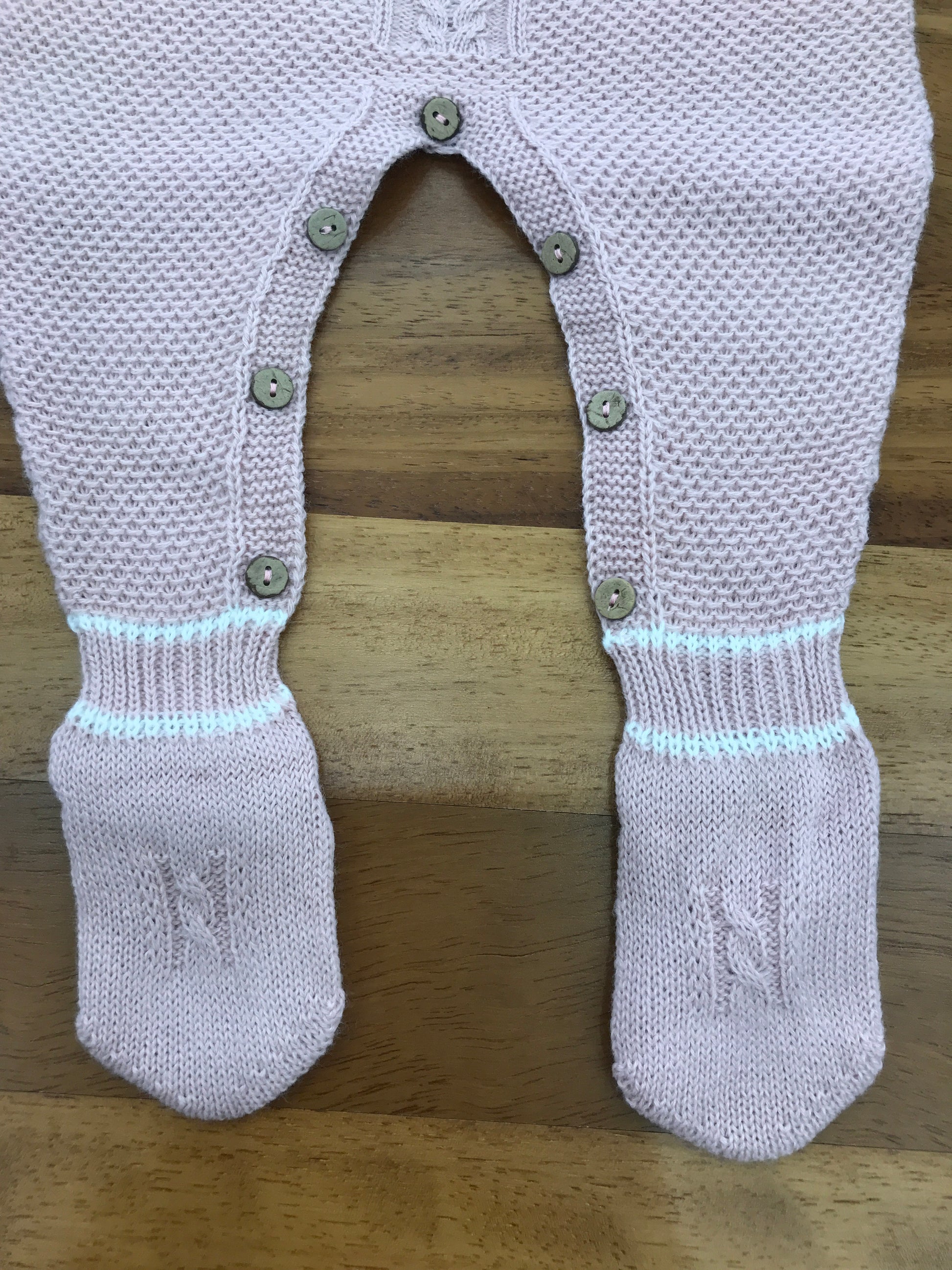 Tutina completa con piedini integrati e collo stile polo, caratterizzata da una raffinata lavorazione a trecce sulla parte frontale.