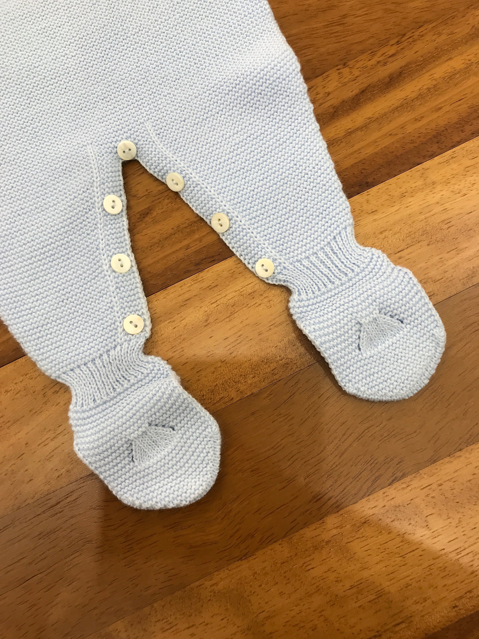 Questa tutina in lana a corpo unico, con piedini integrati, si distingue per il collo ricamato e un delicato ricamo centrale, garantendo eleganza e comfort per il neonato.