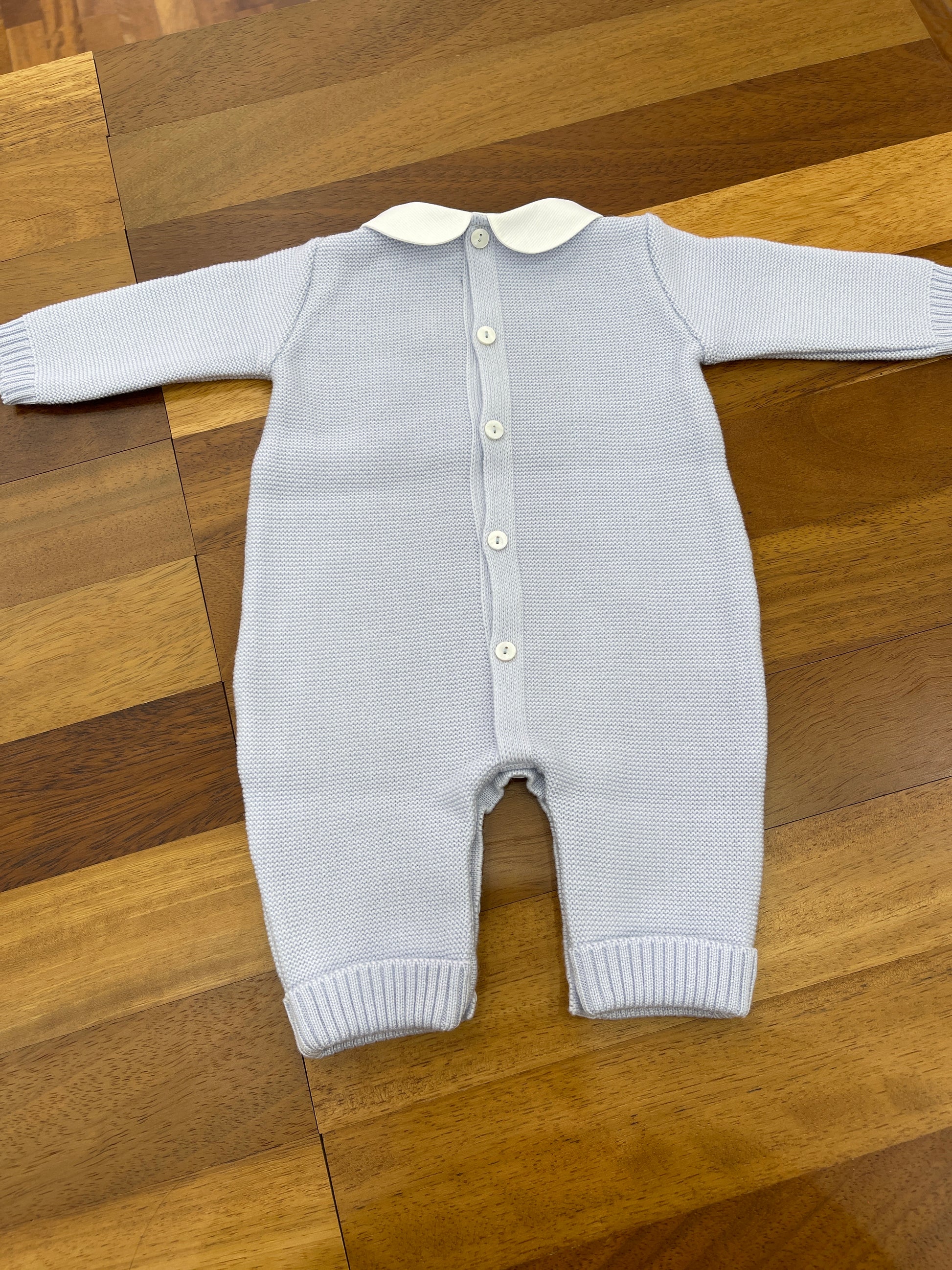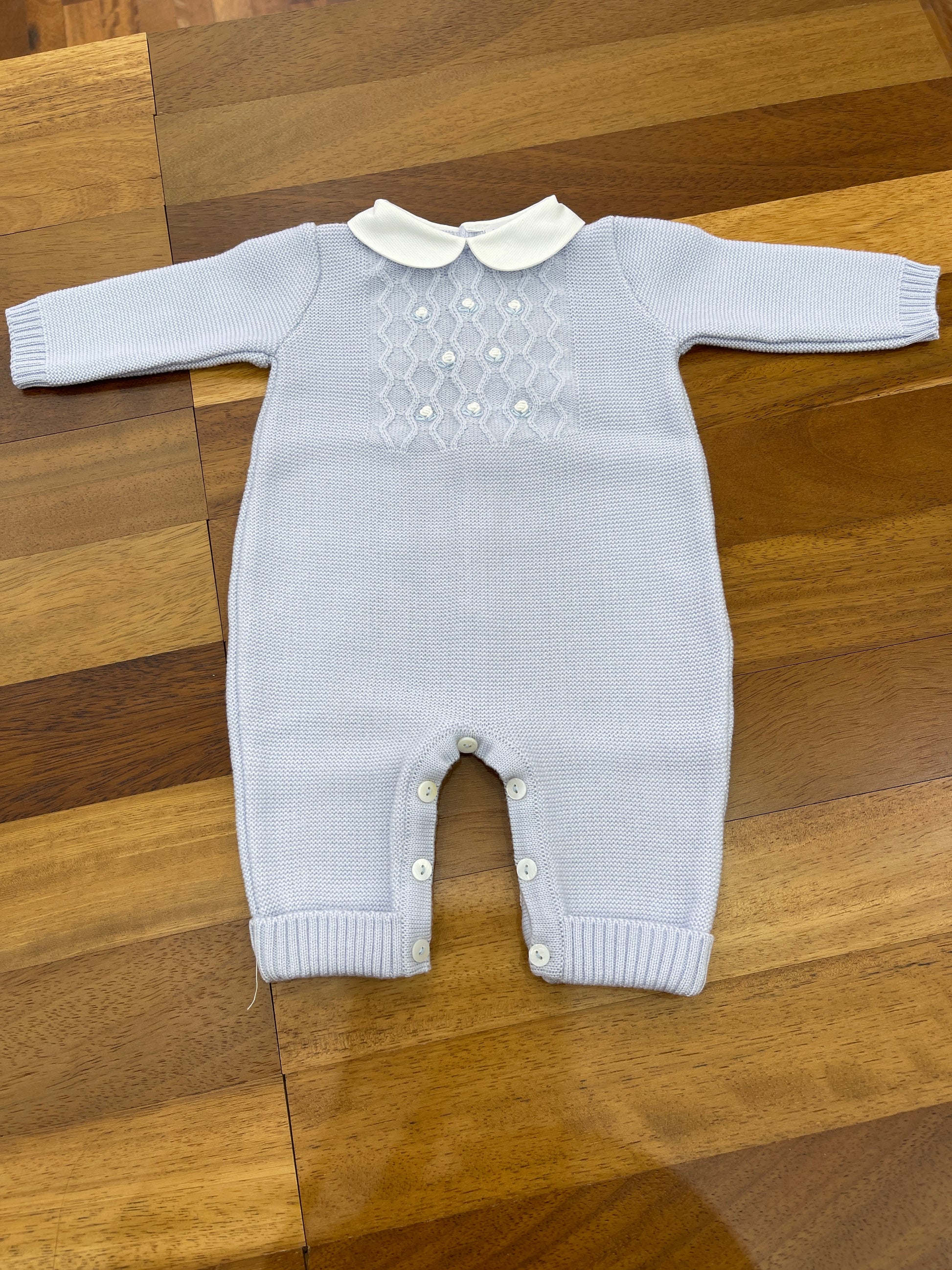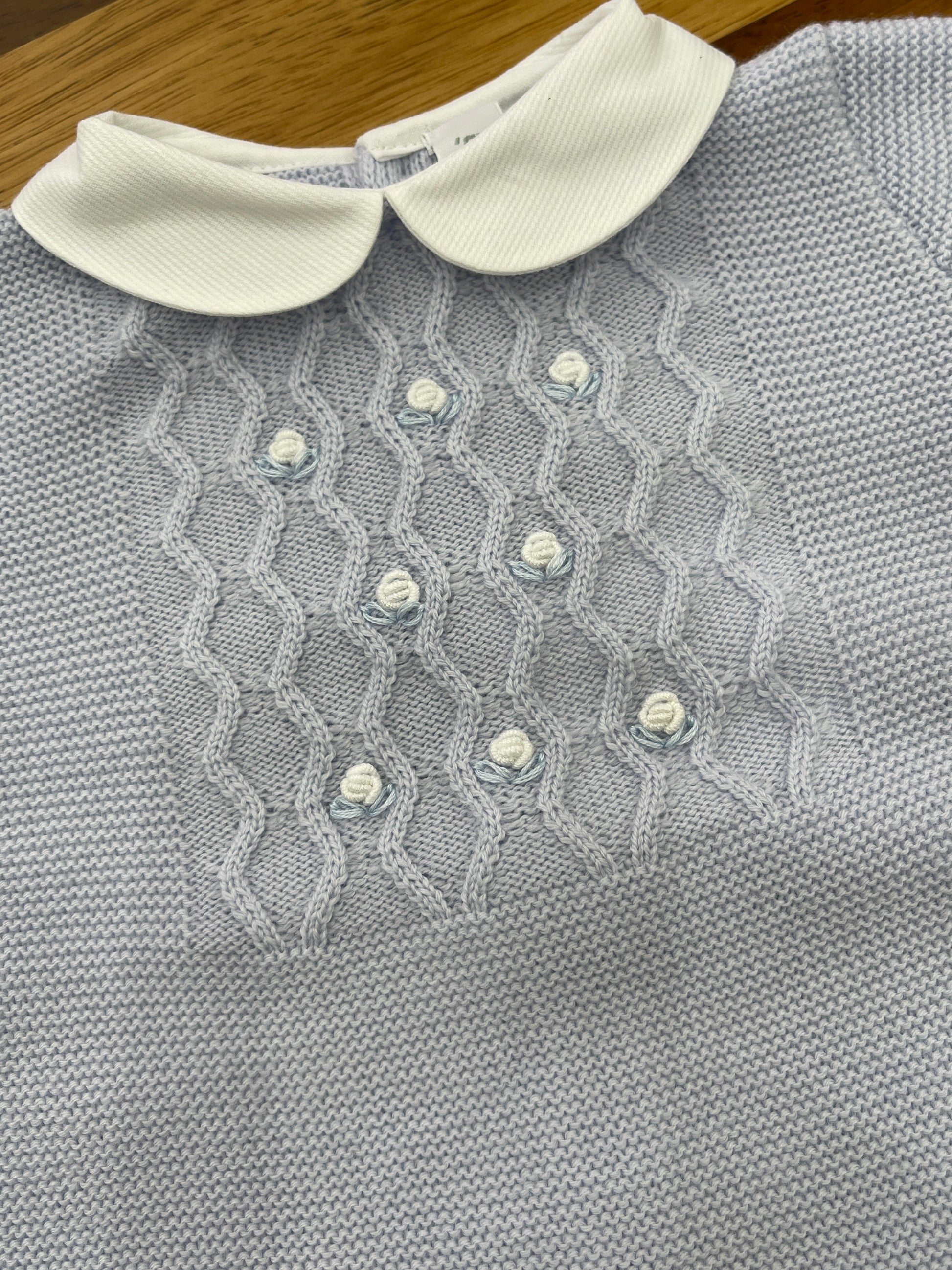 La tutina intera in un delicato colore celeste è arricchita da una raffinata lavorazione ricamata che presenta piccole rose bianche, conferendo un tocco di eleganza e dolcezza. Completa il design un colletto curato, mentre la parte inferiore è priva di piedini, garantendo comfort e libertà di movimento. Questa combinazione di dettagli rende la tutina ideale per chi cerca un capo sofisticato e pratico per i più piccoli.
