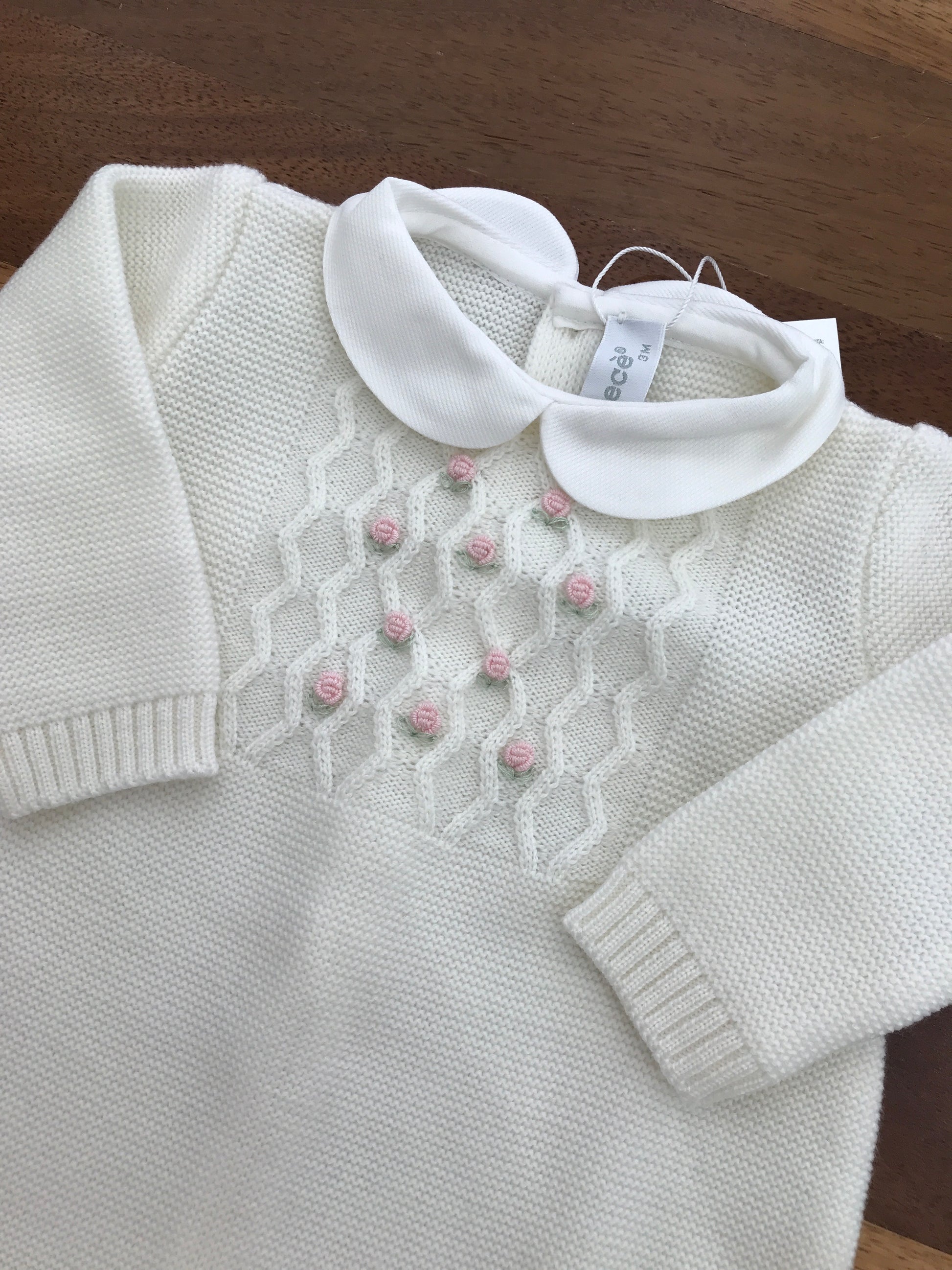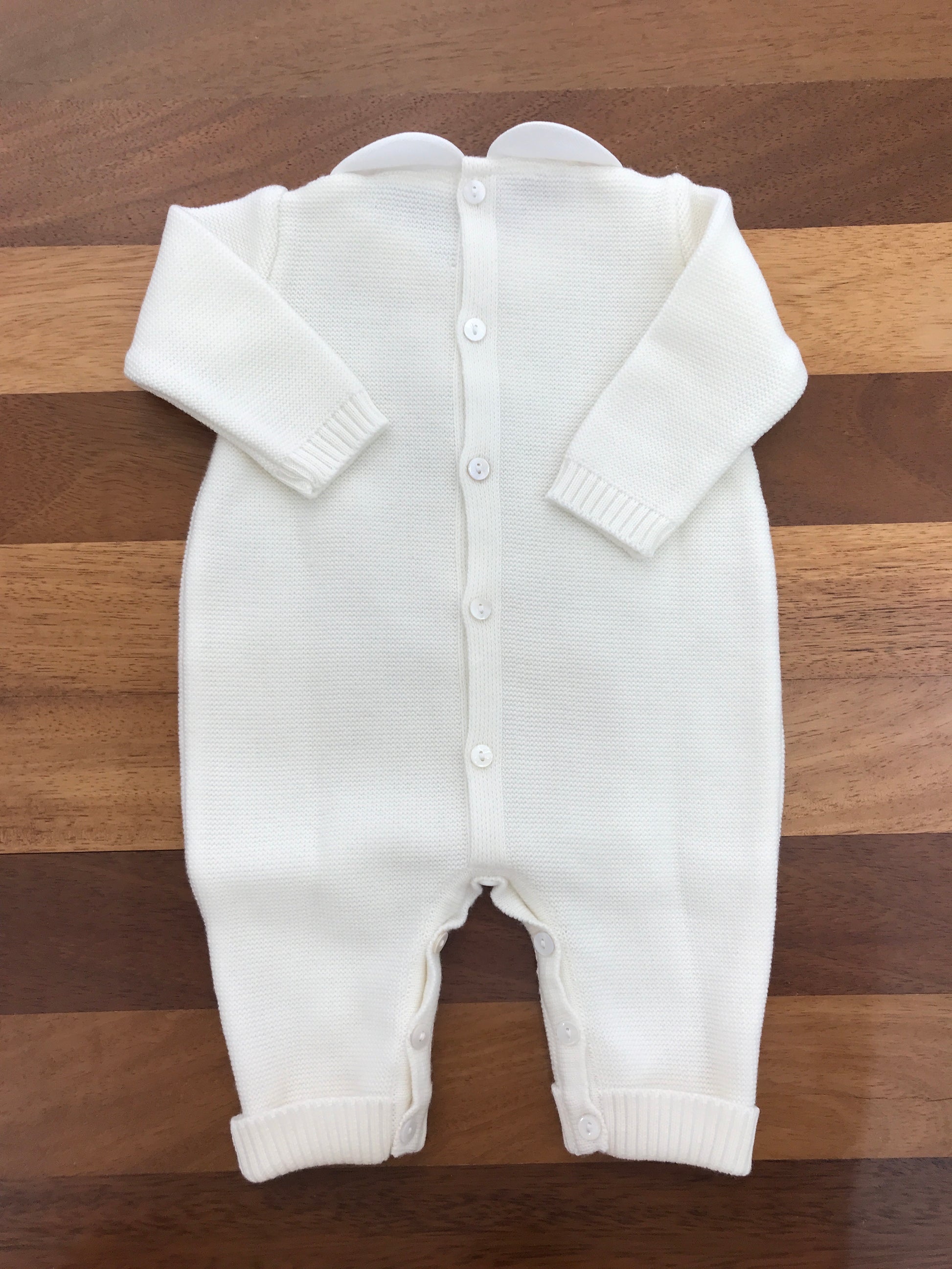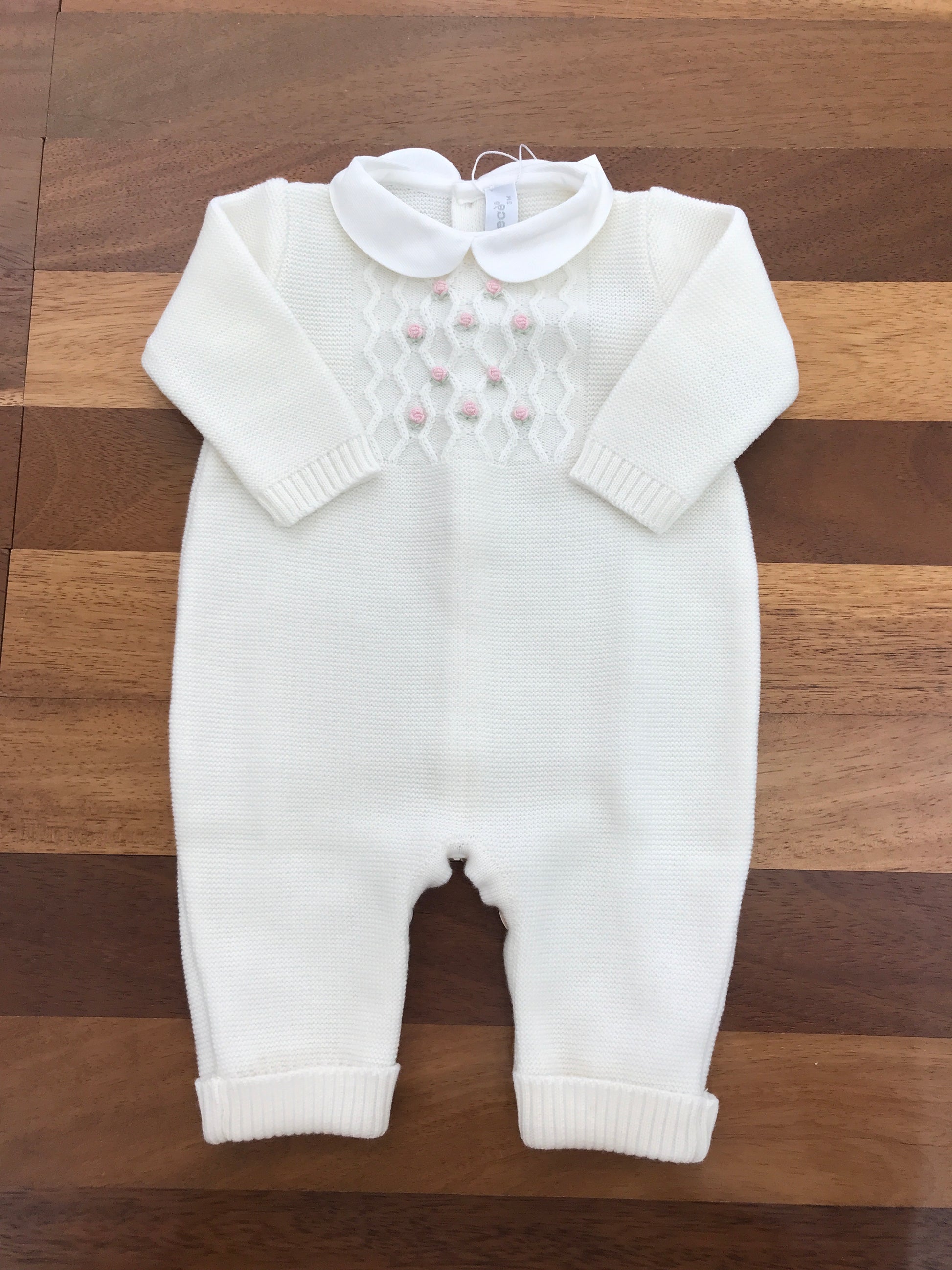 Elegante tutina in piquet bianco con collo tondo, caratterizzata da una raffinata lavorazione intrecciata e da delicate roselline ricamate a mano. Un capo che unisce semplicità e dettagli artigianali, perfetto per occasioni speciali e momenti importanti della prima infanzia.