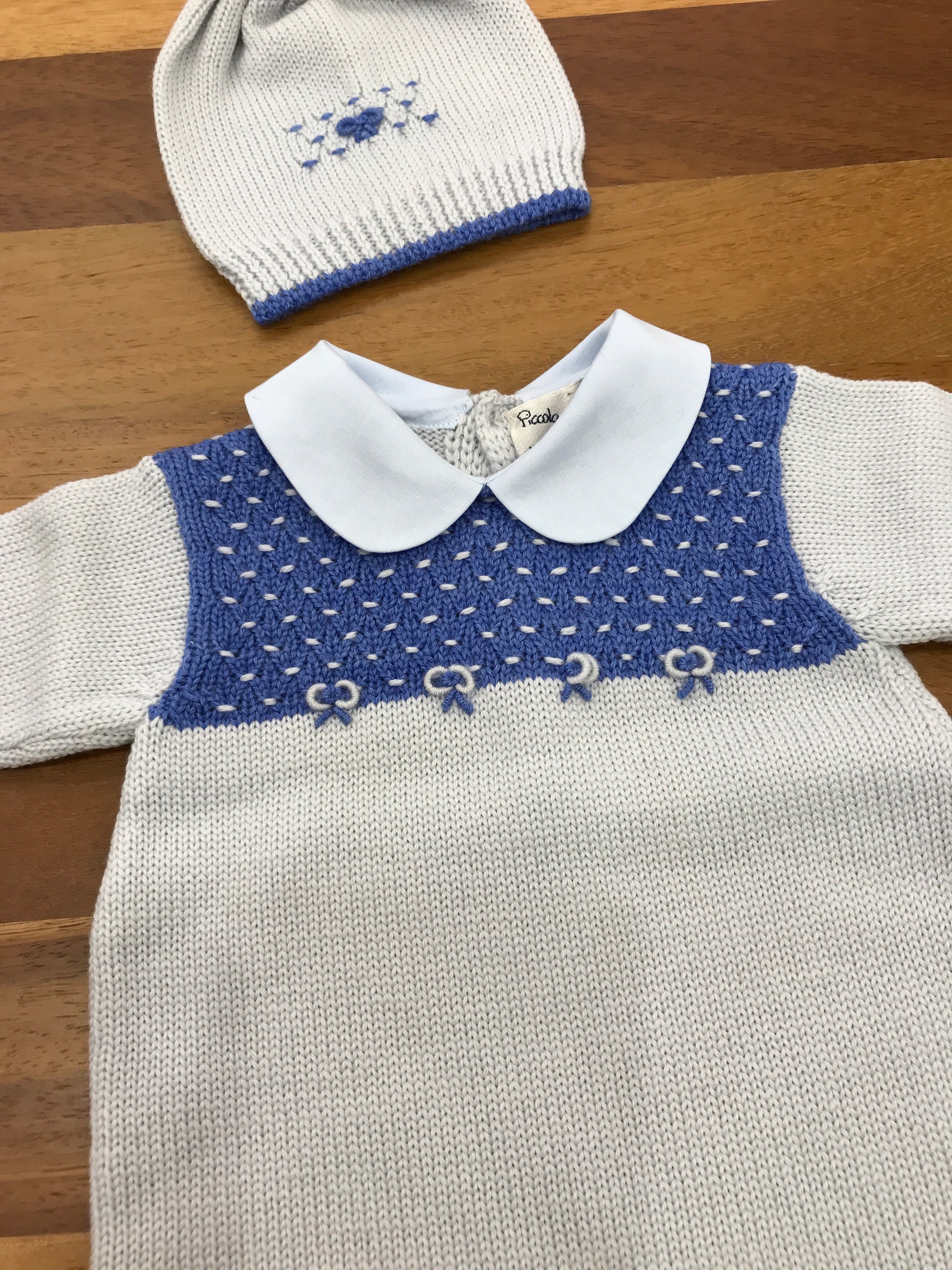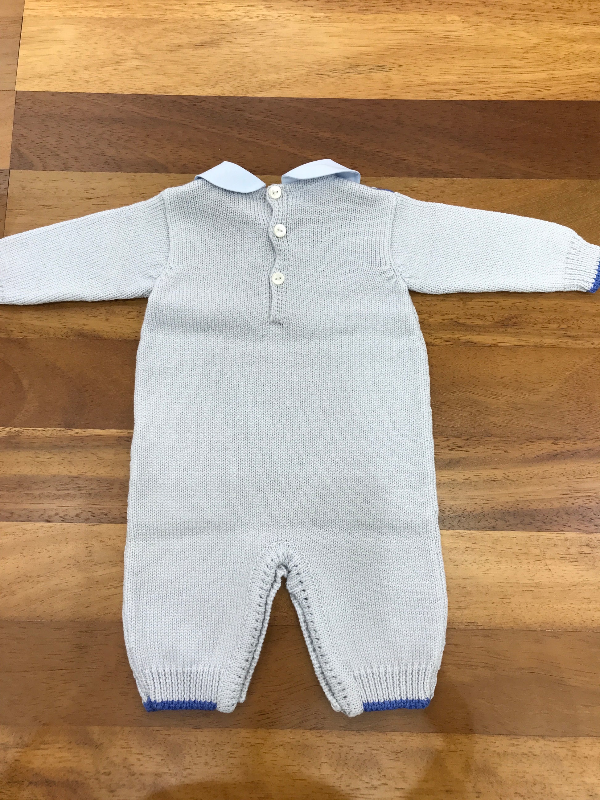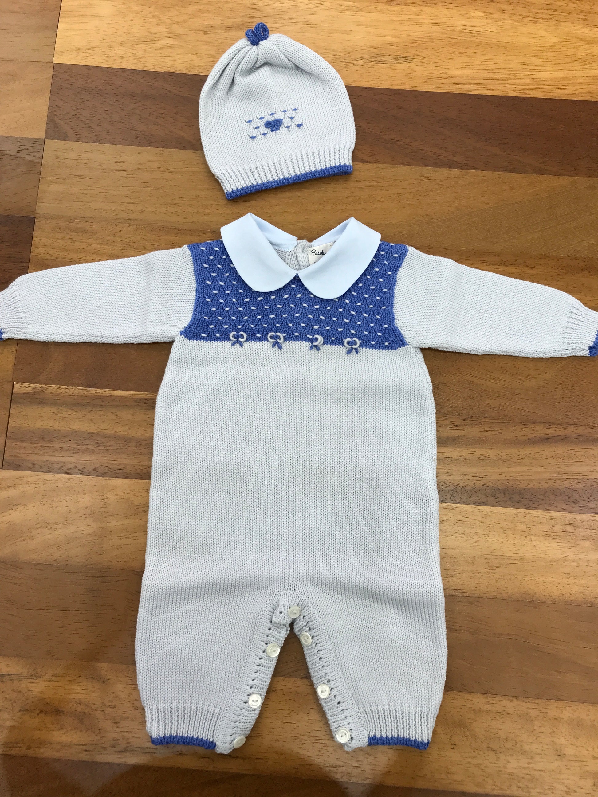Intera tutina senza piedini, caratterizzata da un corpetto finemente lavorato con punto smok e decorato a mano con delicati nodi d'amore ricamati.