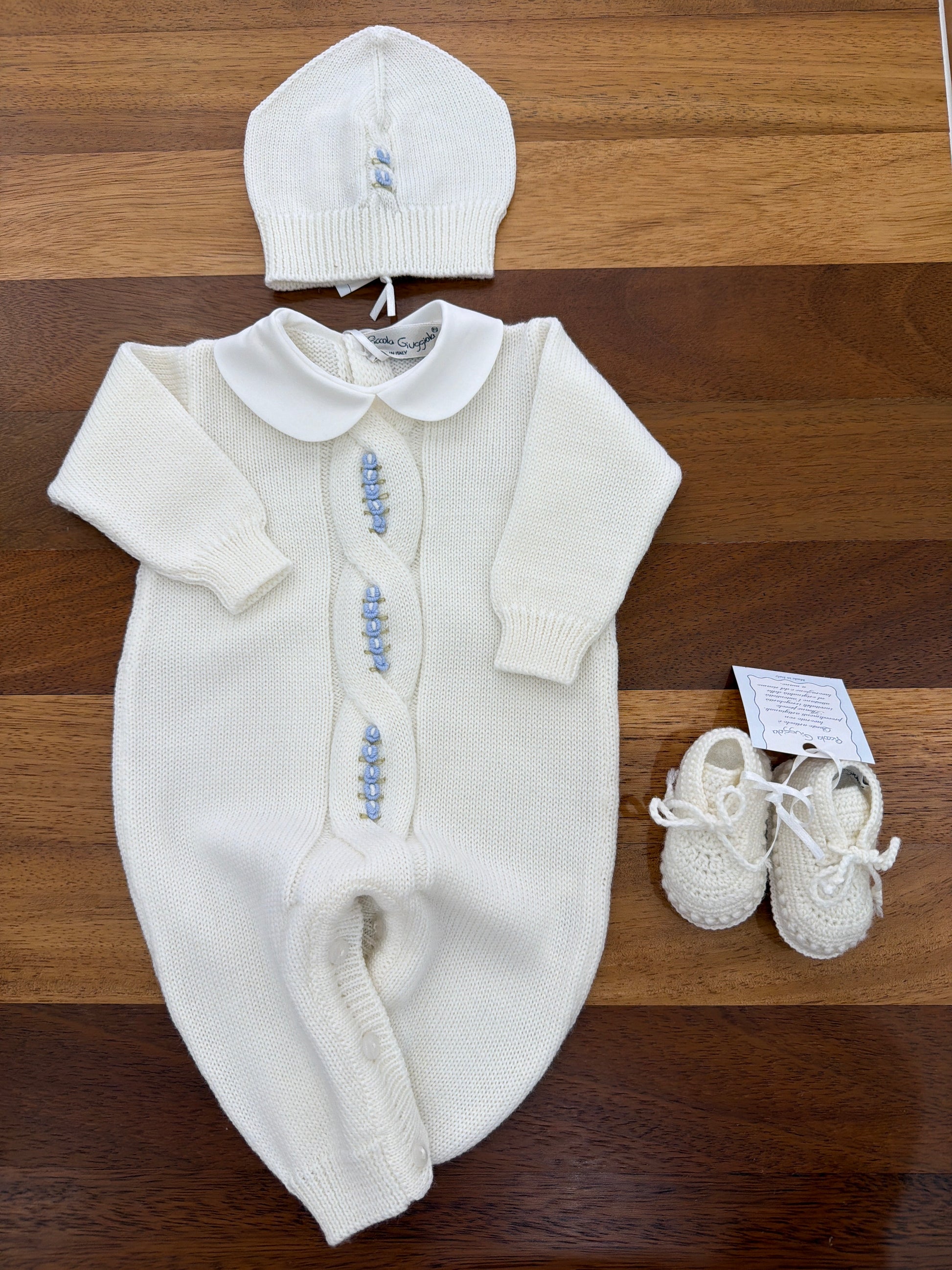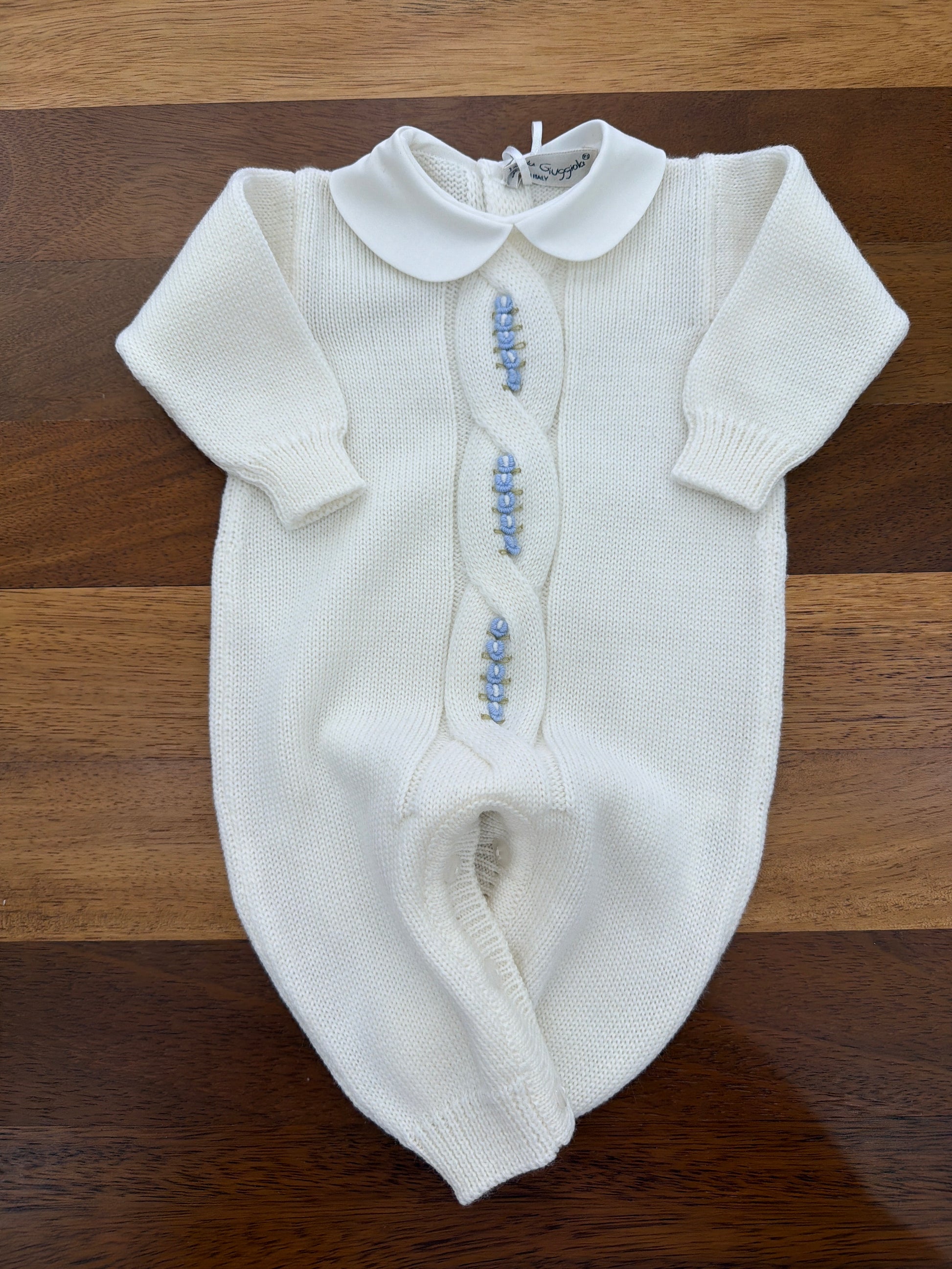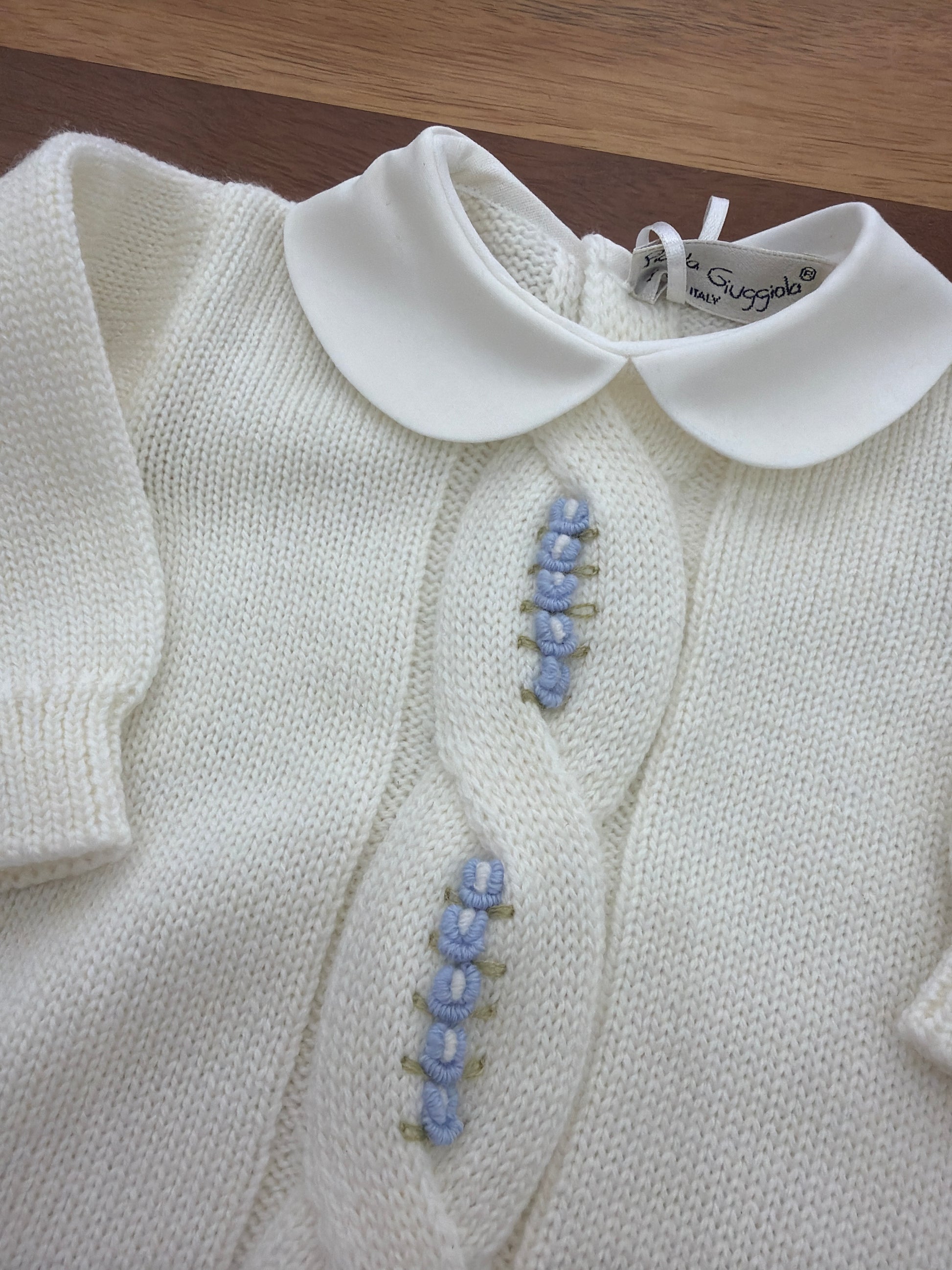 Questa tutina in lana color panna si distingue per la sua raffinata lavorazione frontale a trecce, abilmente arricchita da piccole rosette celesti posizionate lungo la treccia centrale, che conferiscono un tocco di delicatezza e raffinatezza al capo, rendendolo perfetto per chi cerca eleganza e comfort in un indumento per i più piccoli.