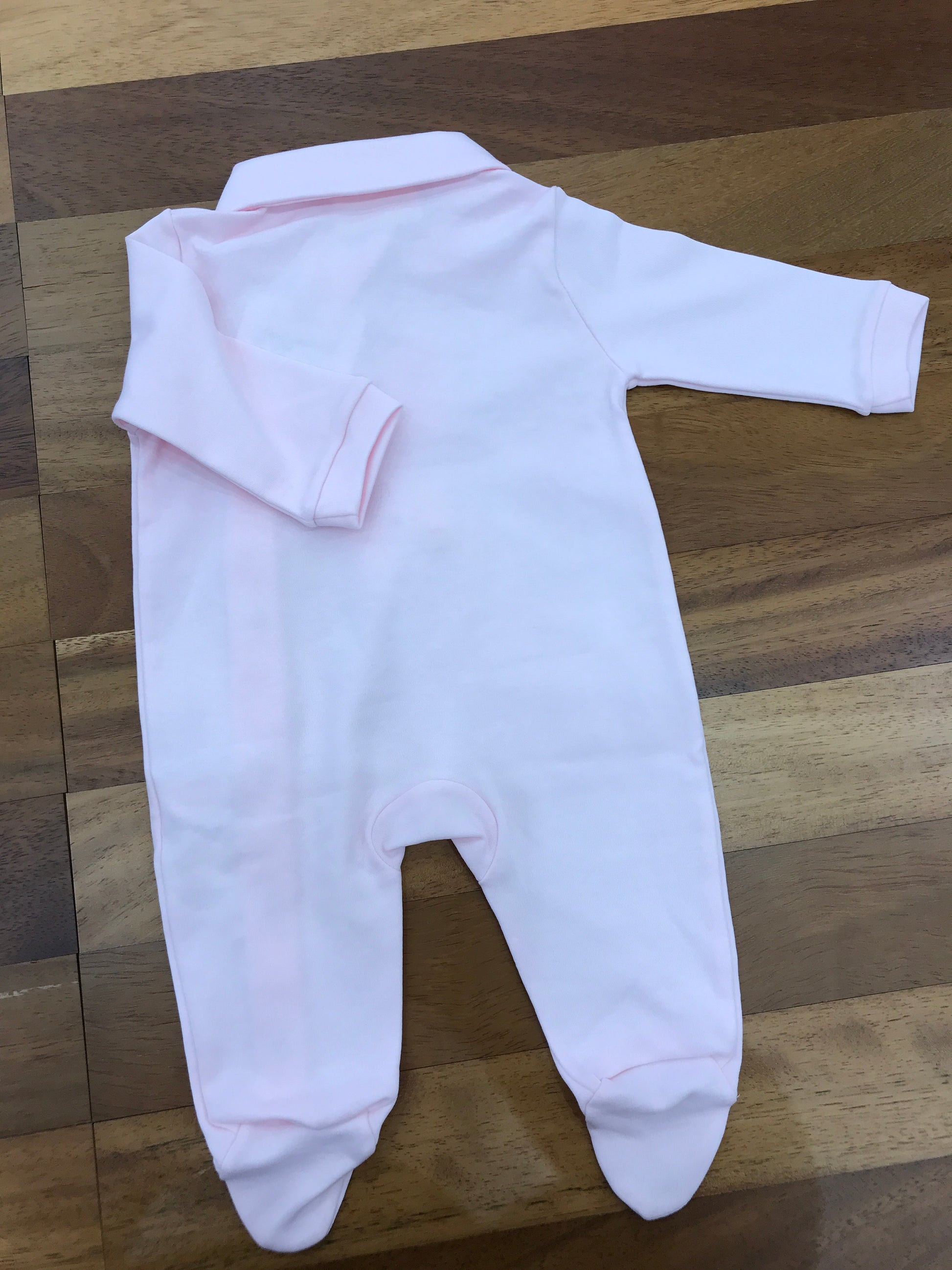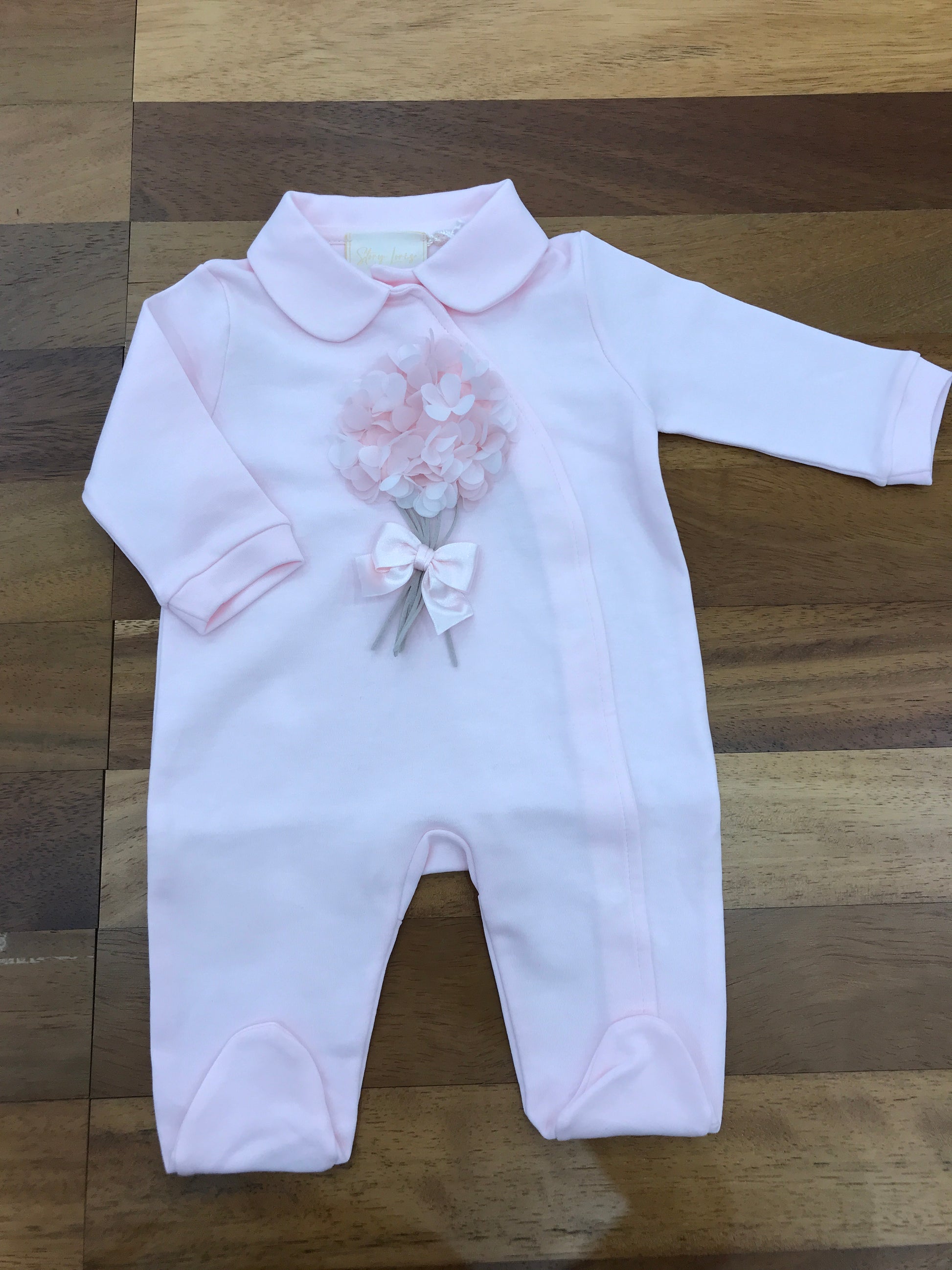 Questa tutina intera in ciniglia, completa di piedini e colletto, presenta un motivo centrale sul davanti ispirato a un mazzo di fiori.
