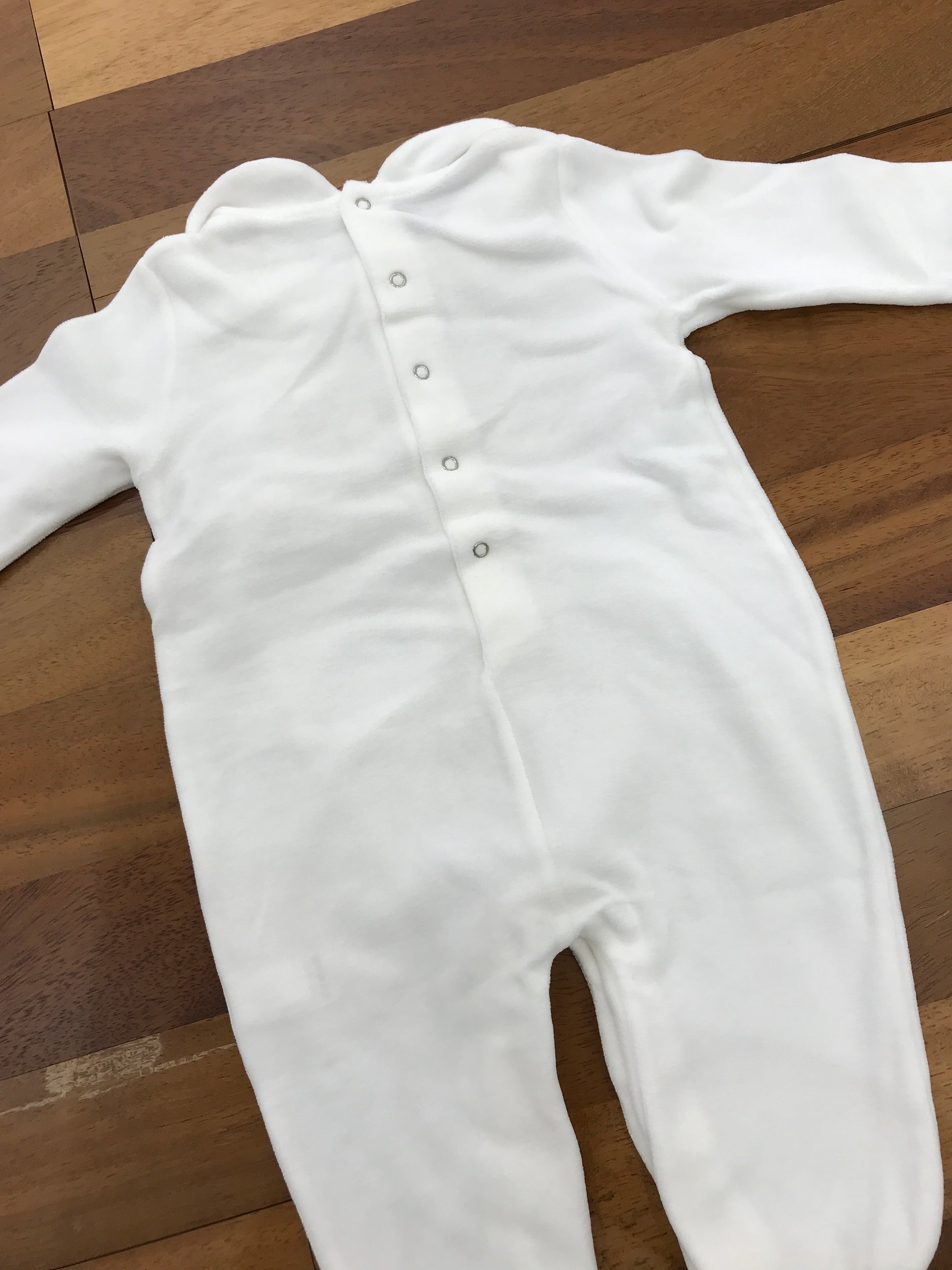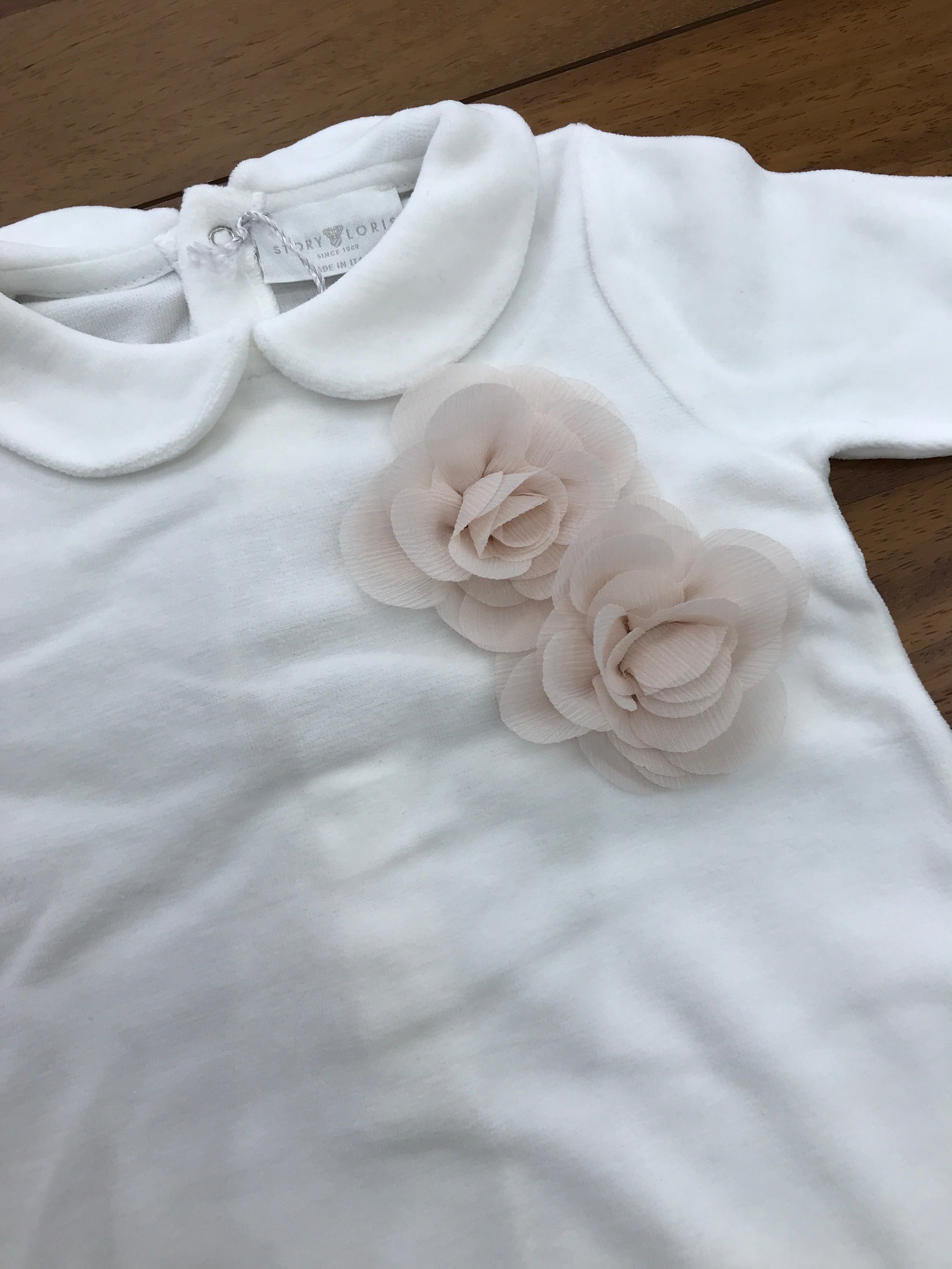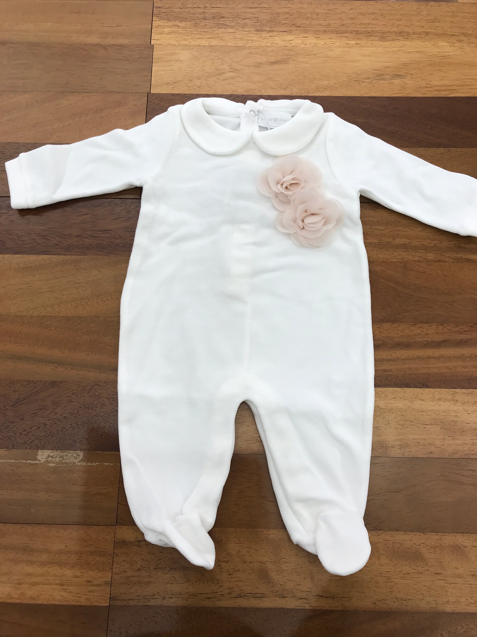 Questa tutina intera in ciniglia è dotata di piedini integrati e un delicato colletto, arricchita da due eleganti fiori color rosa antico posizionati su un lato, che conferiscono un tocco raffinato e distintivo al capo. Realizzata con materiali di alta qualità, garantisce comfort e calore ideali per i più piccoli.