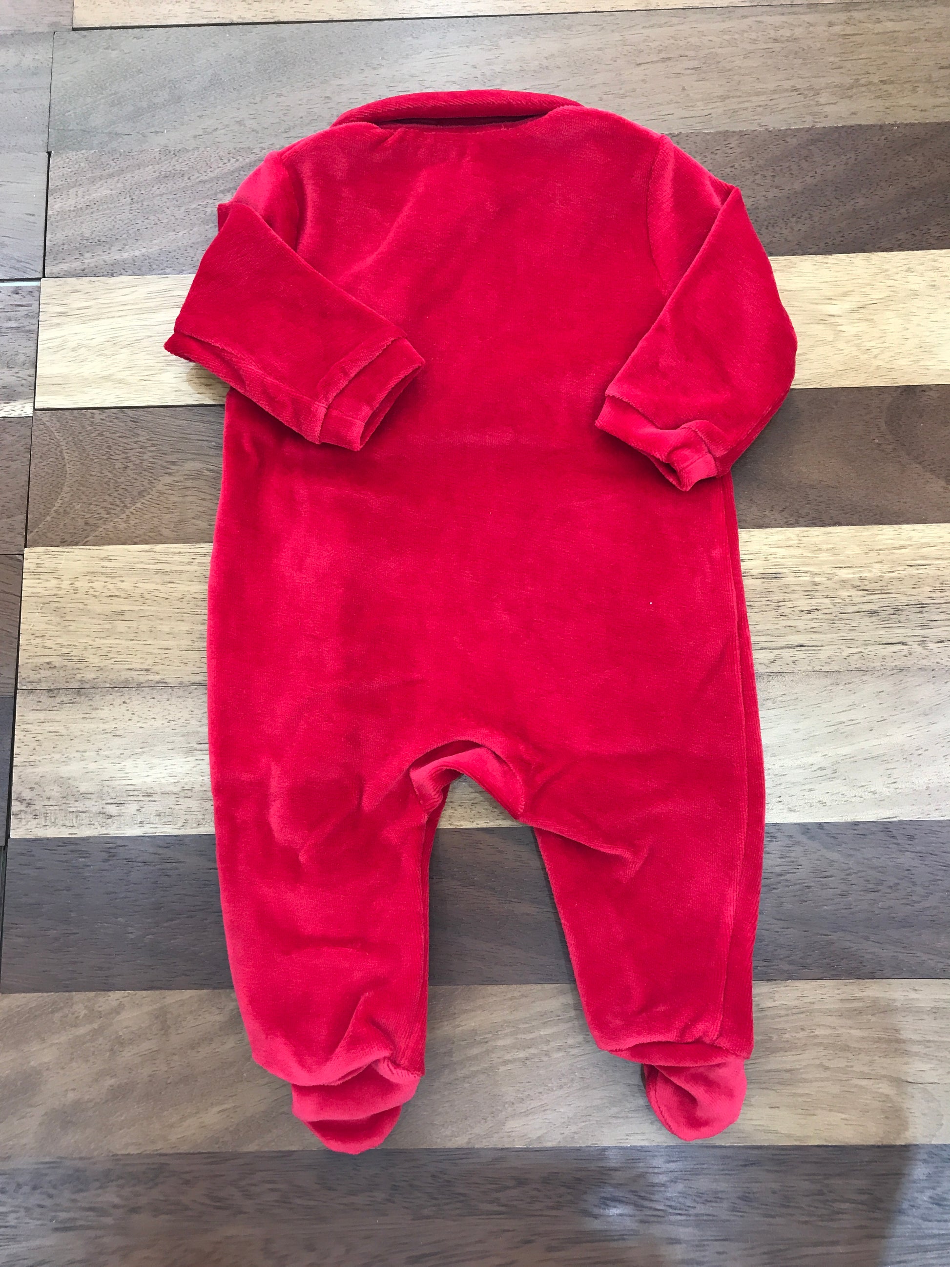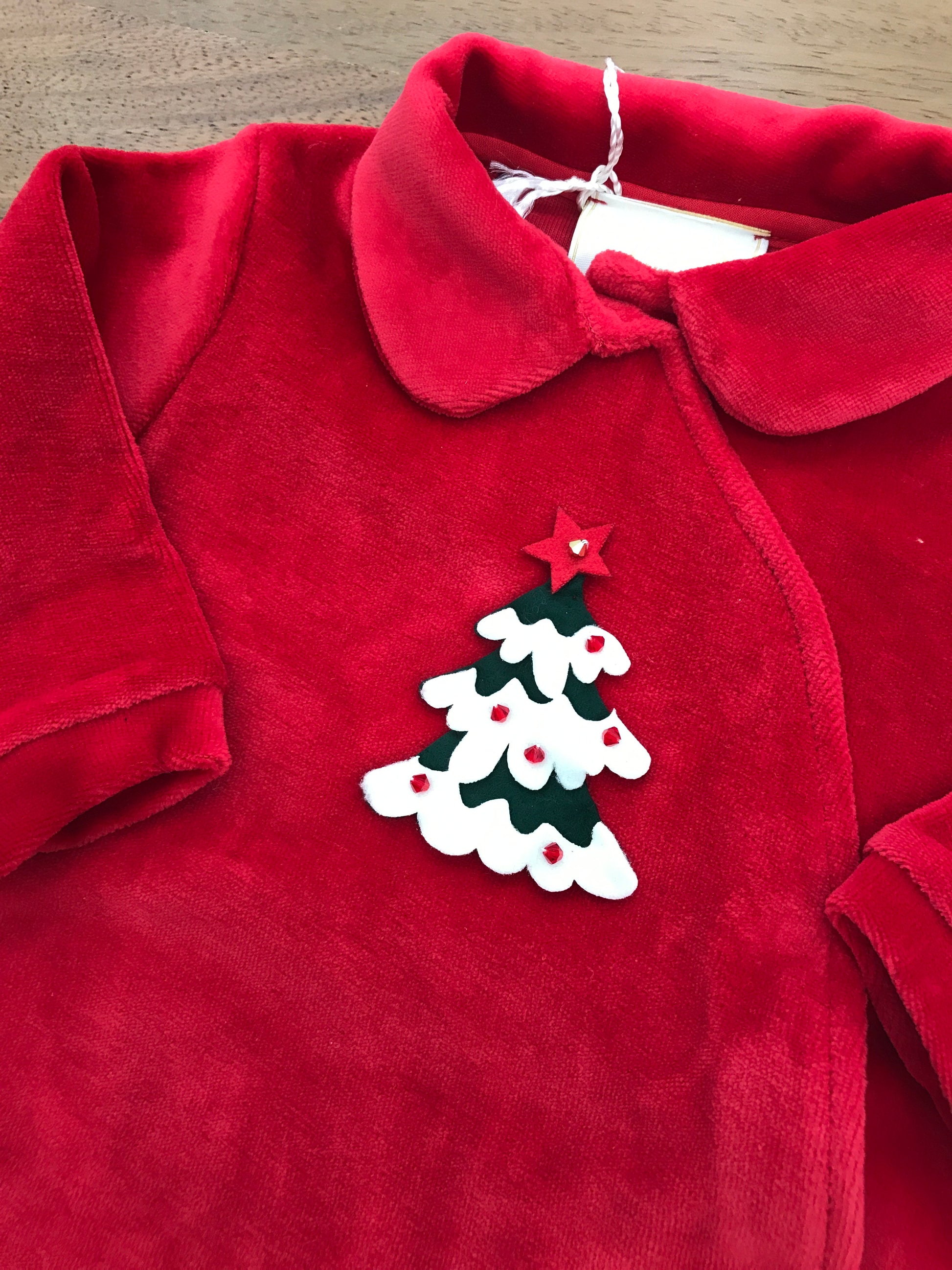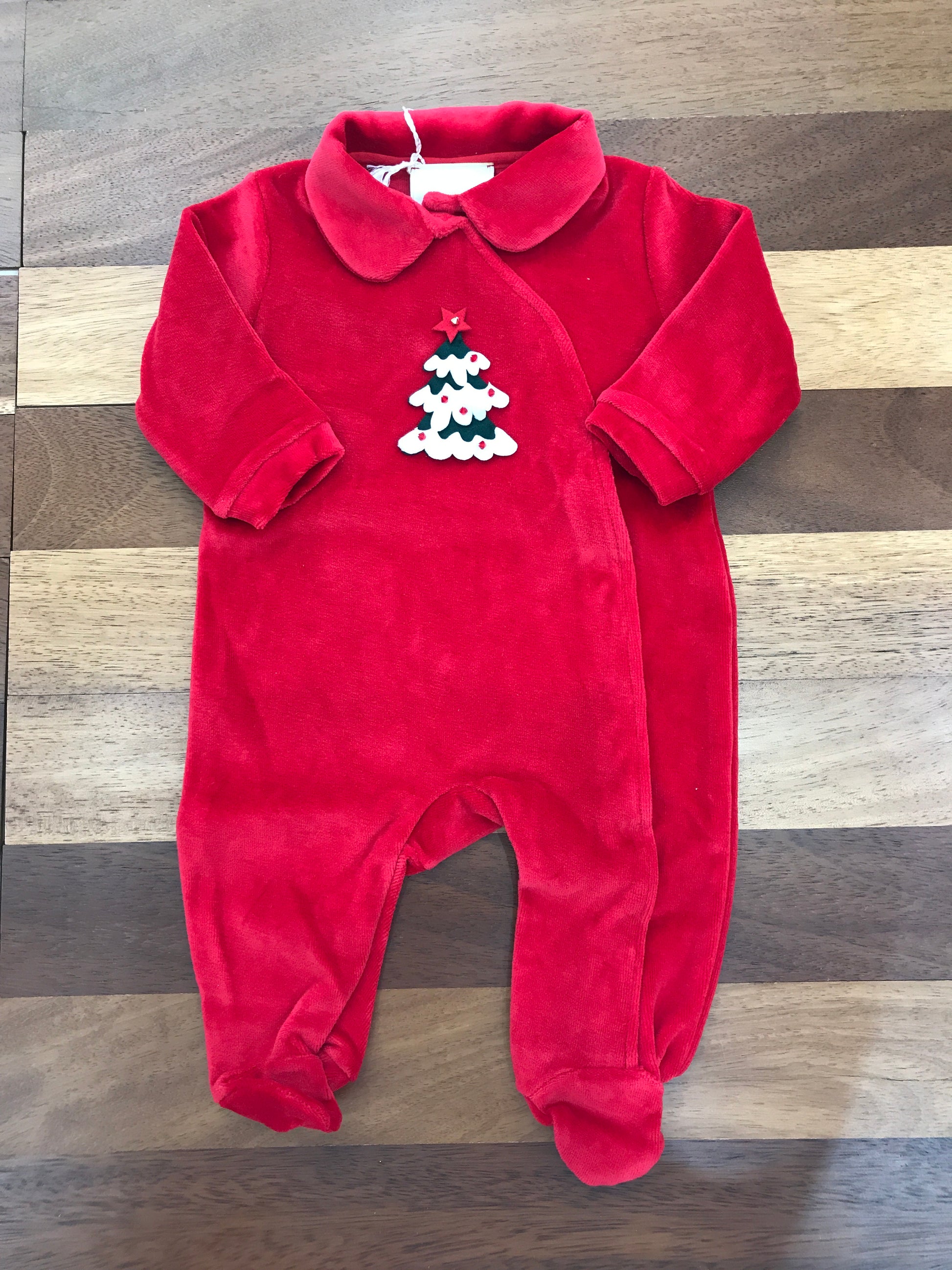 Raffinata tutina intera in morbida ciniglia rossa, arricchita da dettagli festivi che la rendono perfetta per le occasioni speciali. Caratterizzata da piedi integrati, colletto elegante e un delicato albero di Natale ricamato sul davanti. La pratica apertura laterale anteriore facilita il cambio e garantisce massimo comfort al bambino durante tutto il giorno.