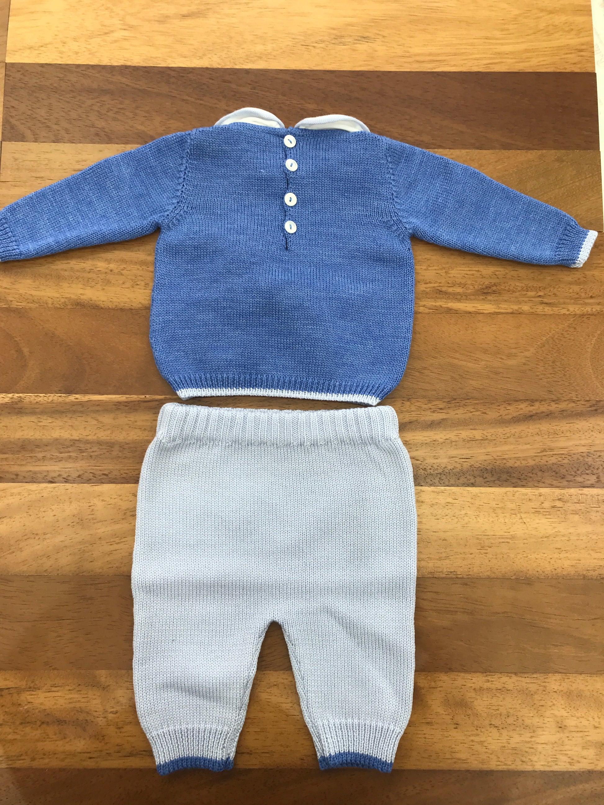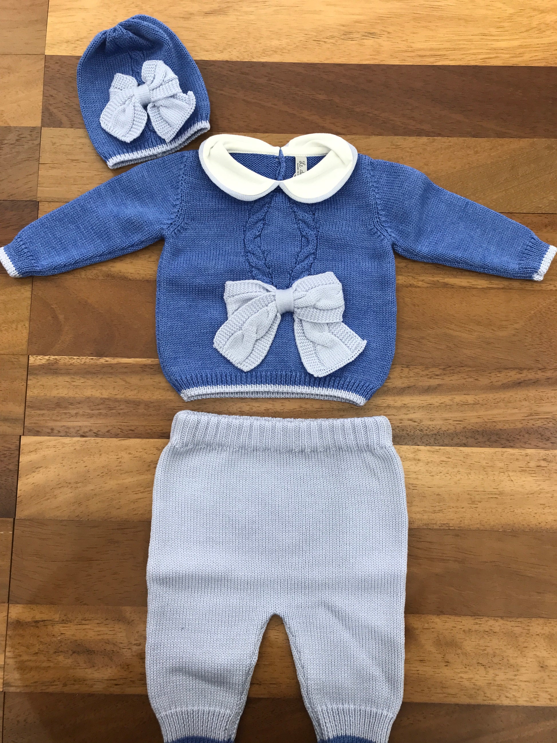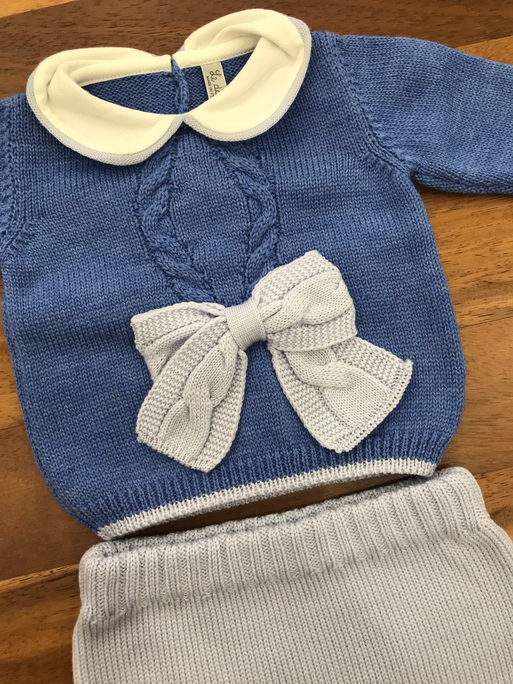 Completo due pezzi senza piedini, con collo rifinito, caratterizzato da una lavorazione a trecce sul davanti e un elegante fiocco centrale.