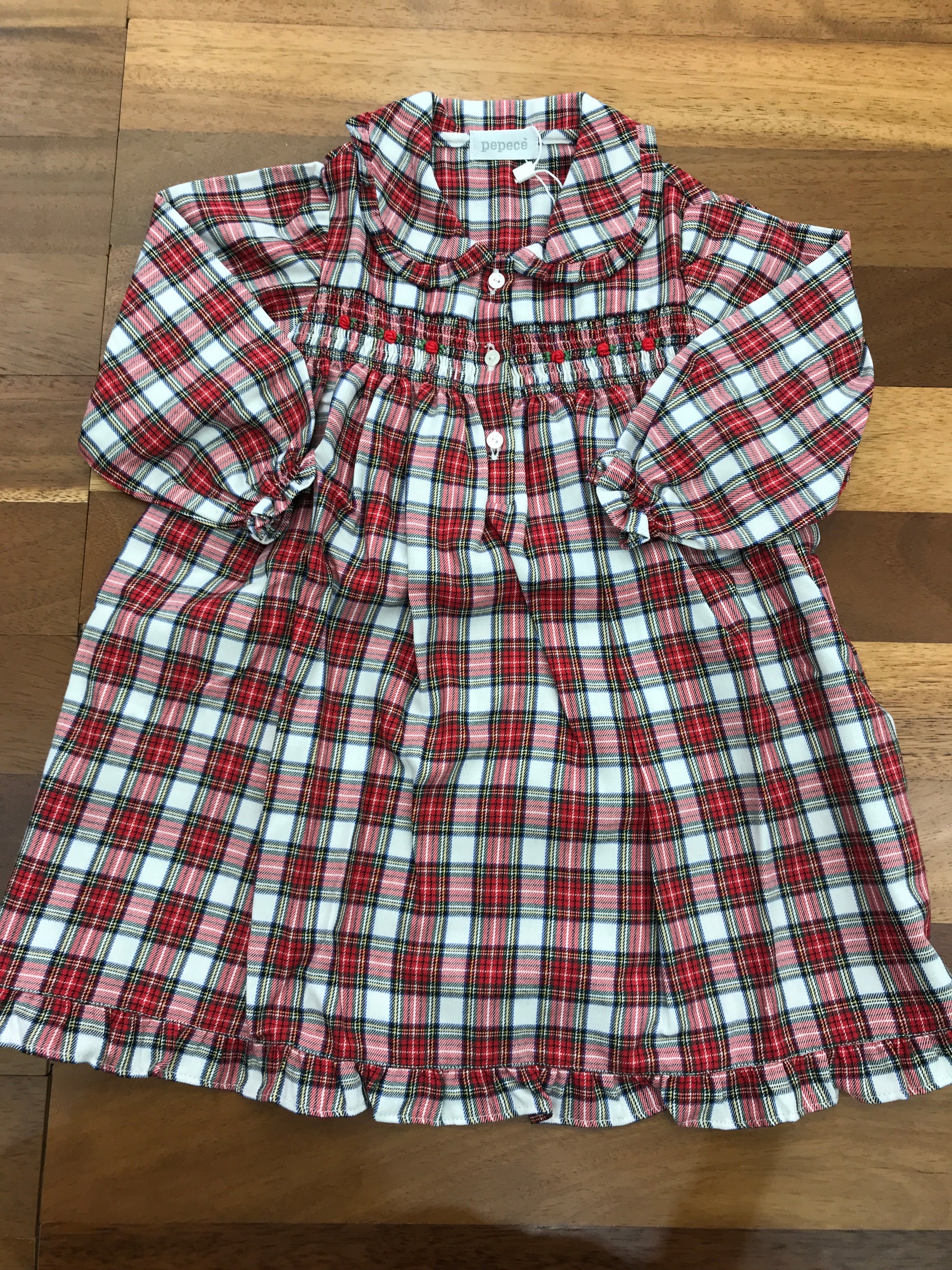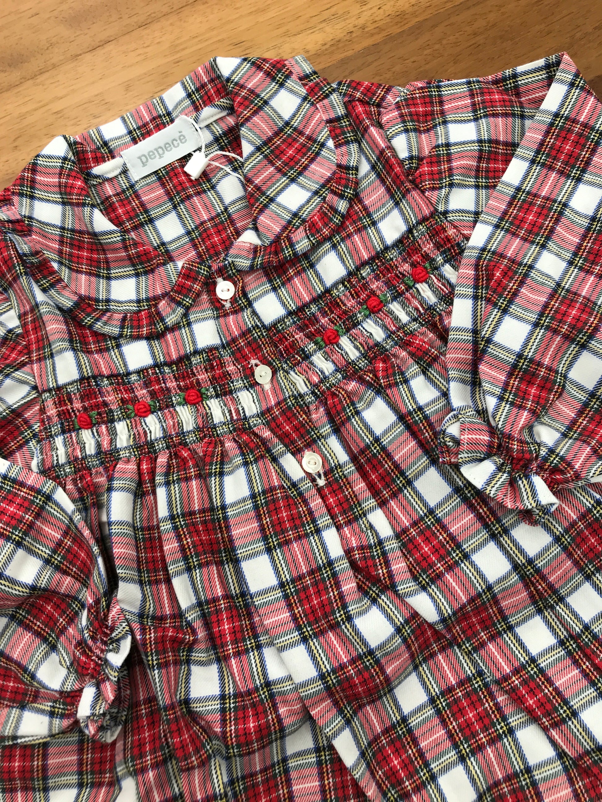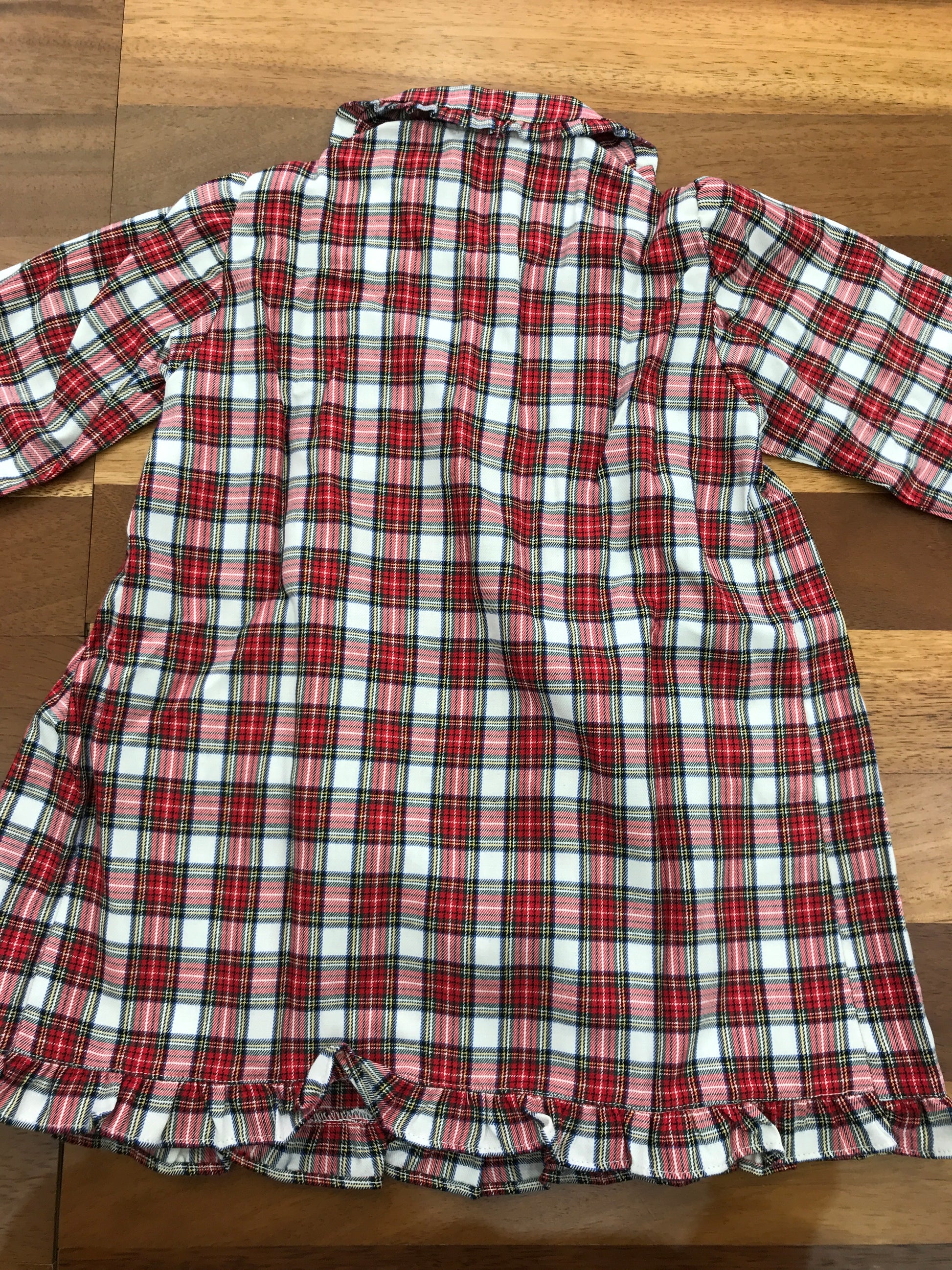 Elegante vestaglia notturna in tessuto scozzese che combina il rosso, il verde e il bianco in un design classico e raffinato. Caratterizzata da dettagli ricercati come le rusche che ornano il colletto e l'orlo inferiore, piccoli bottoncini decorativi sul petto e una pregiata lavorazione a punto smock sul davanti, arricchita da delicate rose rosse ricamate. Un capo versatile che unisce comfort e stile per le vostre serate.