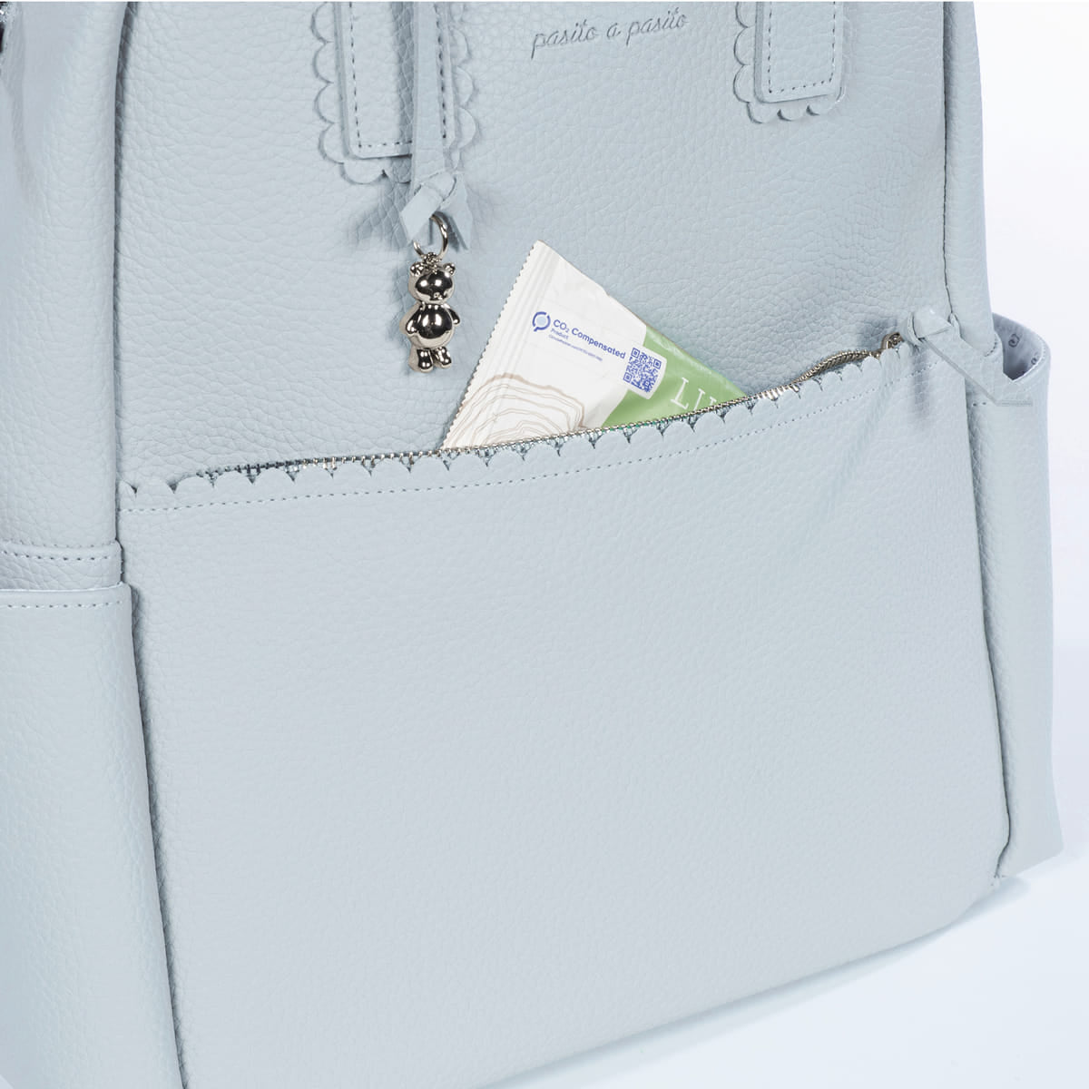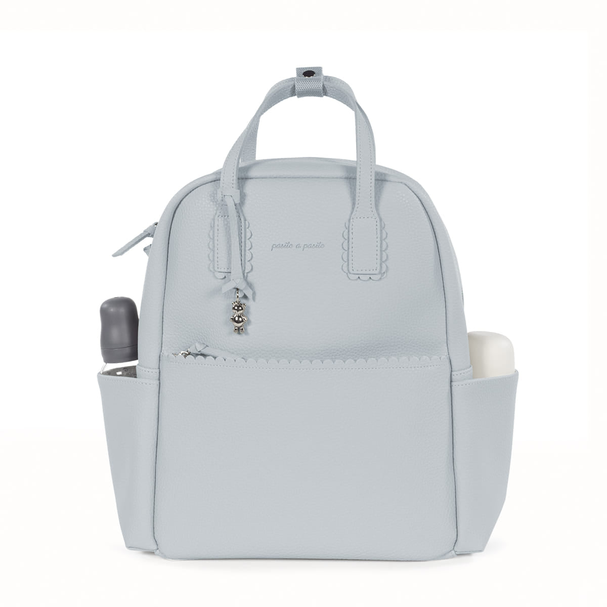 Inoltre, è dotato di due tasche laterali per bottiglie o biberon. Le cinghie regolabili consentono di indossarlo comodamente come uno zaino, ma puoi anche usarlo con le cinghie per il trasporto a mano o agganciarlo facilmente alla carrozzina grazie alle maniglie. Una pratica cinghia posteriore permette di agganciarlo alla valigia trolley, rendendo gli spostamenti ancora più facili e veloci. È realizzato con materiali privi di coloranti azoici, ftalati e sostanze nocive per la salute. Inoltre, può essere lavato a mano o in lavatrice a temperature fino a 30°. I prodotti per l’infanzia di Pasito a Pasito hanno un design molto diverso da tutti gli altri. Le loro collezioni sono caratterizzate da un lavoro dettagliato, sempre concepito da un punto di vista pratico. Utilizzano materiali di alta qualità per sottolineare l’eleganza e l’armonia di ogni loro pezzo. I nostri modelli sono esclusivi e dallo stile inconfondibile, pensati per le mamme moderne che amano il buon gusto e apprezzano i dettagli come noi. Specifiche: Materiali: Ecopelle. Colore: Blu. Misure: 35X38X16 cm.